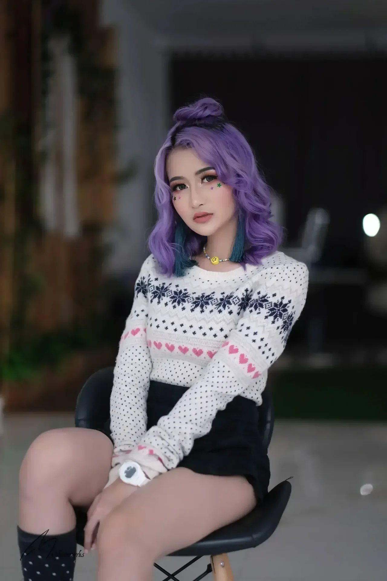 Vibrant purple-haired model in festive winter sweater and polka dot stockings poses elegantly across three unique settings.