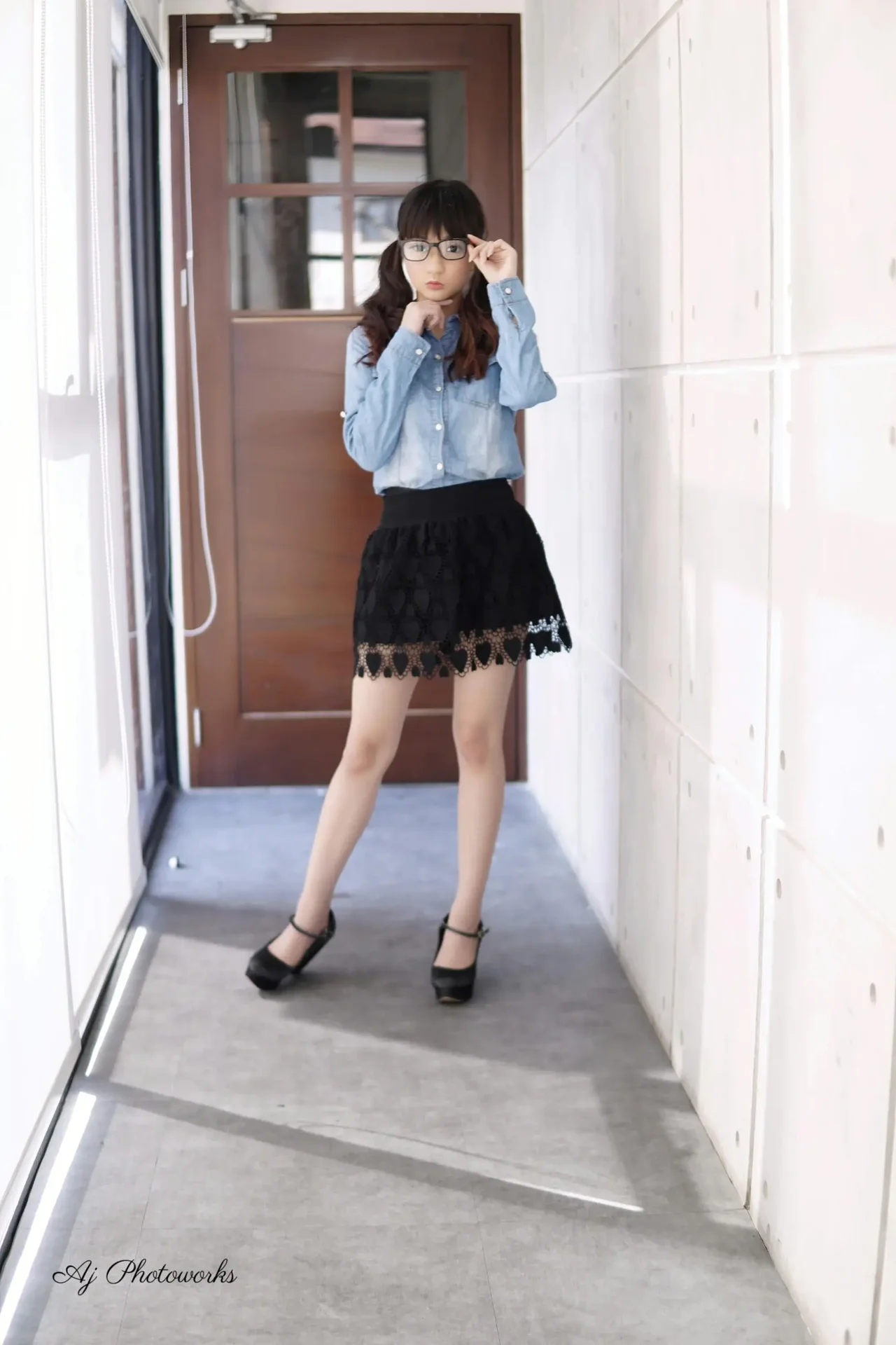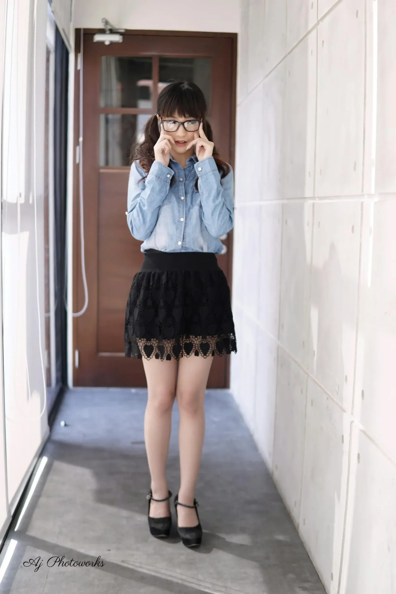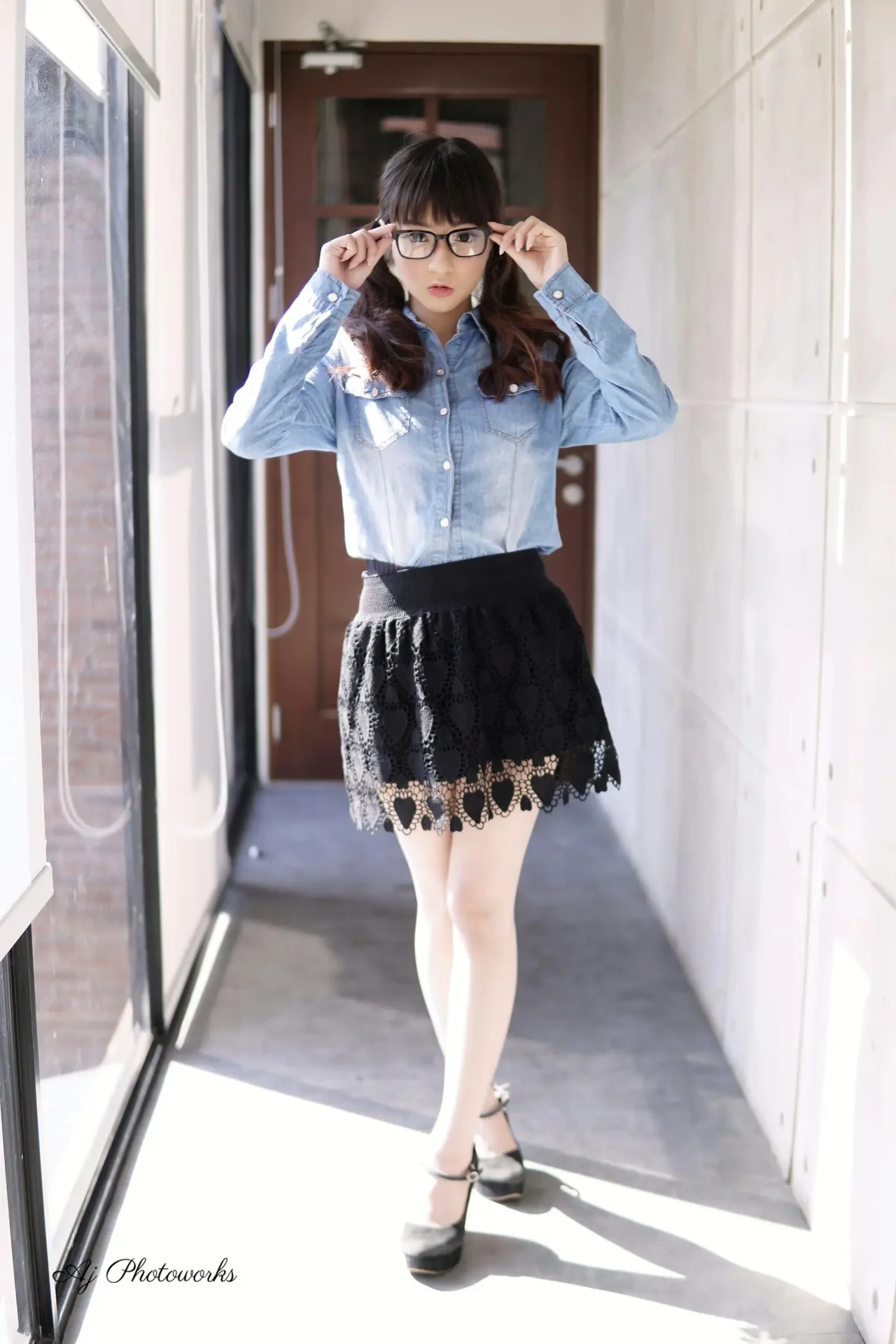 A woman in a blue denim shirt and heart-patterned lace skirt poses in a modern corridor, adjusting her hair and glasses.