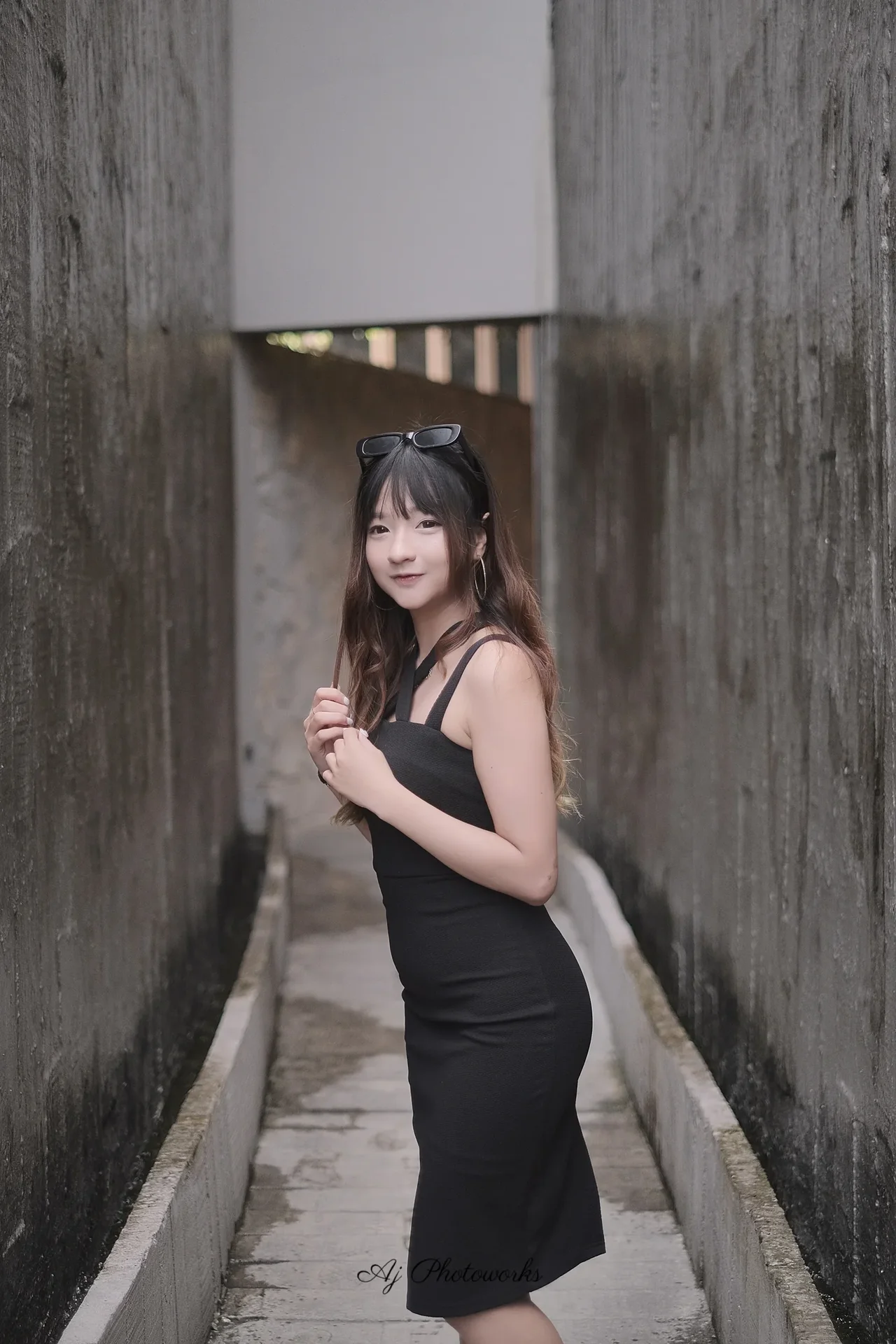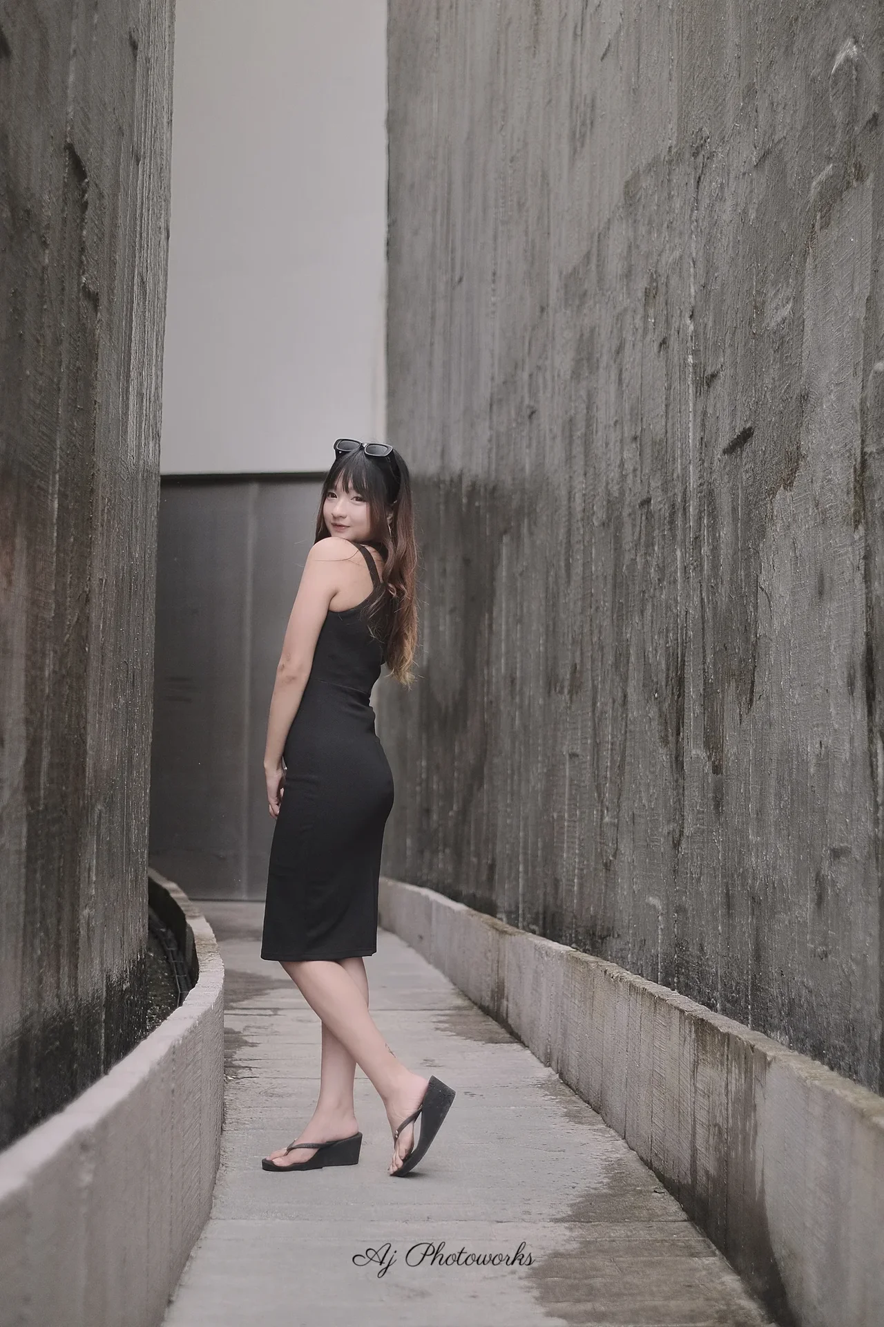 Elegance in monochrome: A fashion-forward exploration of texture, light, and structure through minimalist black dresses against industrial and textured backdrops.
