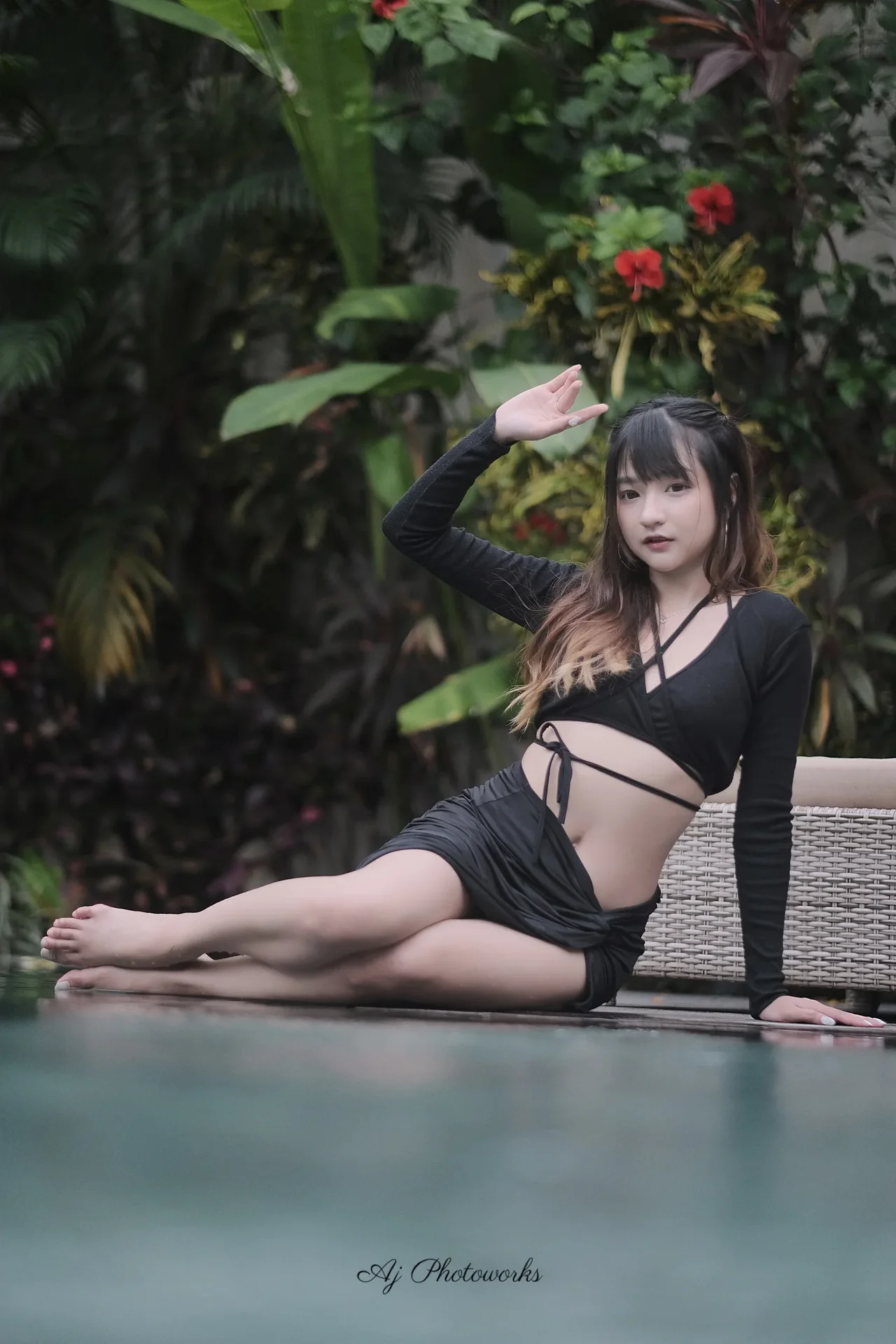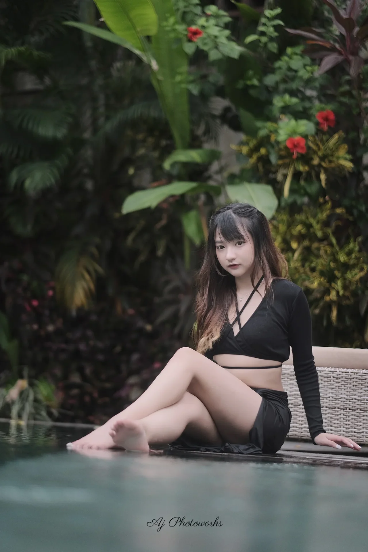 A woman in a black mesh bikini top and skirt lounges poolside, surrounded by lush tropical foliage and vibrant red flowers, her pose celebrated by the serene setting.
