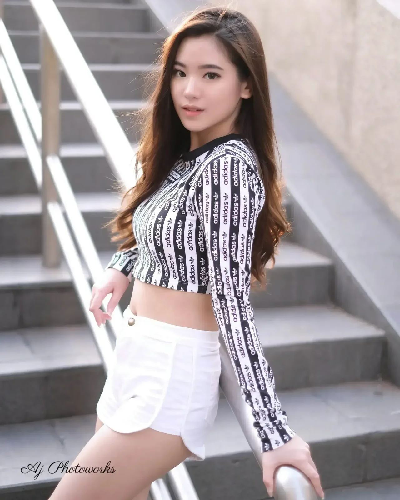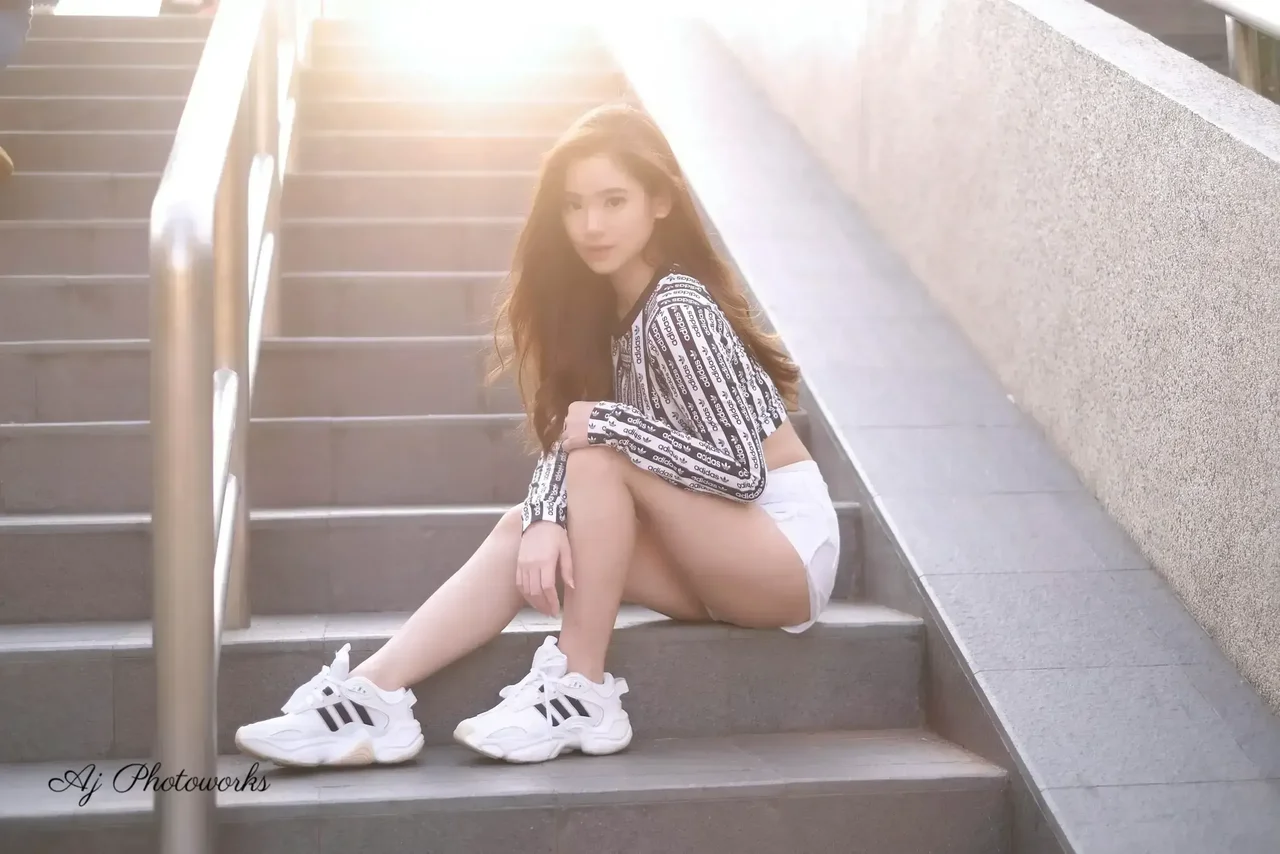 A stylish urban portrait showcasing a model in Adidas-inspired fashion on concrete stairs, blending modern textures and natural light.