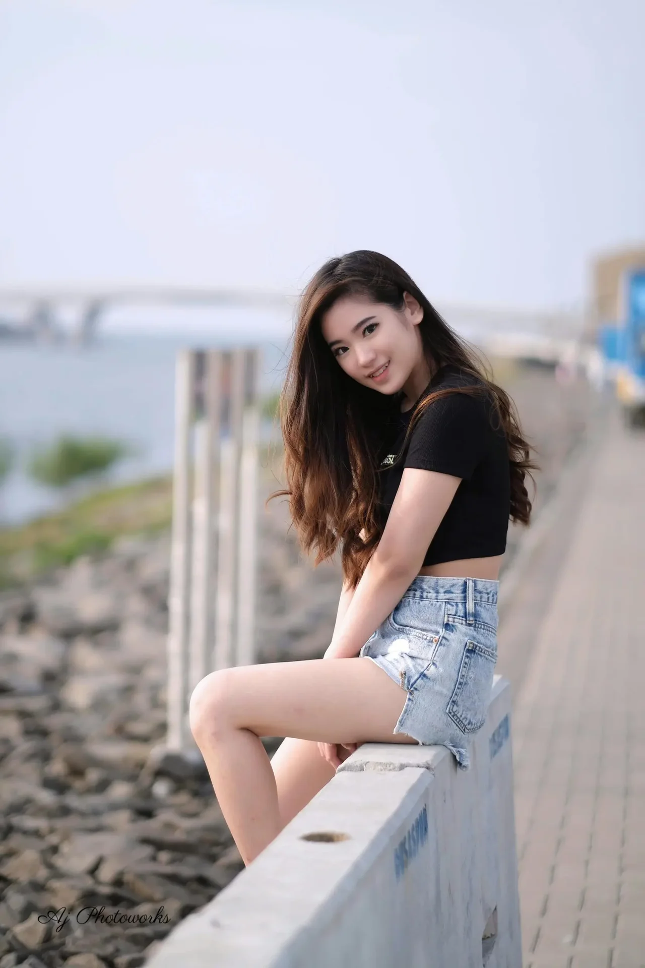 A confident young woman poses against an urban waterfront backdrop, blending casual street style with natural lighting.
