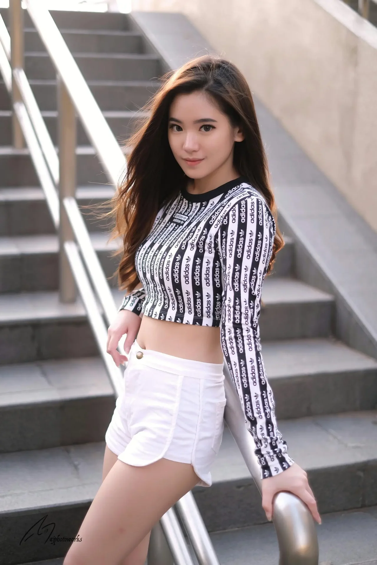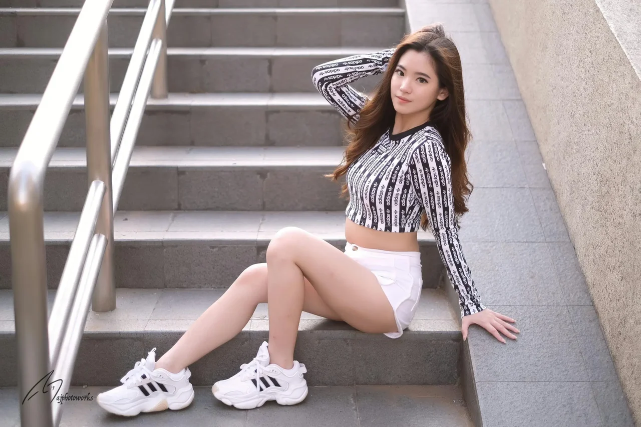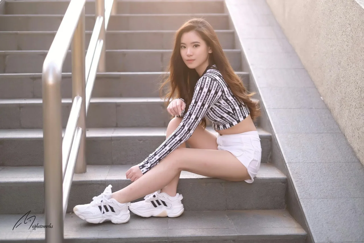 A dynamic fashion portrait capturing modern street style against the urban backdrop of concrete stairs infused with natural light.