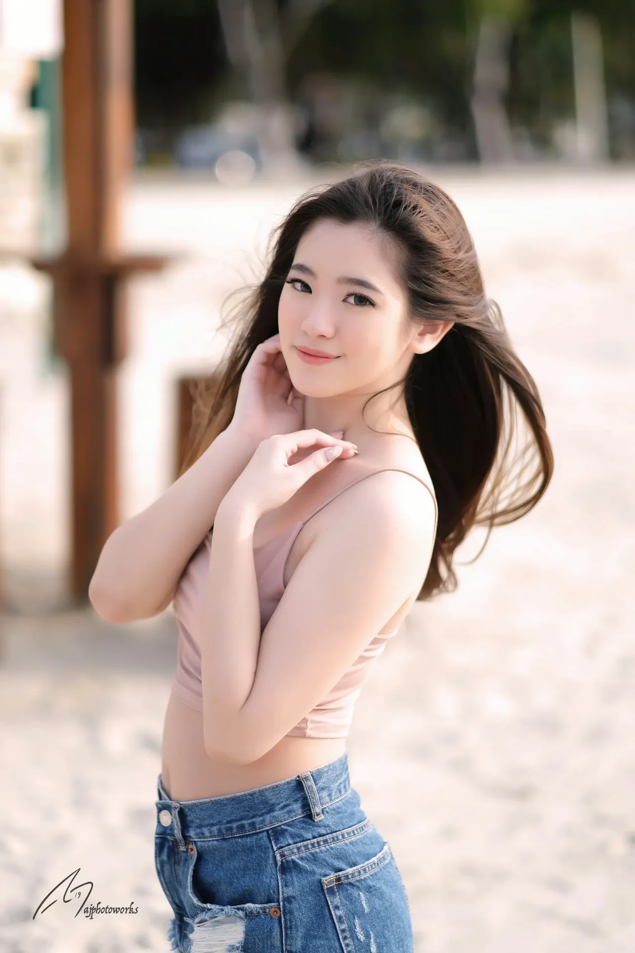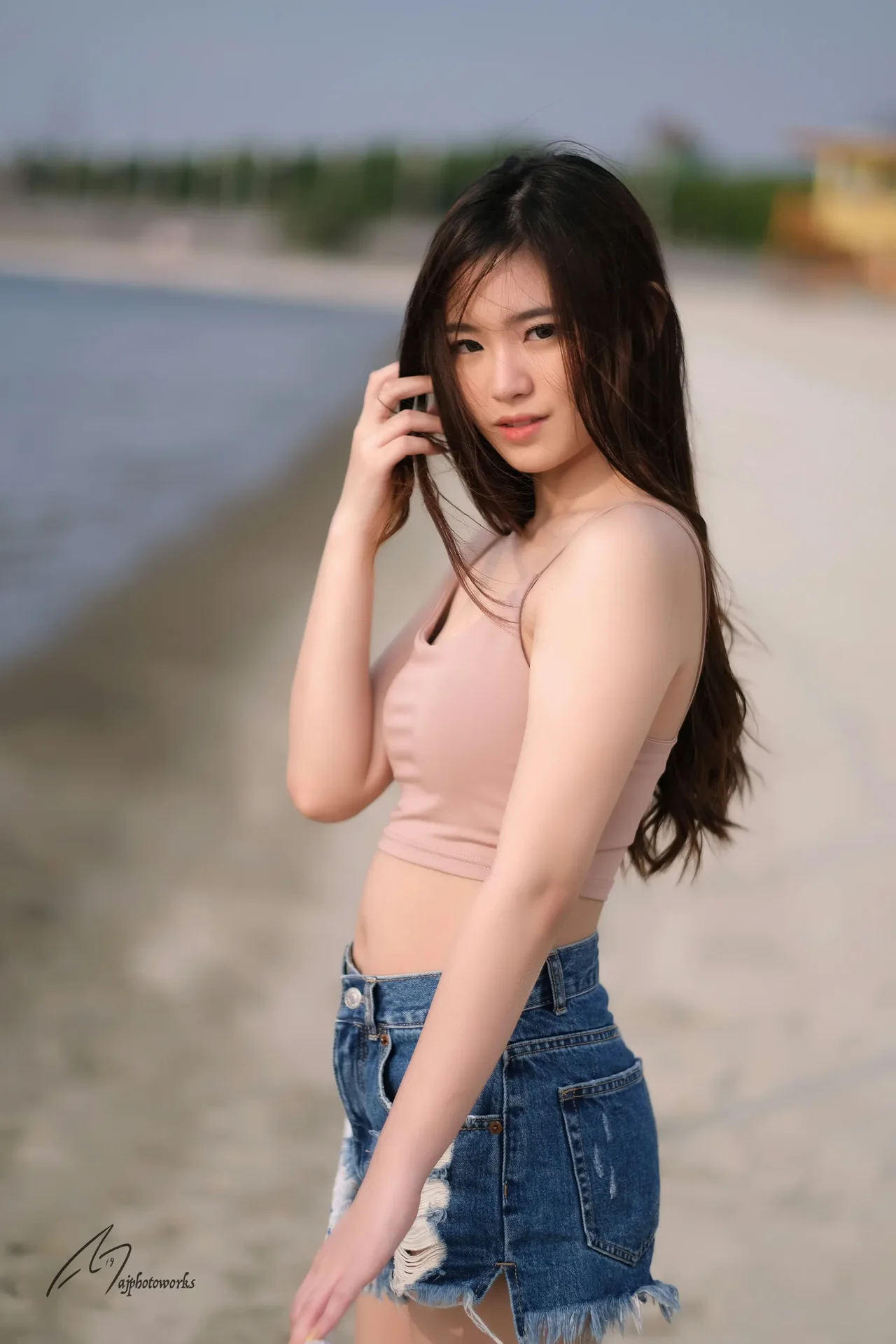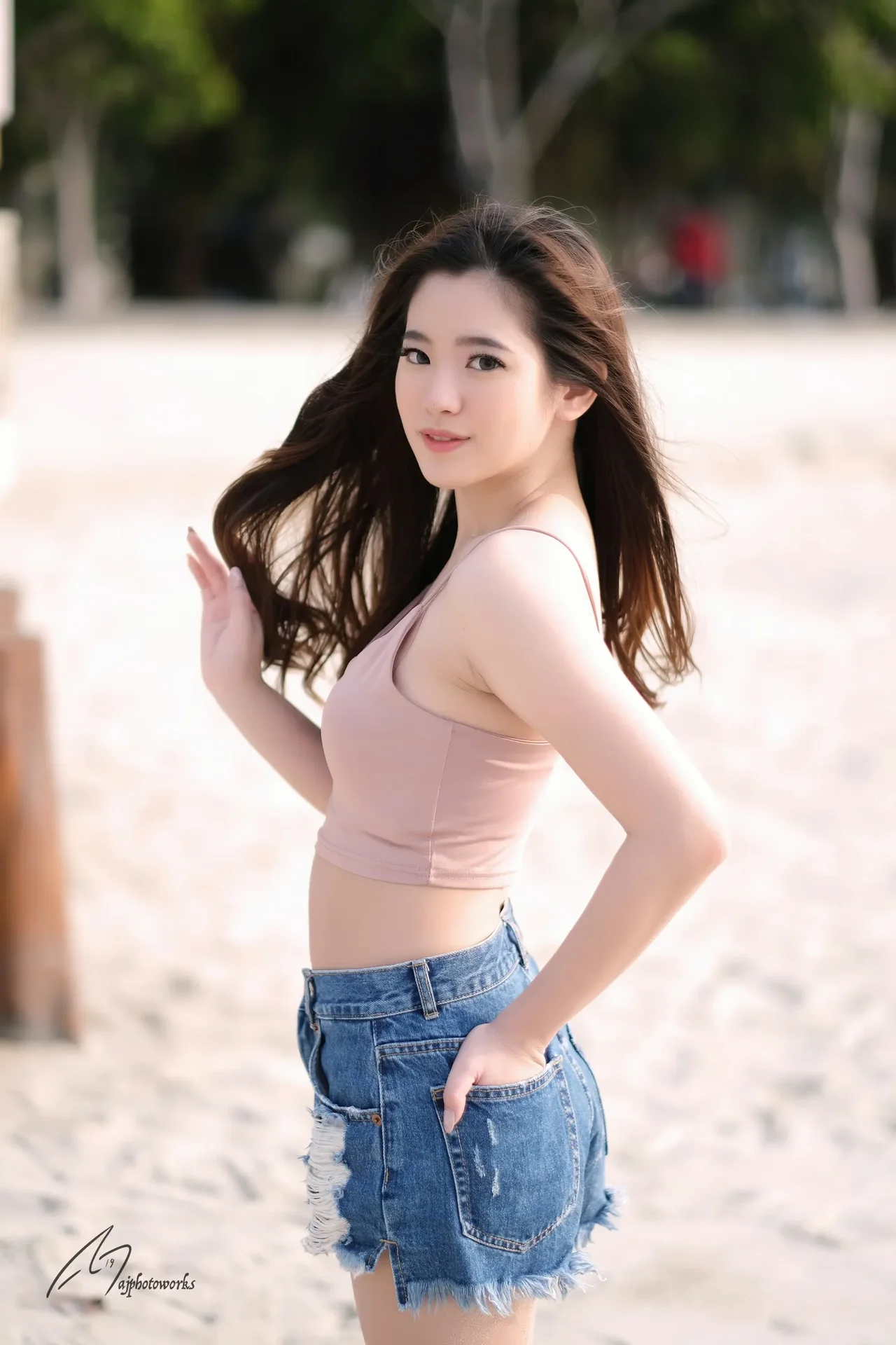 A young woman exudes summer charm in a relaxed pink and denim ensemble against a sunlit beach backdrop, blending casual elegance with playful coastal vibes.