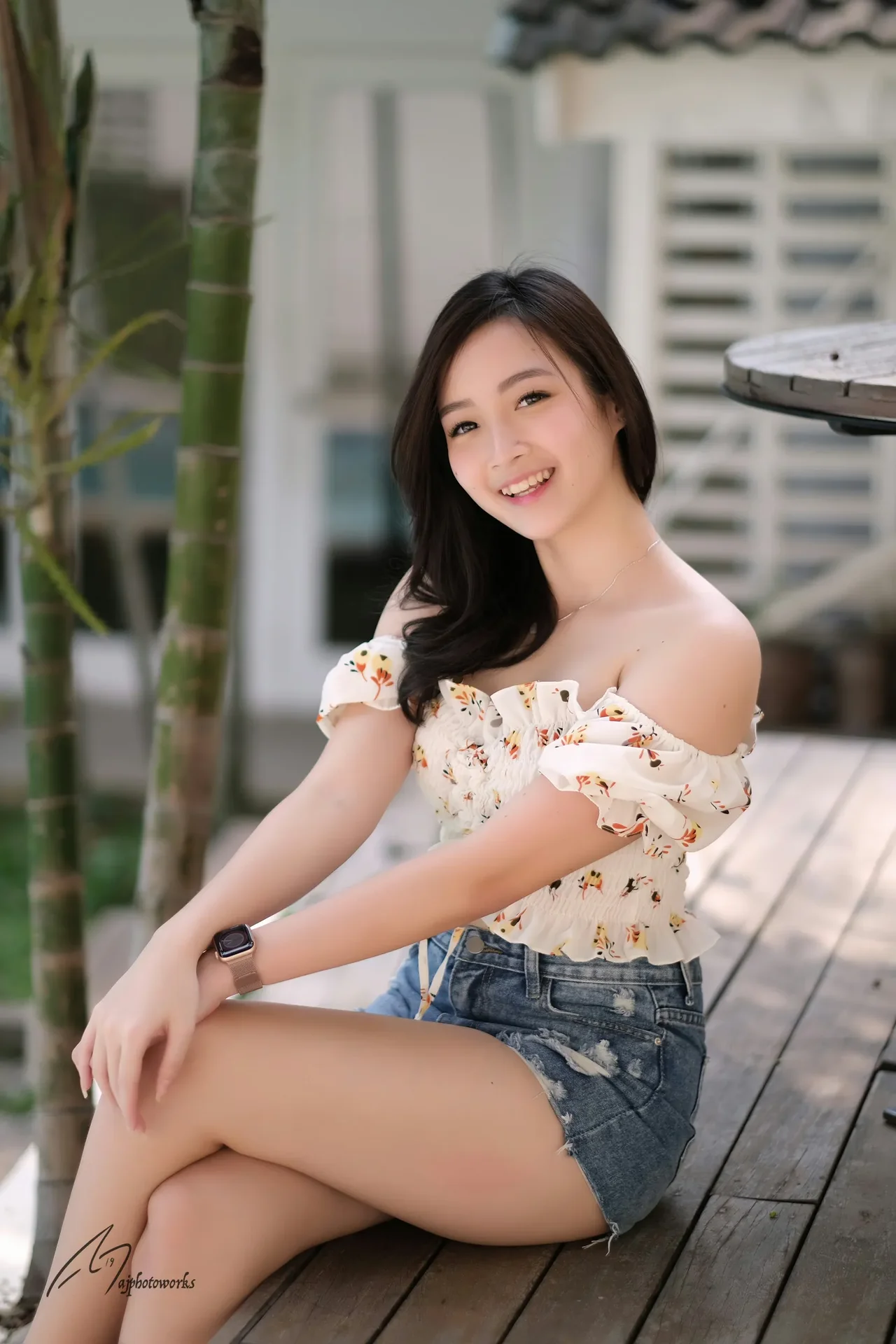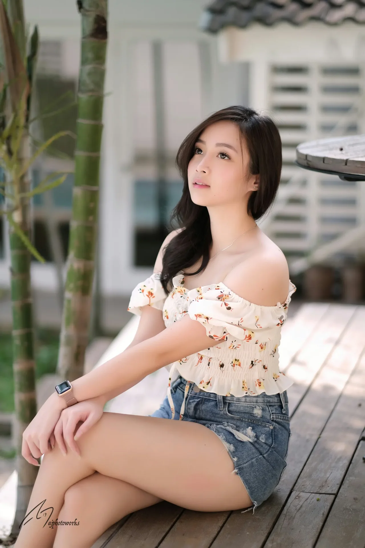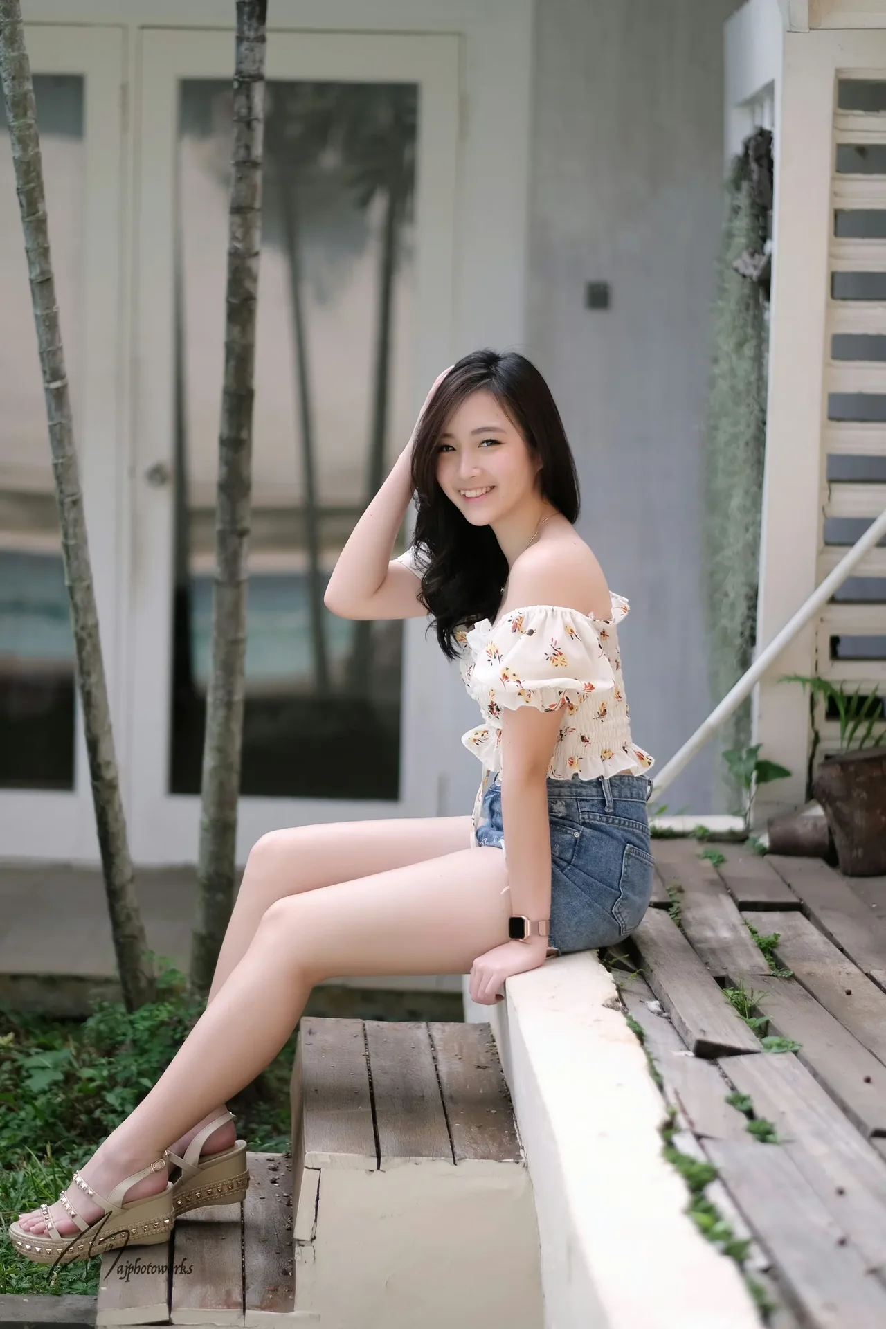 A blend of nature and urban chic defines this relaxed fashion portrait, capturing contemporary style against a serene backdrop.