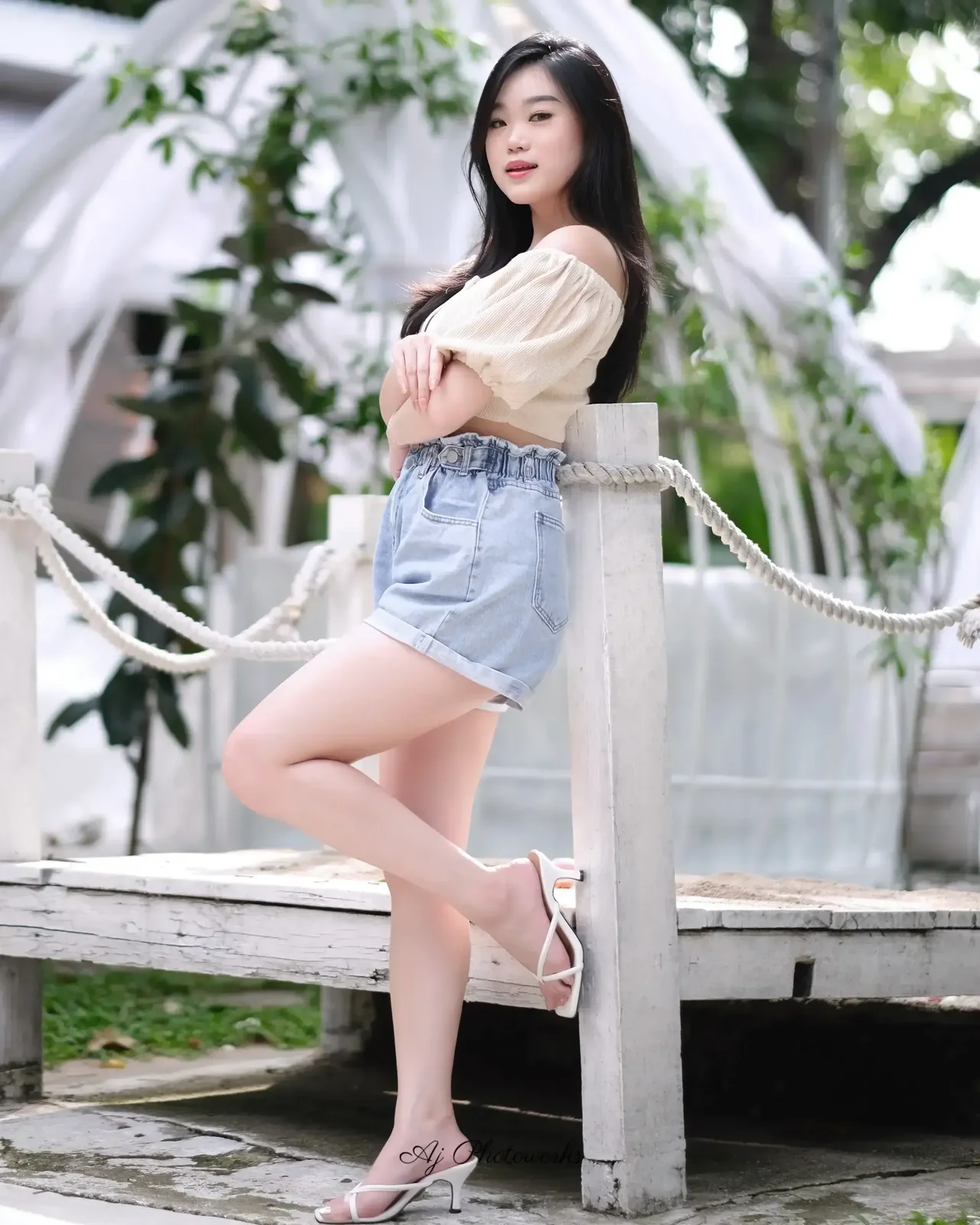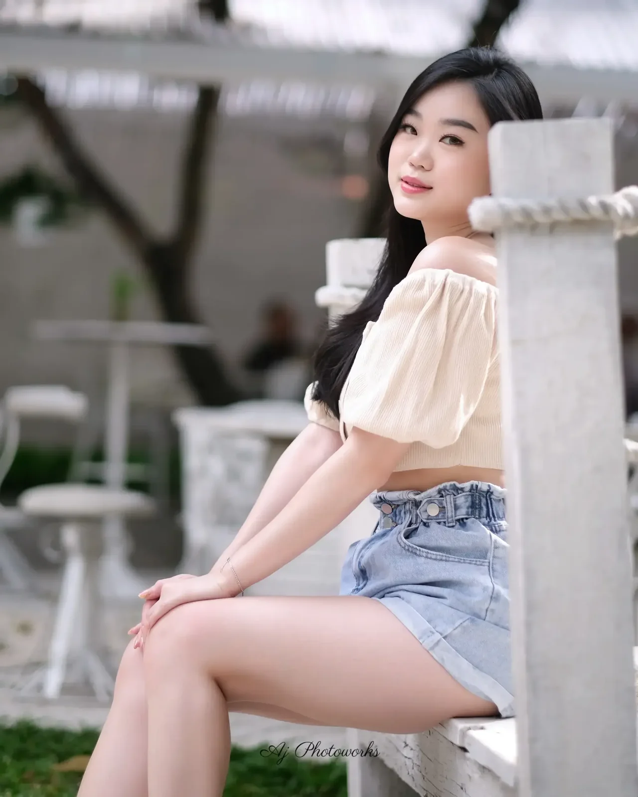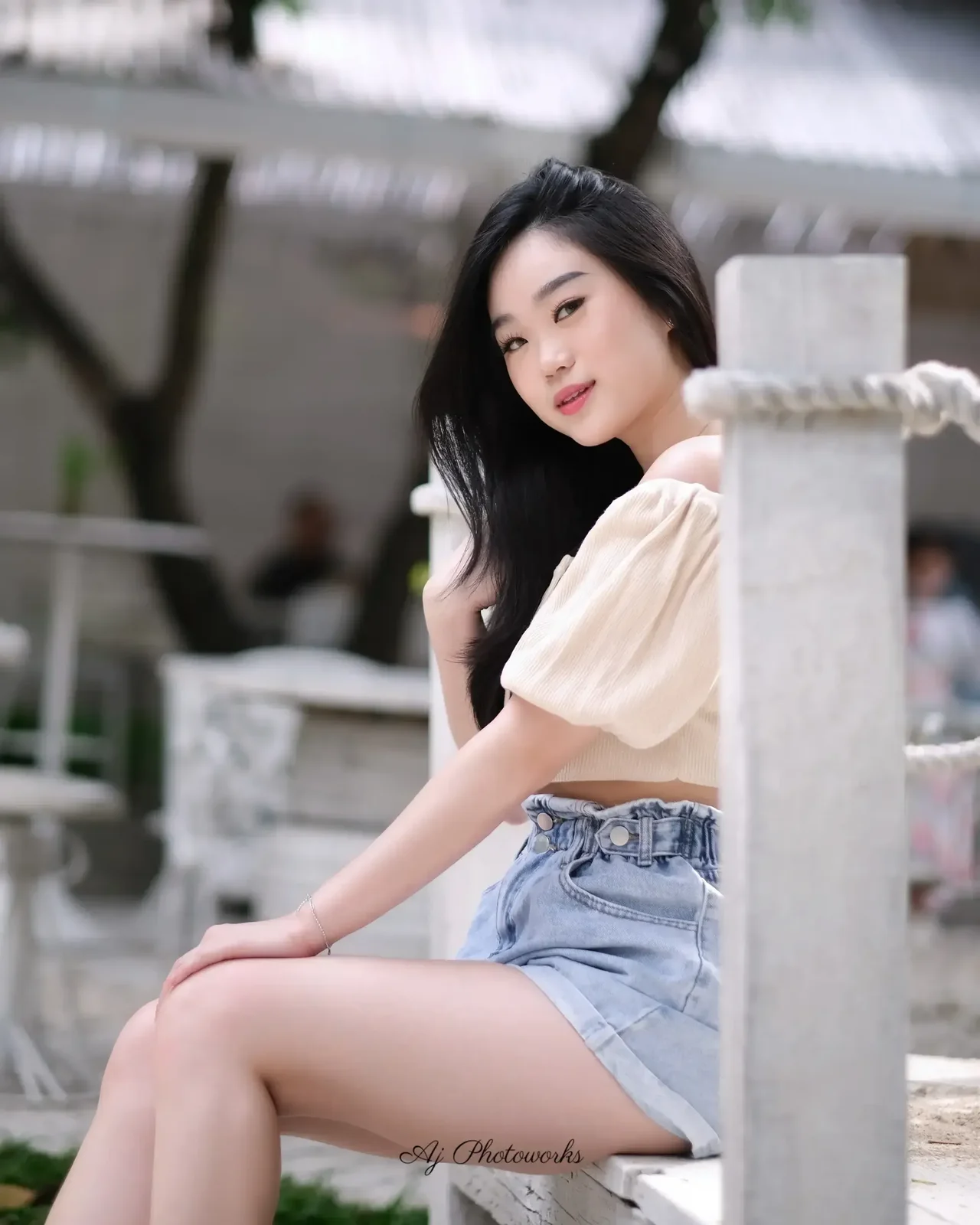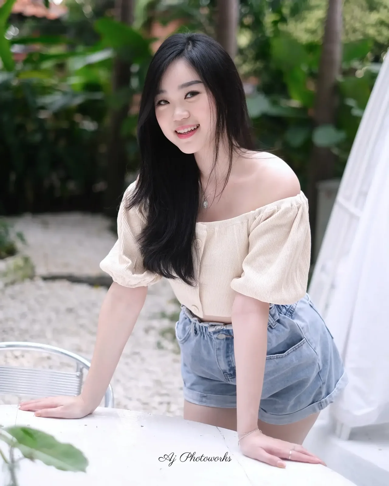 Elegance in simplicity: a confident woman in a cozy, sunlit outdoor setting with warm tones and timeless charm.