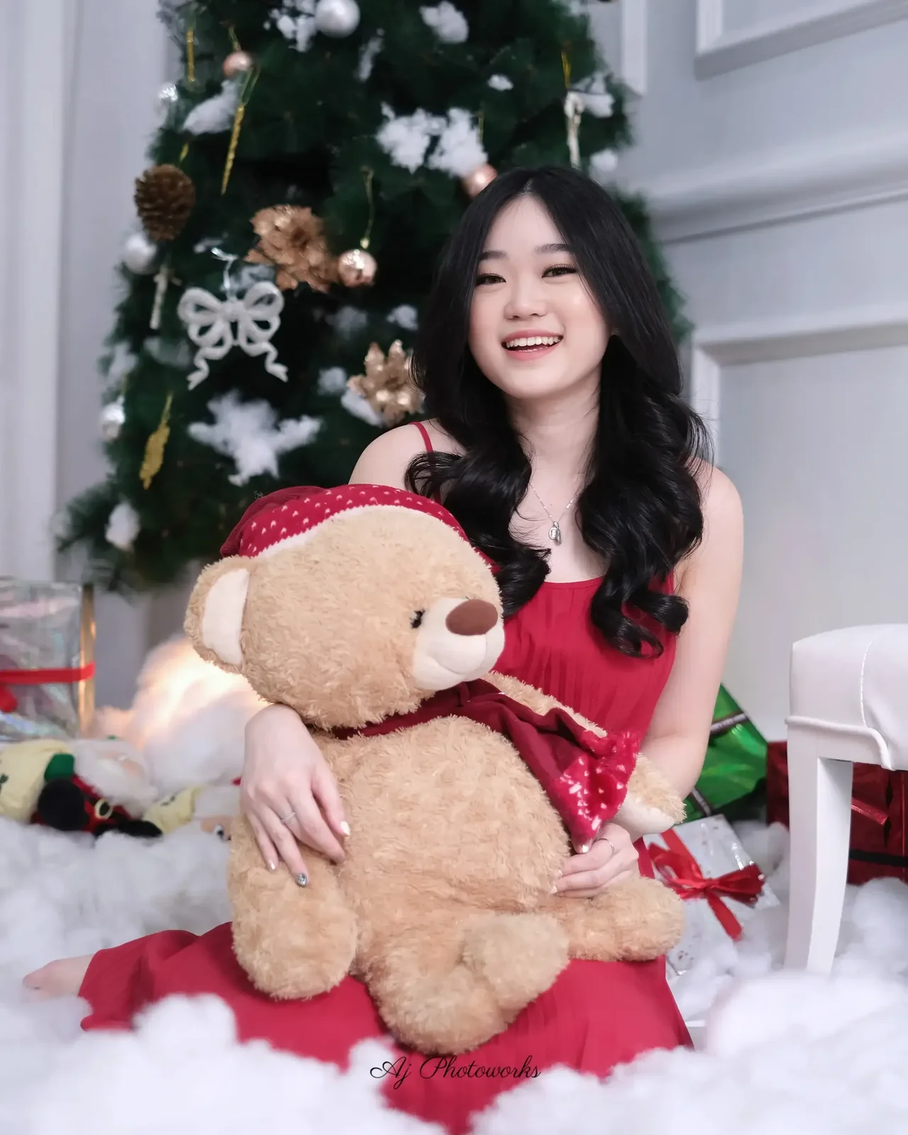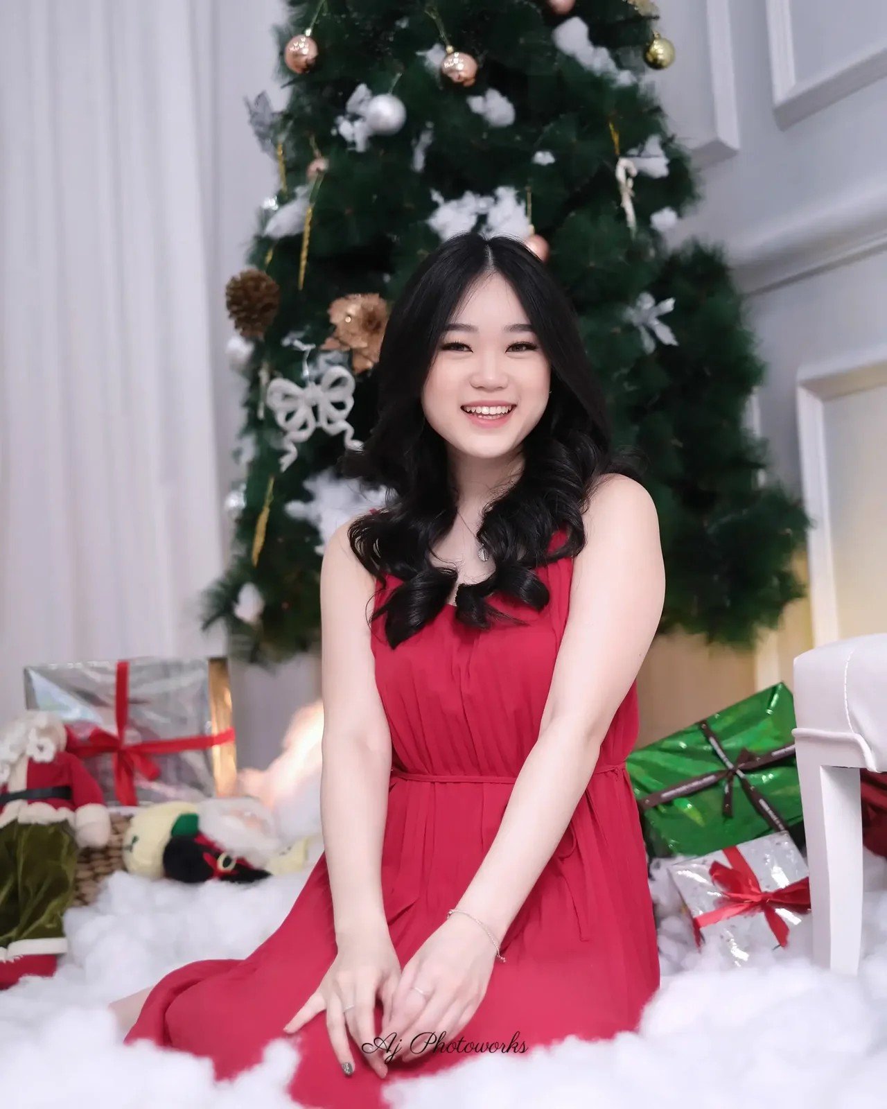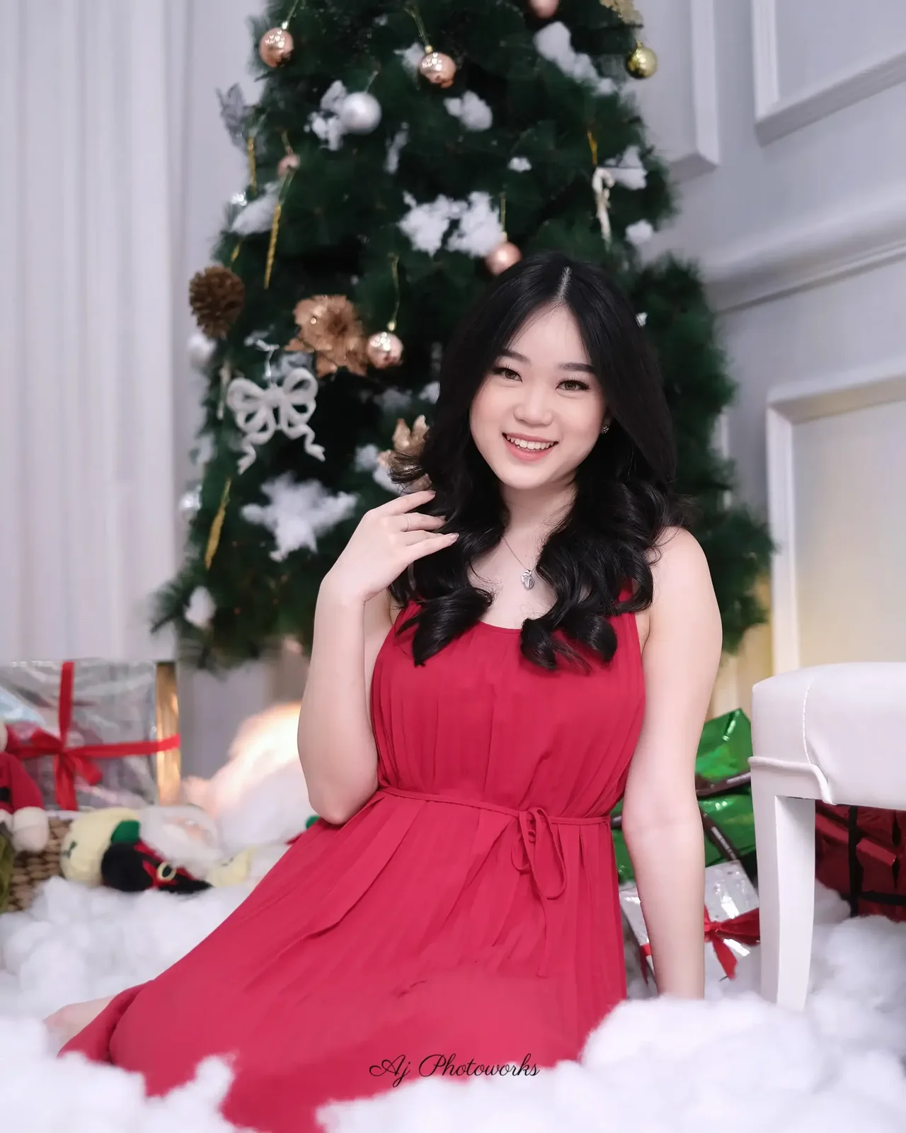 Holiday elegance in a festive studio setup with vibrant red attire and a joyful Christmas ambiance.