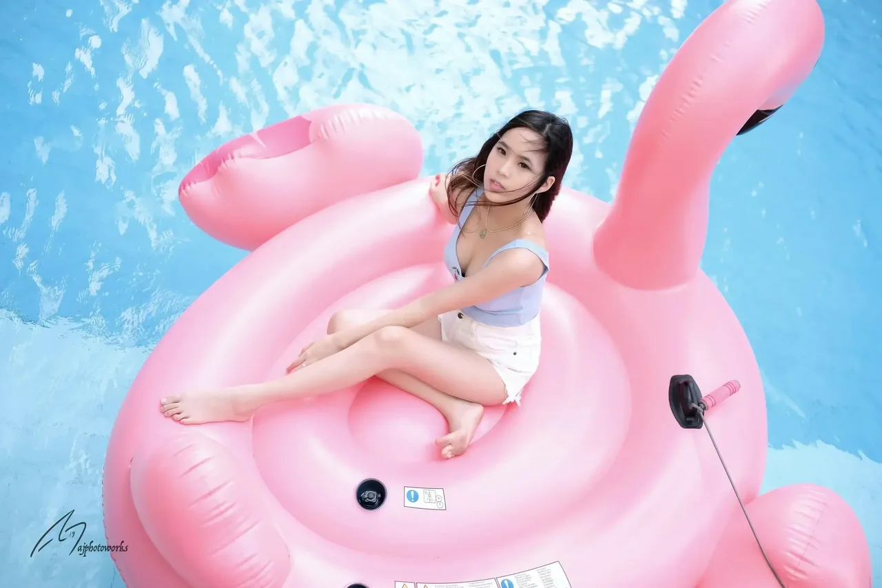 A woman lounges on a pink flamingo float in a pool, exuding summer vibes in a playful and relaxed atmosphere.