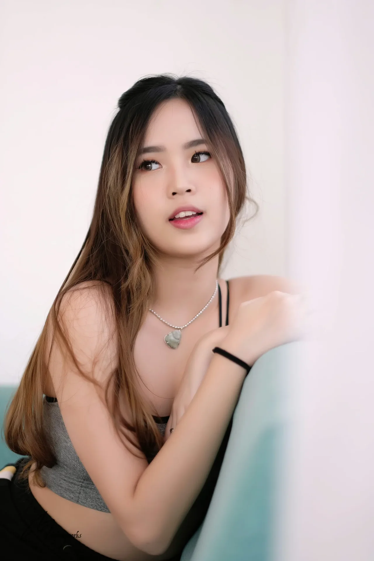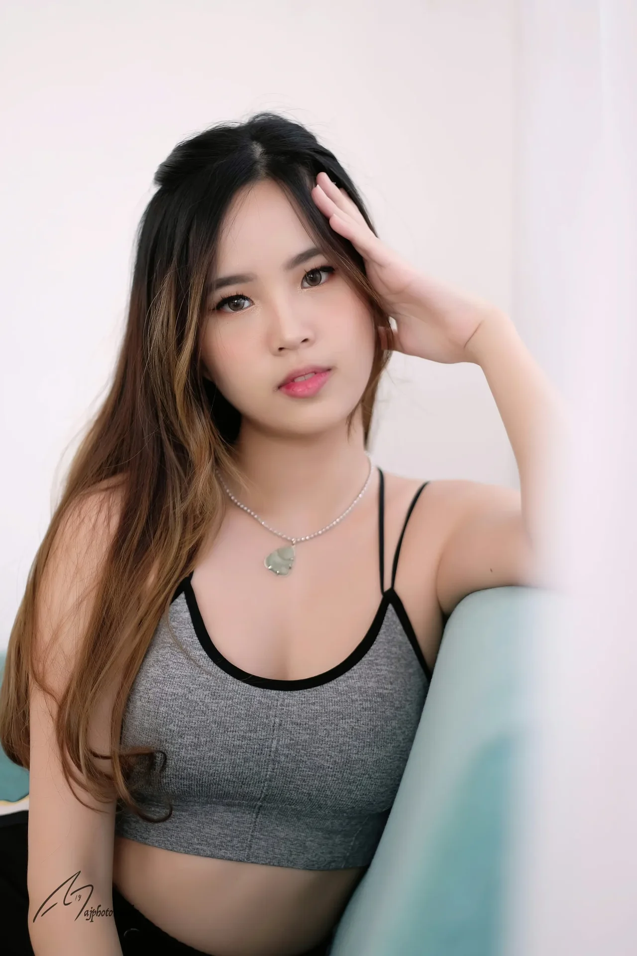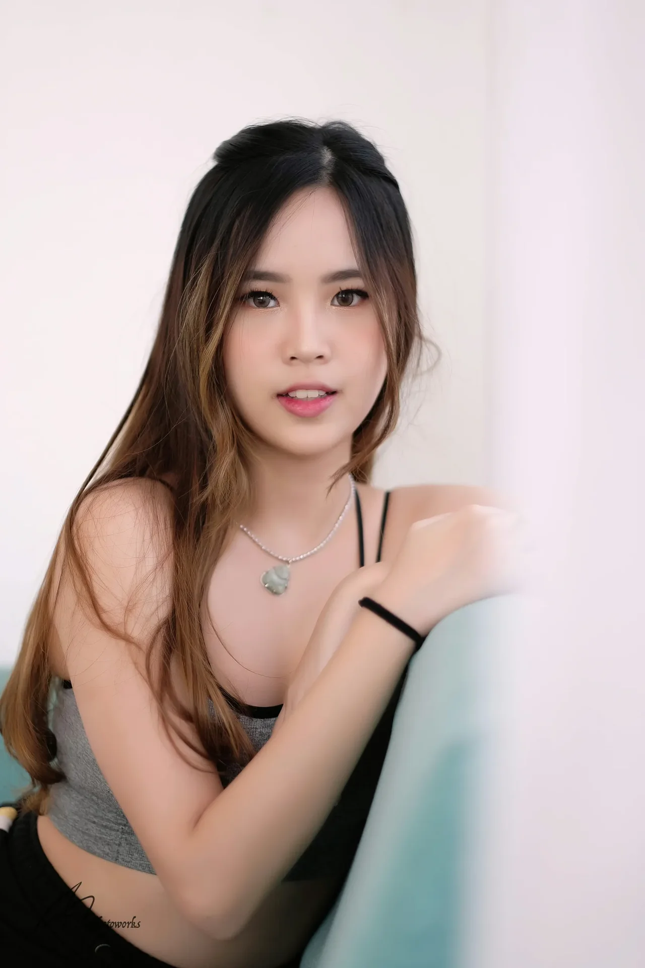 Minimalist elegance meets contemporary fashion in a soft-lit indoor studio setting, highlighting delicate accessories and natural beauty.