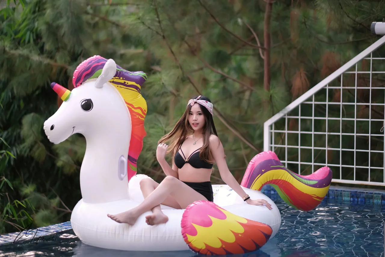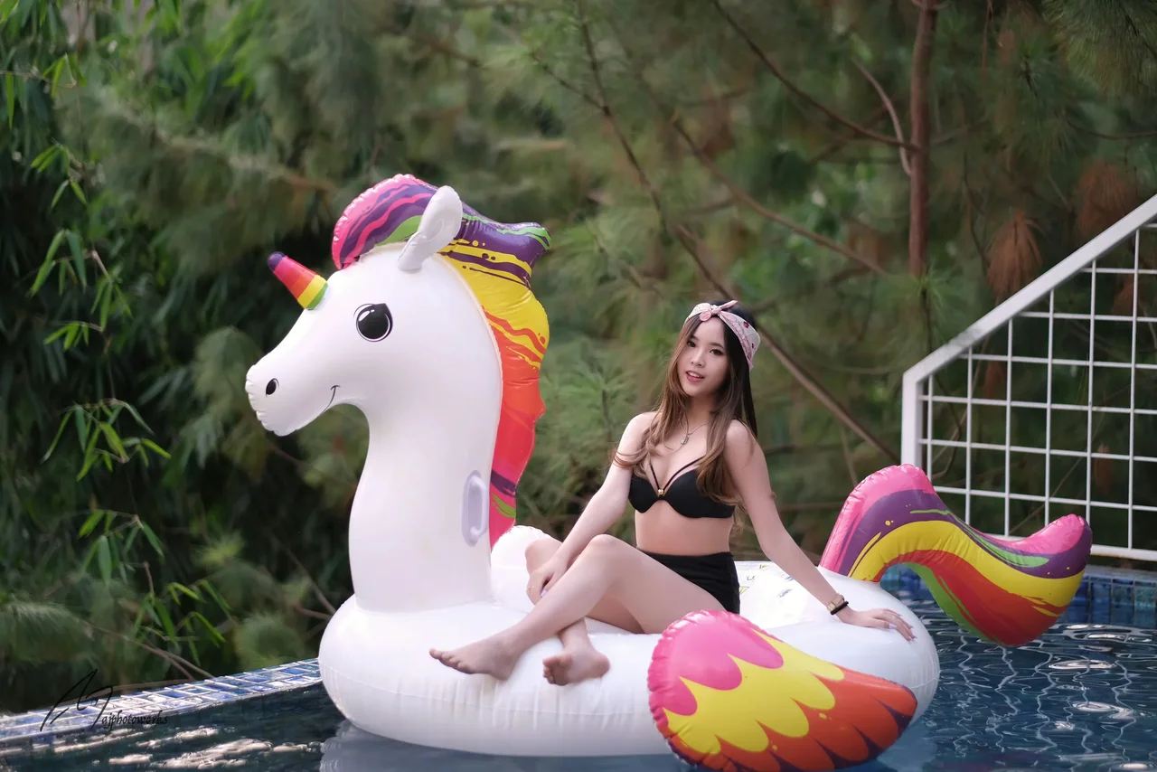 A woman lounging on a colorful inflatable unicorn by a poolside, exuding playful vibes with vibrant summer attire and natural surroundings.