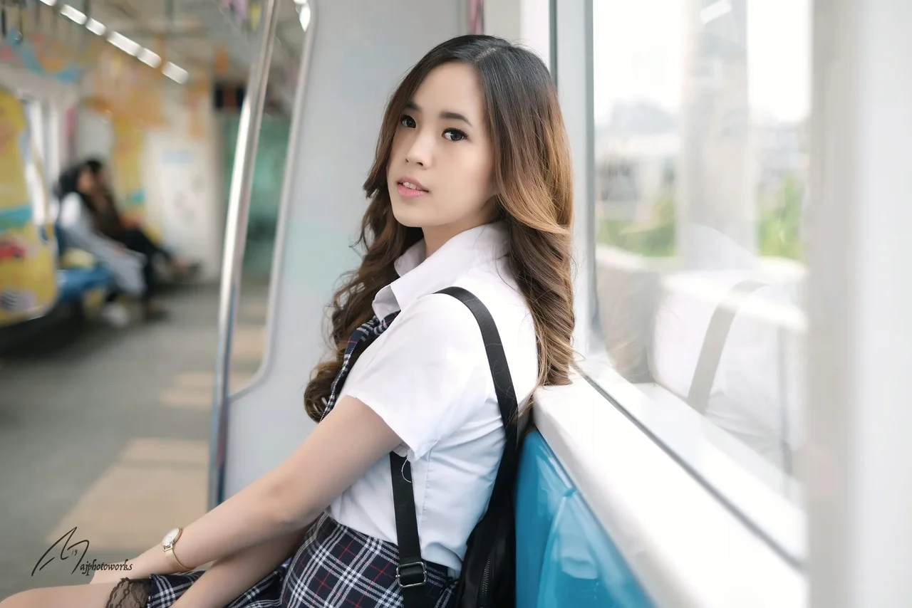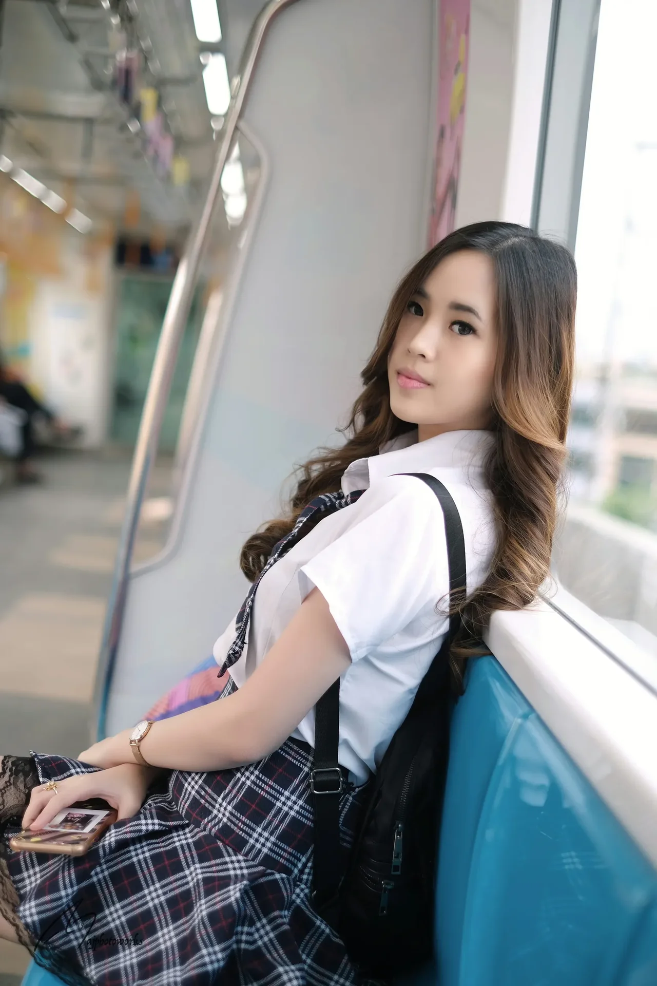 Delicate poise in urban transit, a moment of quiet grace within the bustling flow.