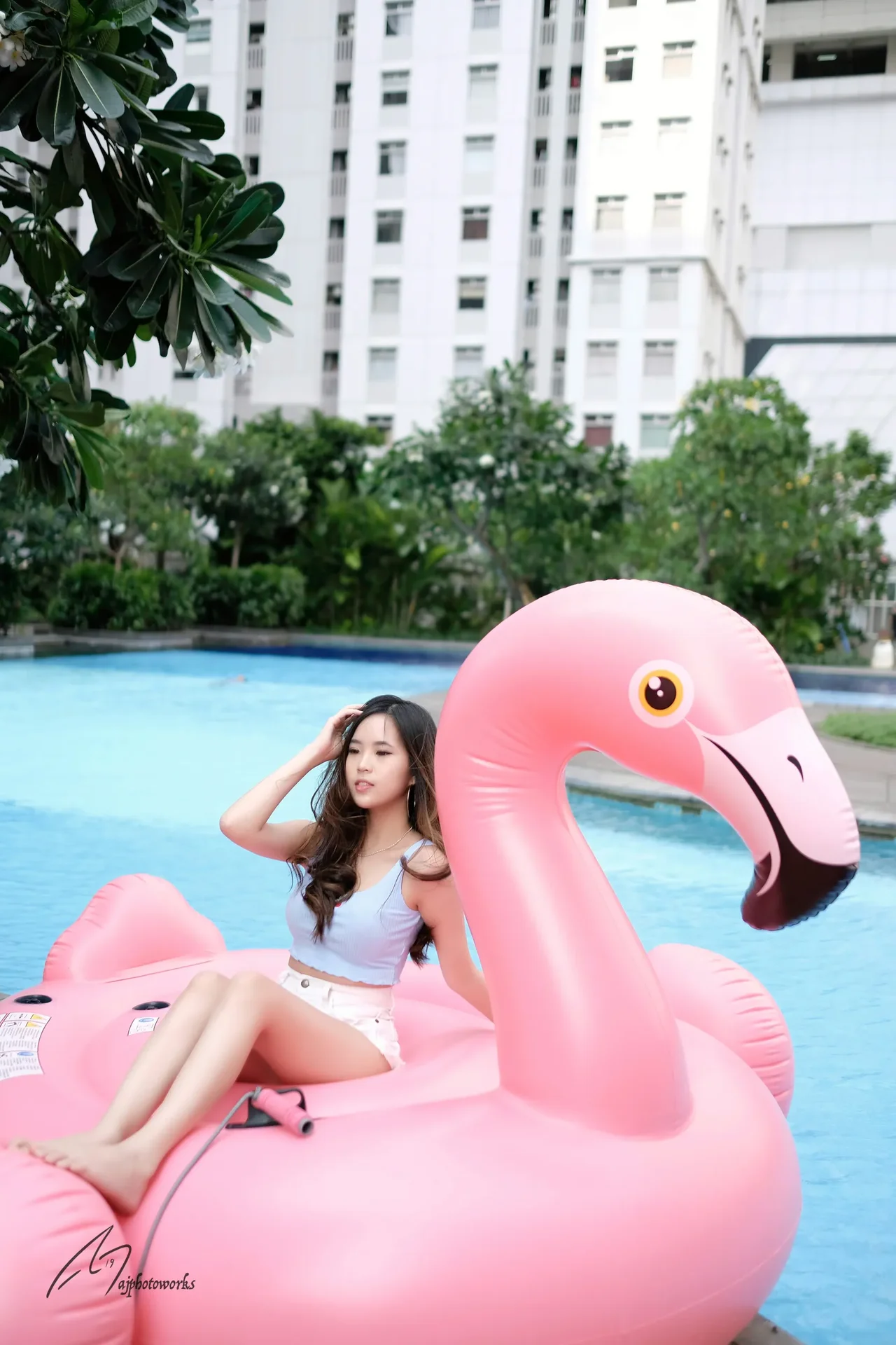 Summer poolside leisure with playful poses and soft natural lighting