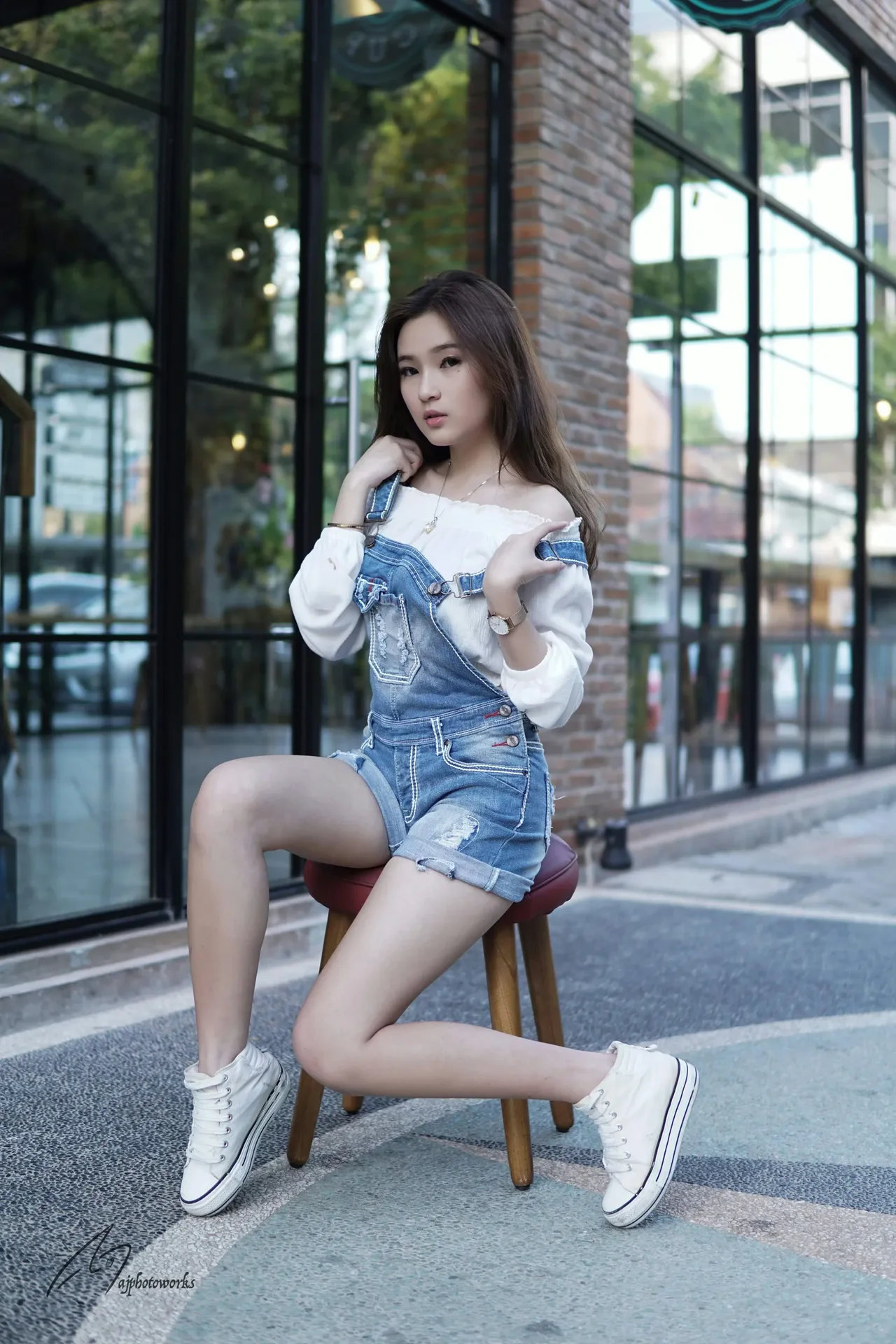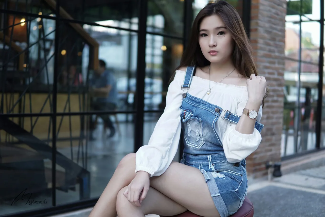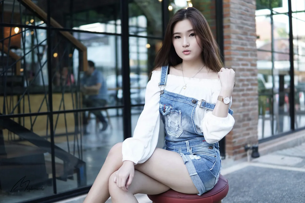 A chic, relaxed pose outside a modern cafe highlights effortless style in denim and everyday wear. Soft sunlight and warm tones enhance the casual yet fashionable vibe.