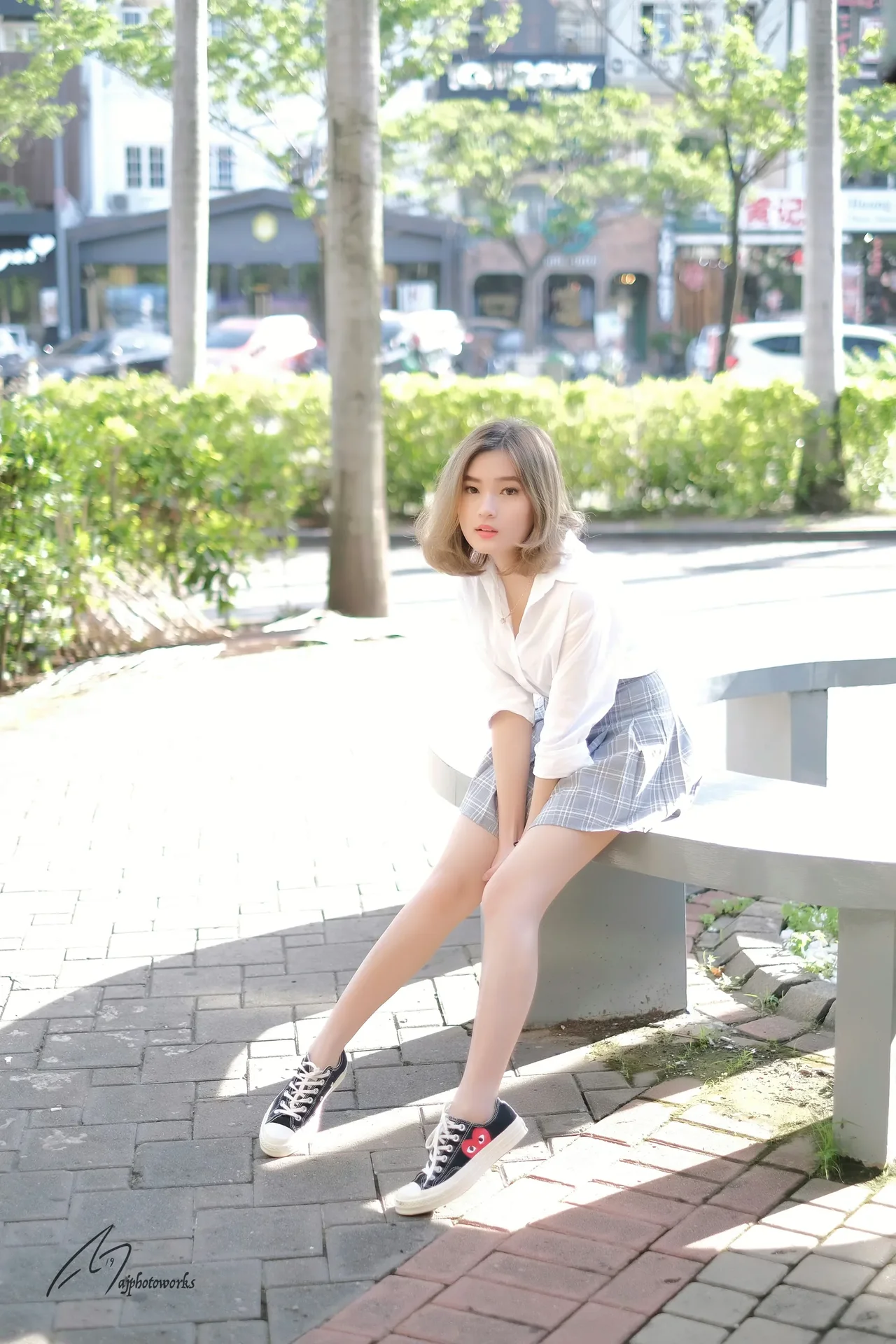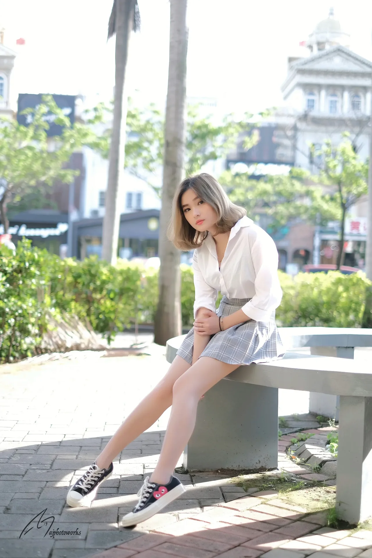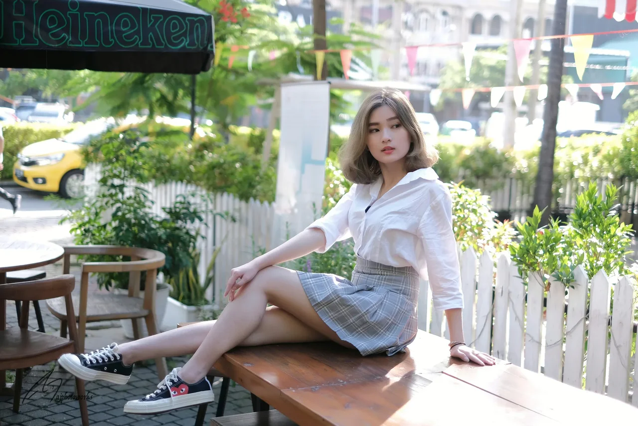 Casual academic charm with a touch of urban vibrancy captured in natural daylight.
