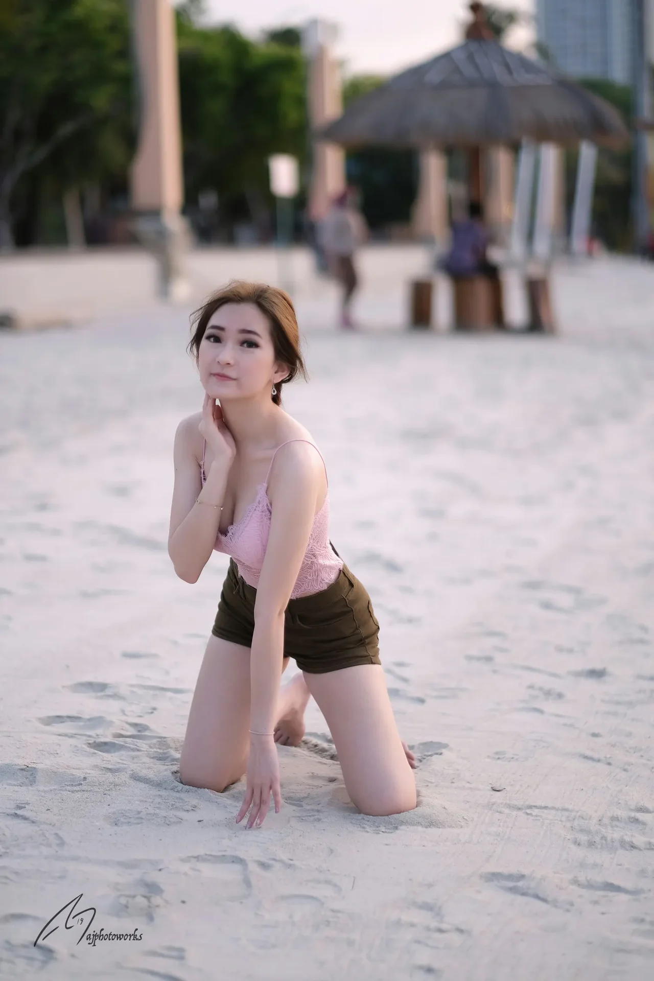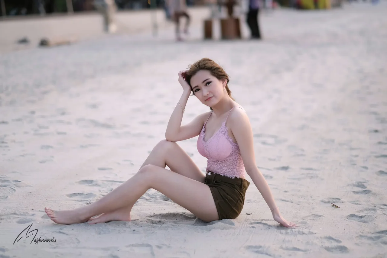 Golden hour meets coastal serenity in this beachside portrait. The model's lace top and denim shorts blend casual elegance with summer vibes, captured against a backdrop of gentle waves and warm, sandy hues.