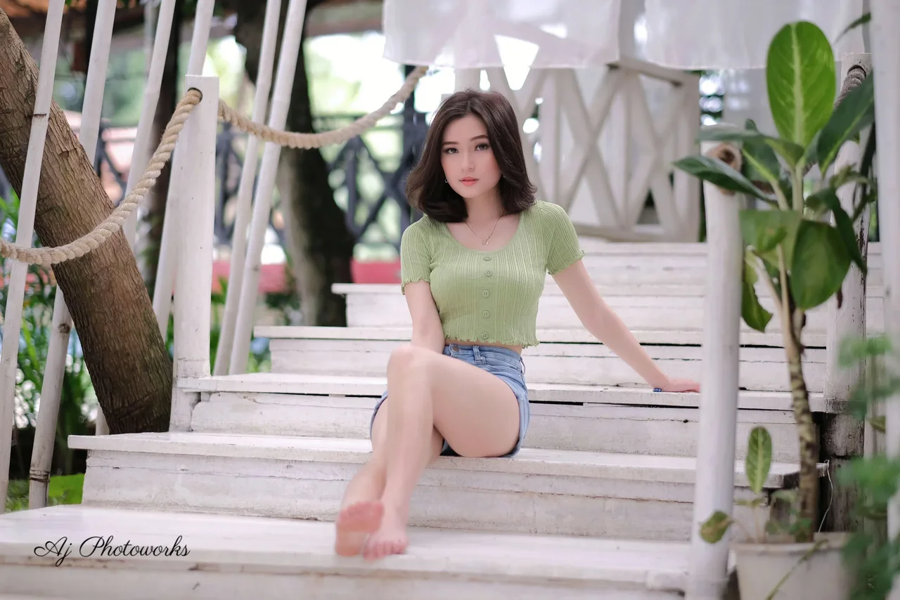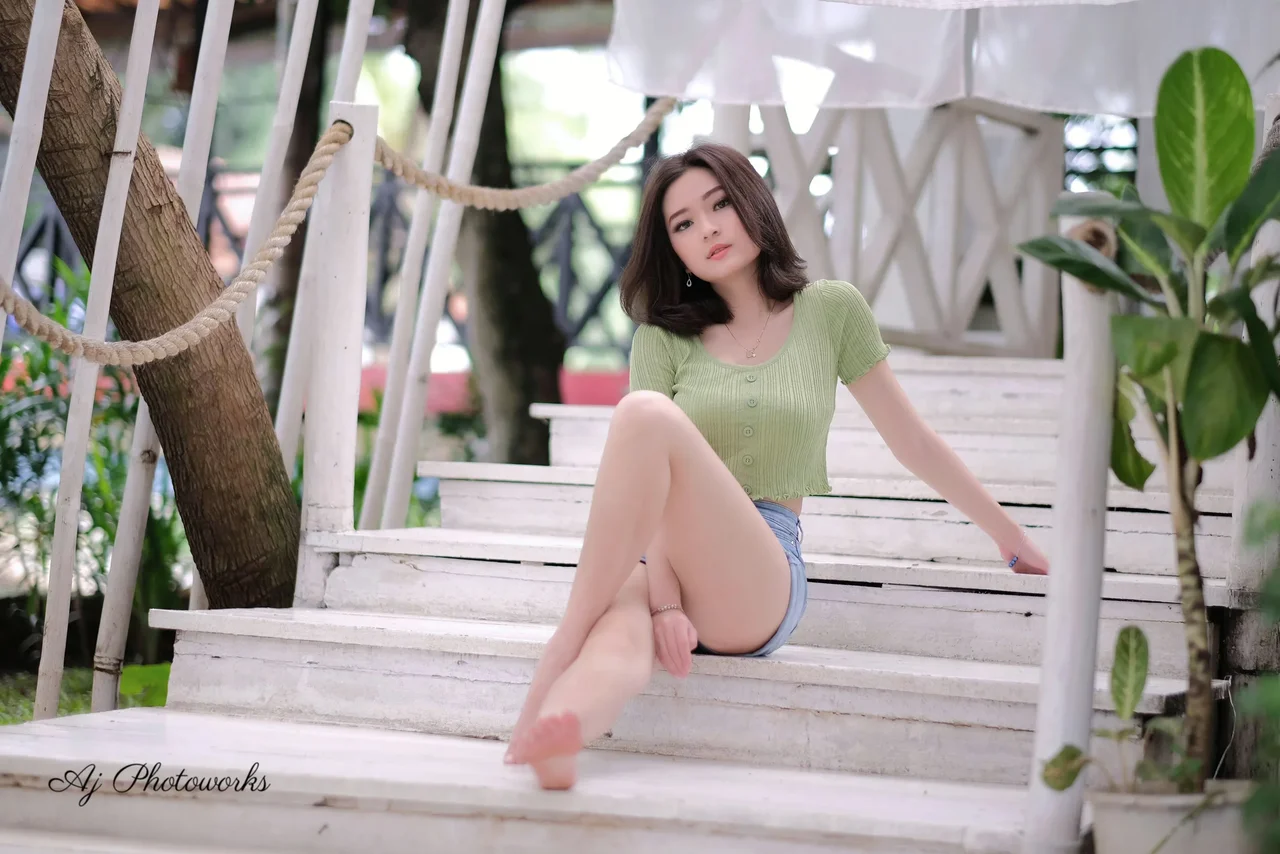 A serene moment captured in a lush garden, where a woman in a light green crop top and denim shorts sits on white wooden steps, blending natural beauty with effortless style.