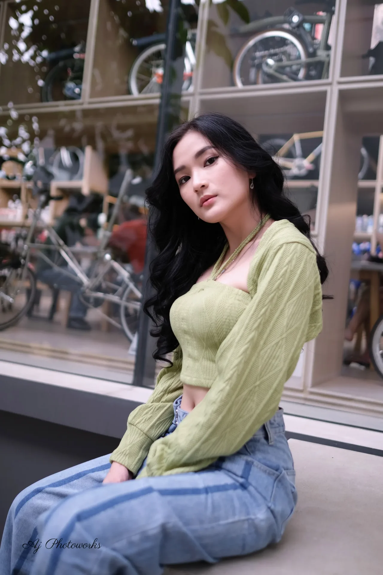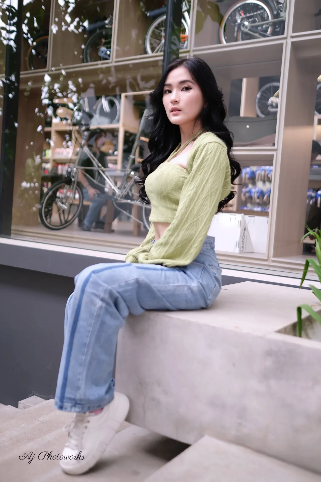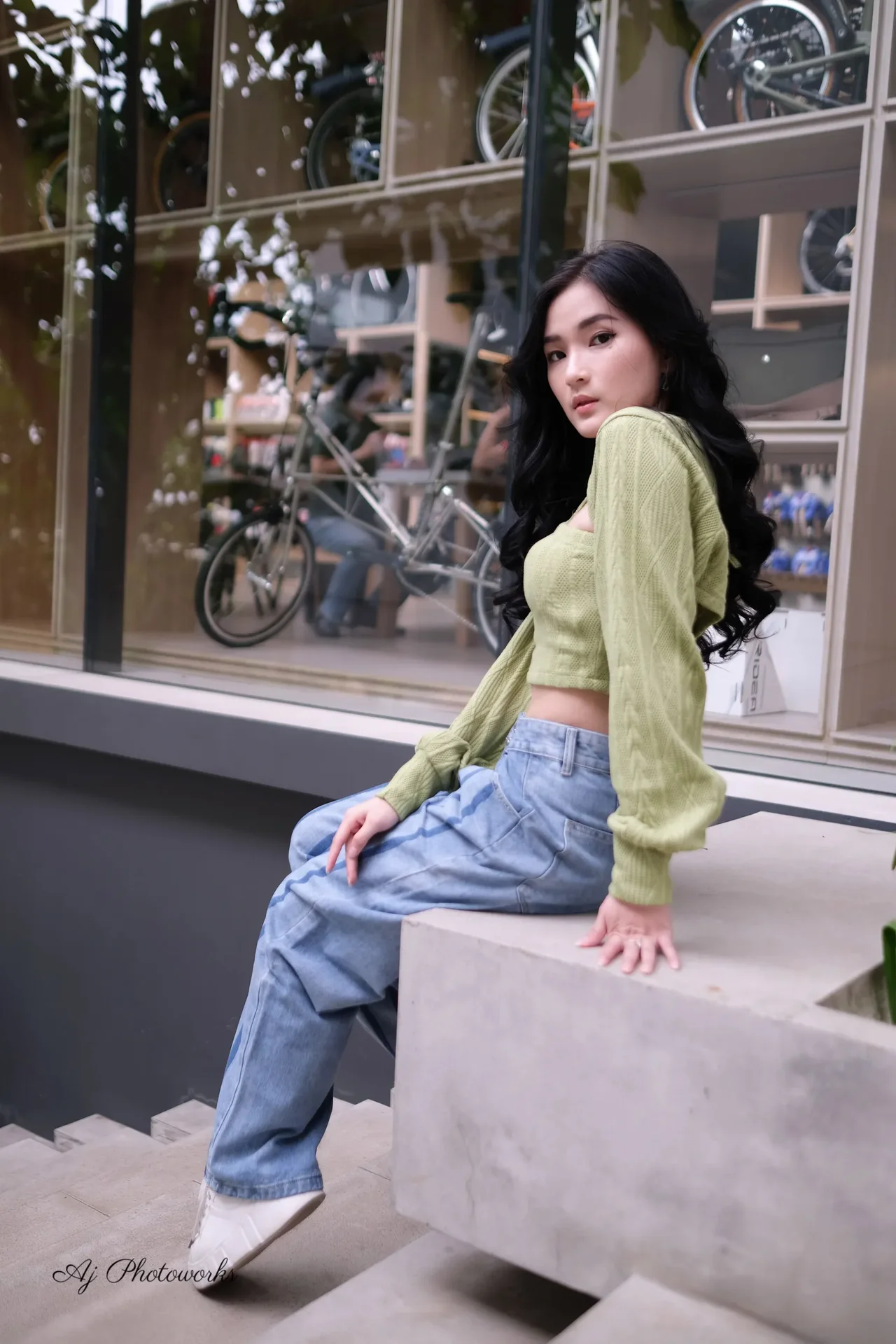 A young woman in a trendy olive green cropped cardigan and light blue high-waisted jeans poses on concrete stairs with a bicycle shop backdrop.
