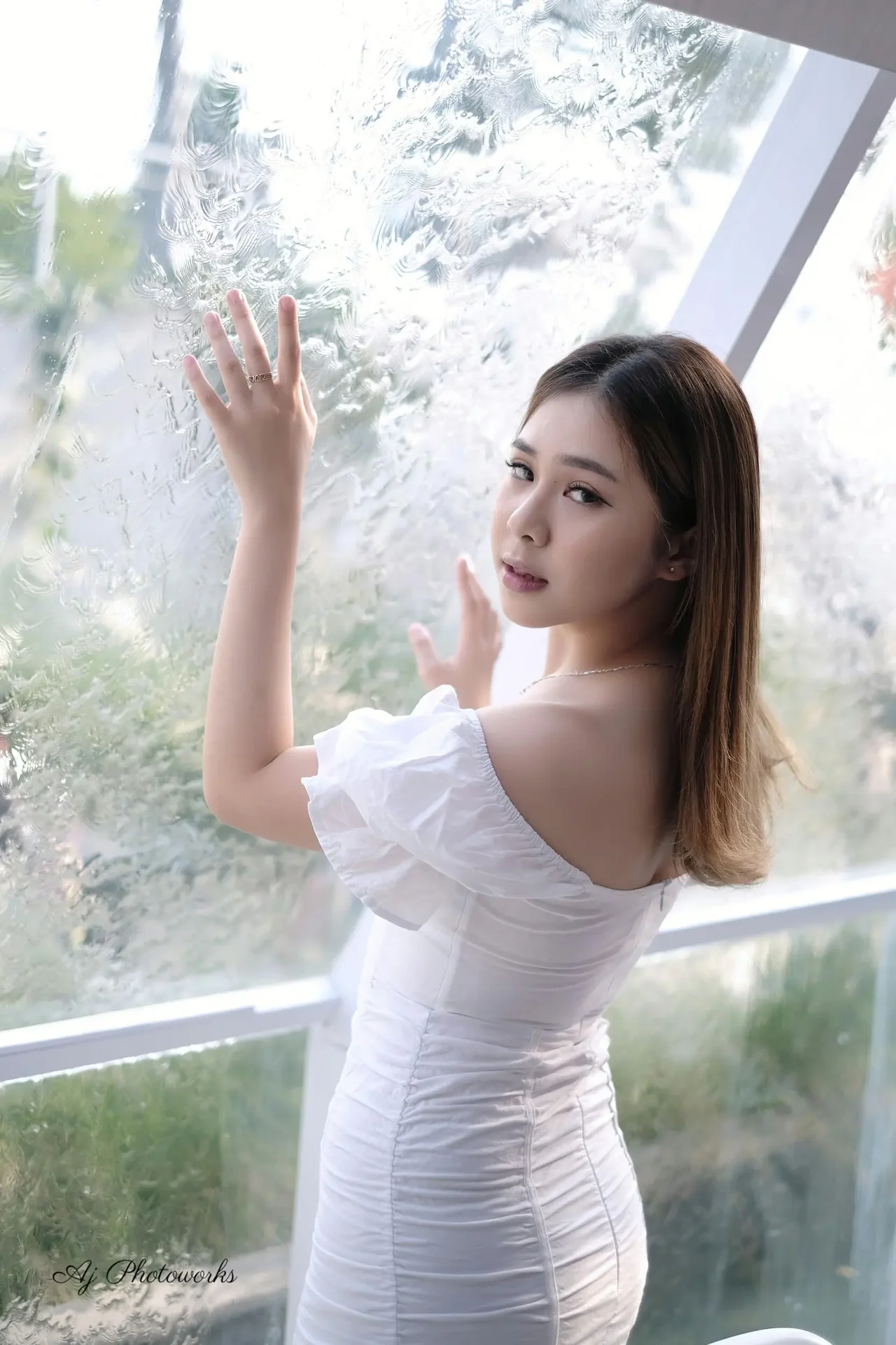 Soft light dances through a frosted window, highlighting a model in a delicate white lace-up dress with blush sleeves, evoking a timeless elegance.