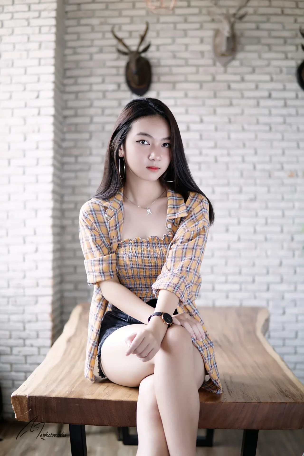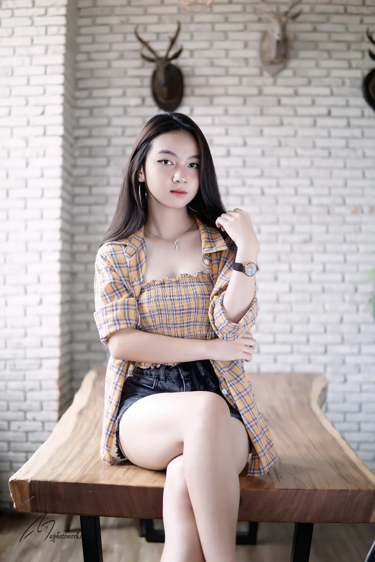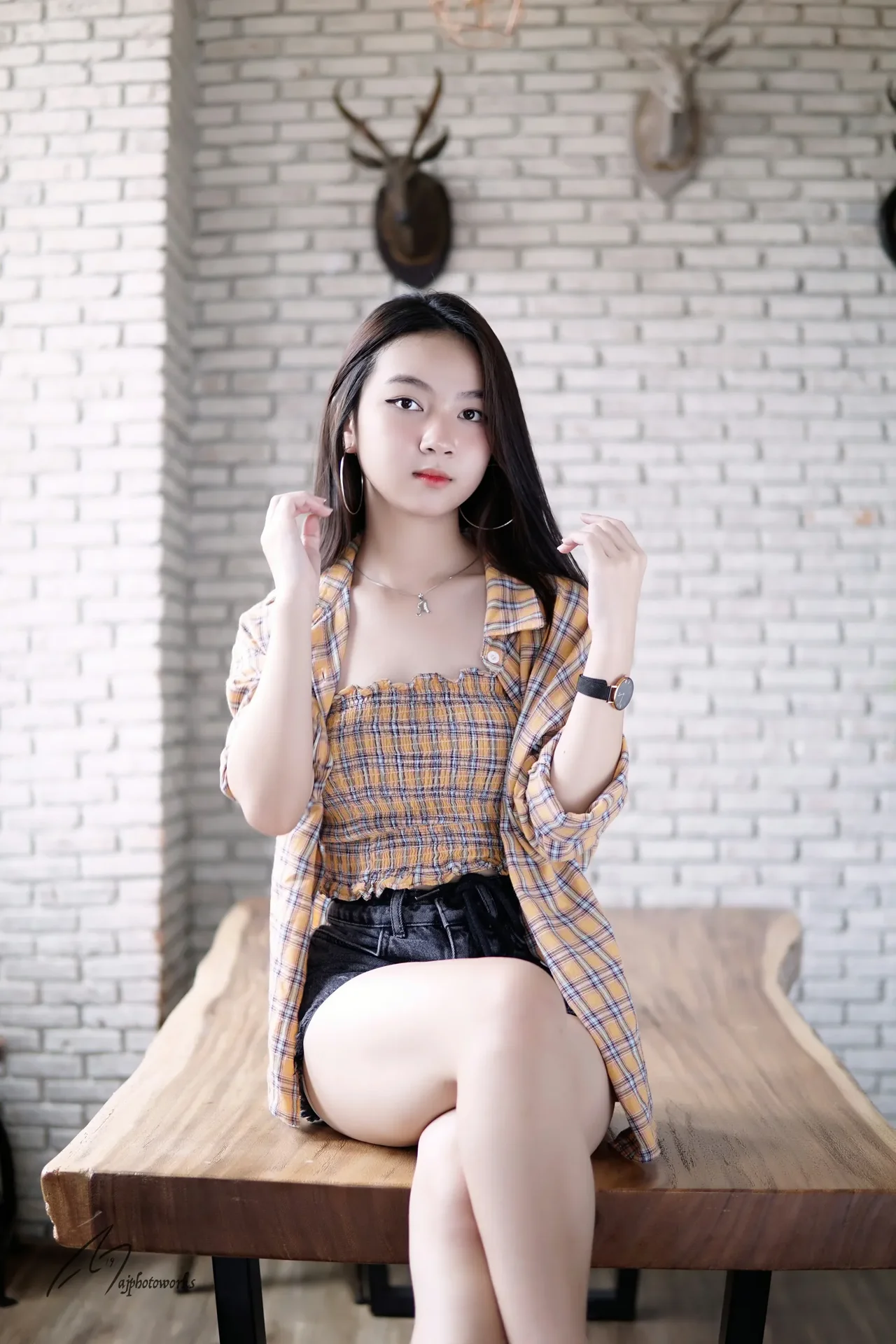 A woman in a plaid jacket and checkered top sits on a wooden table against a white brick wall.