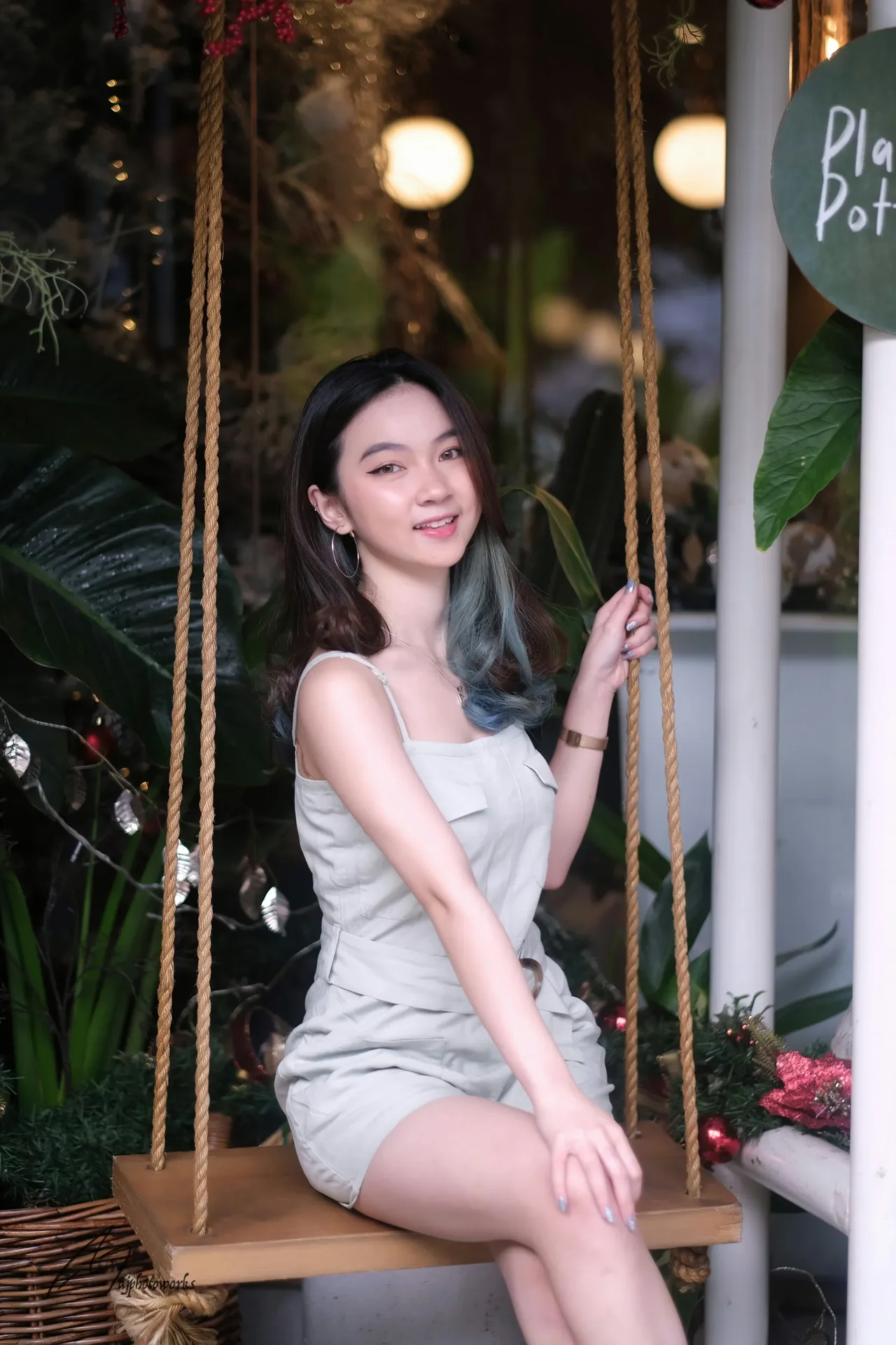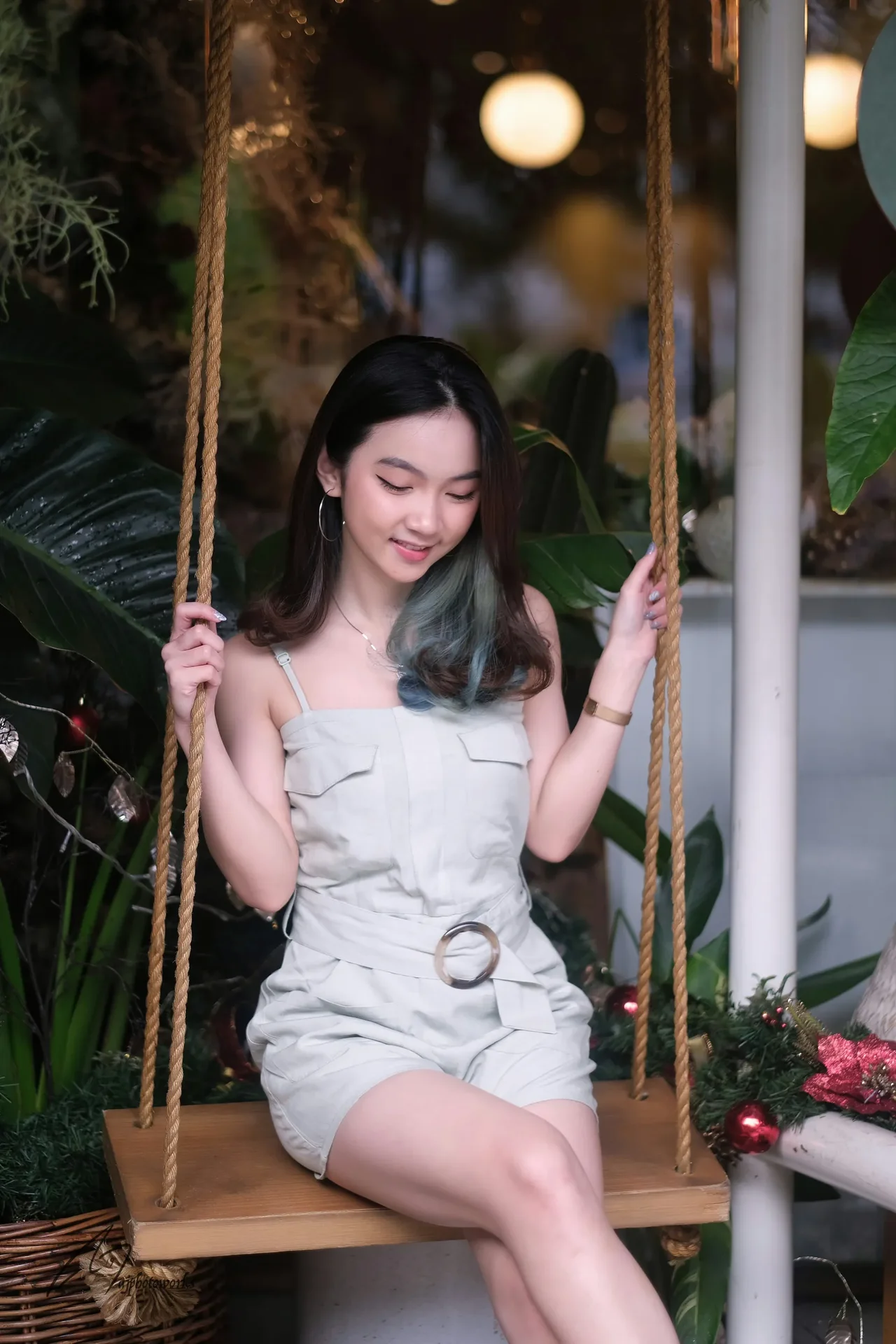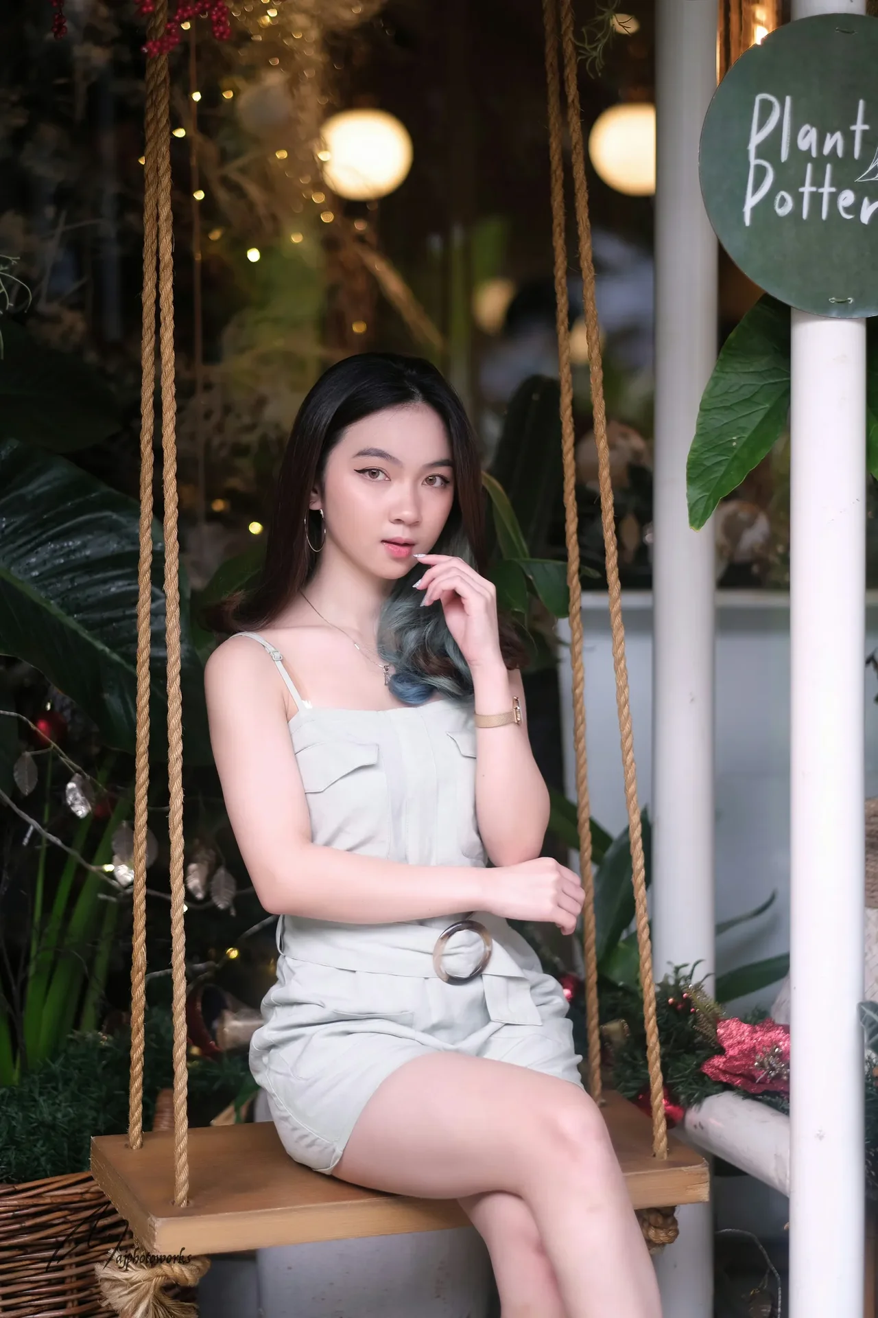 Elegance meets holiday cheer: A poised moment under festive greenery and twinkling lights.