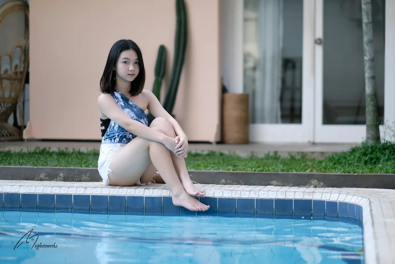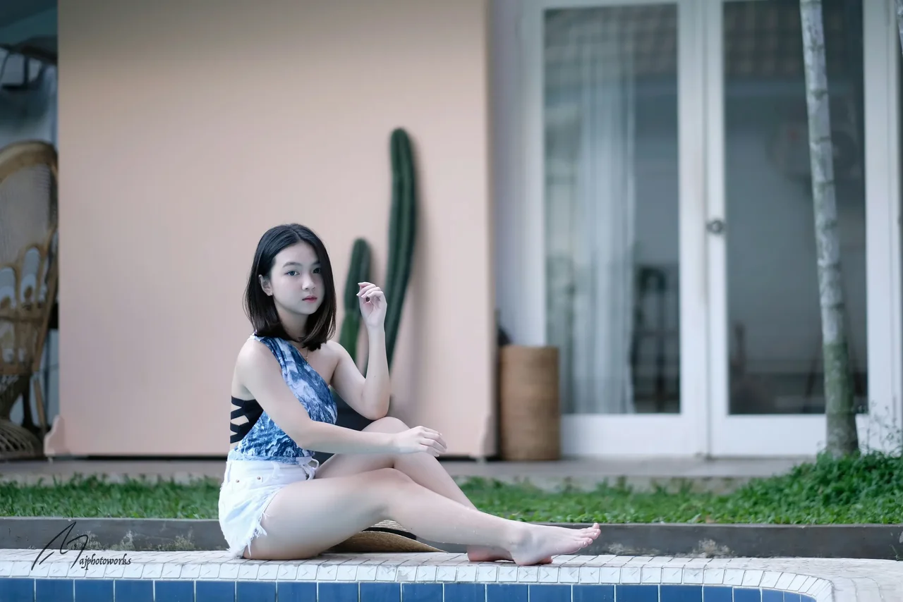 A vibrant splash of blue and white against a serene poolside backdrop.