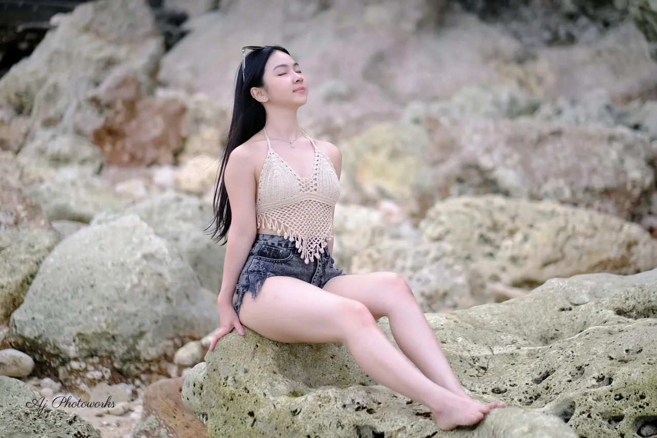 Effortless summer vibes meet coastal cool as she relaxes among weathered rocks, blending natural textures with relaxed fashion.
