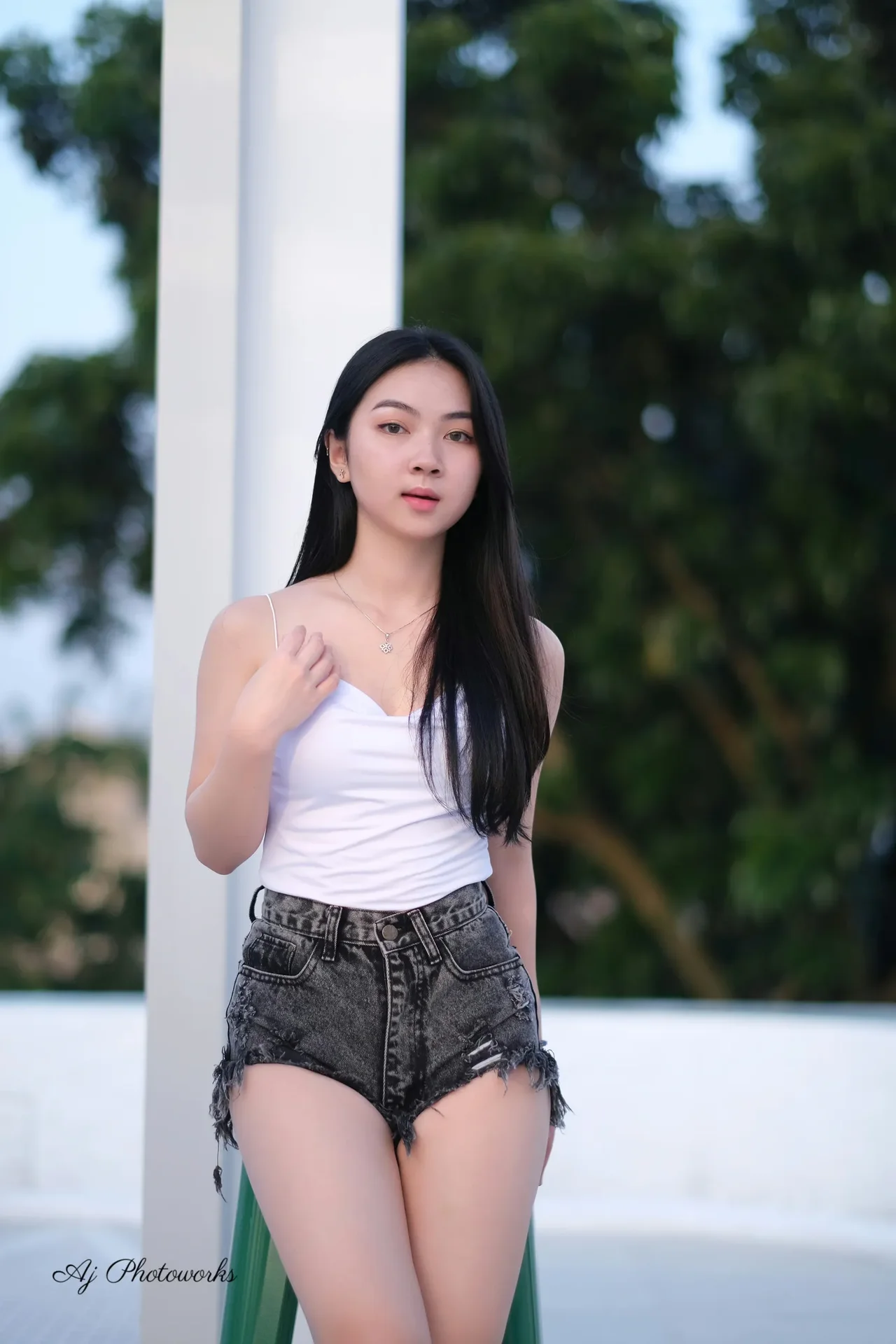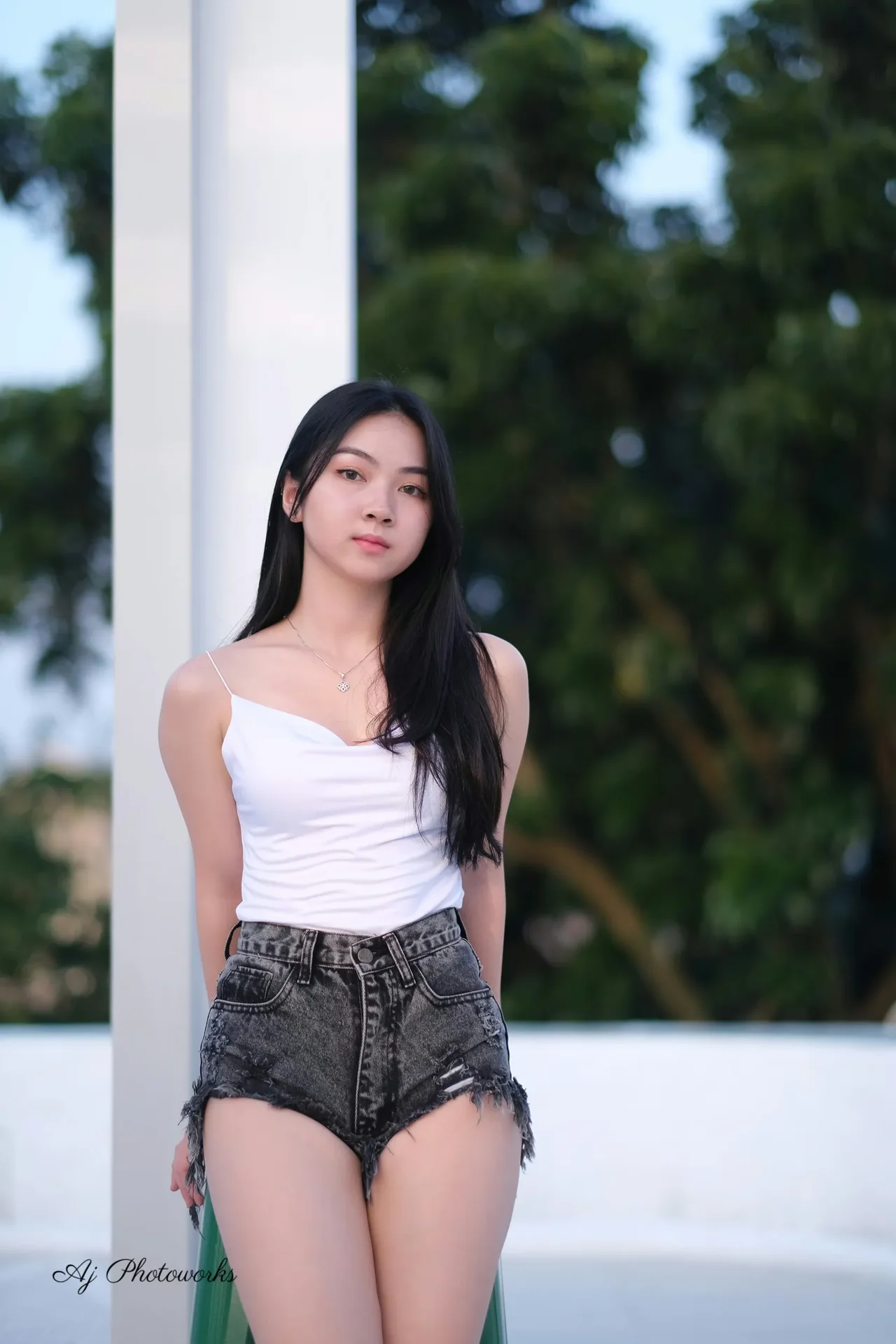 Style meets nature in this fashion portrait capturing a confident woman in distressed denim and white, set against a warm, golden-hour backdrop.