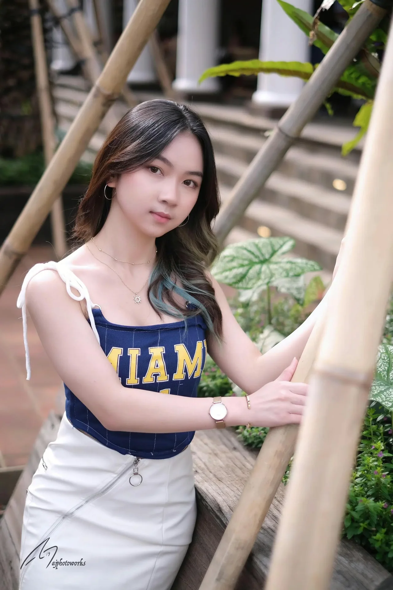 A confident young woman poses in a Miami-themed outfit against a serene bamboo-lined setting.