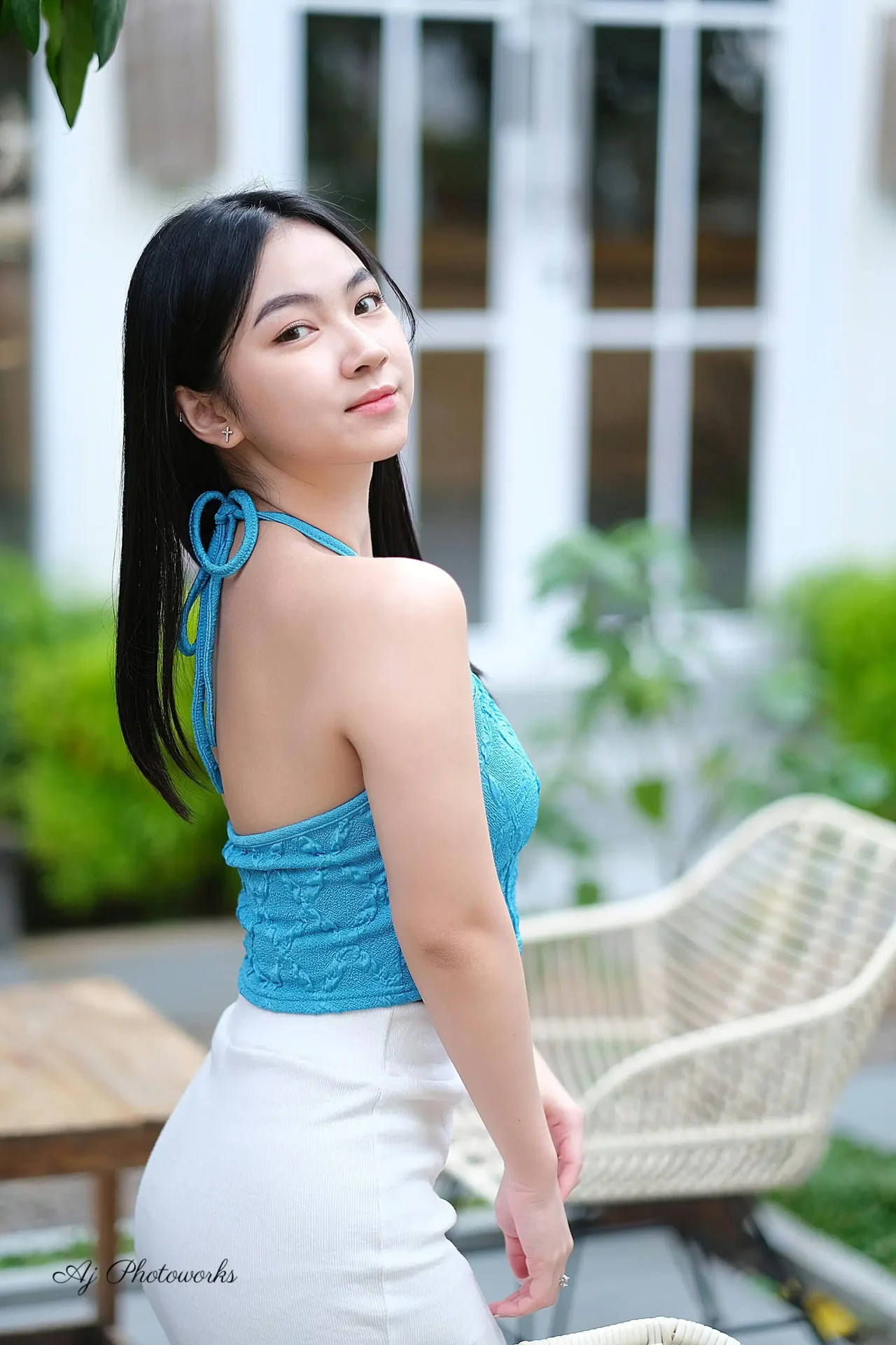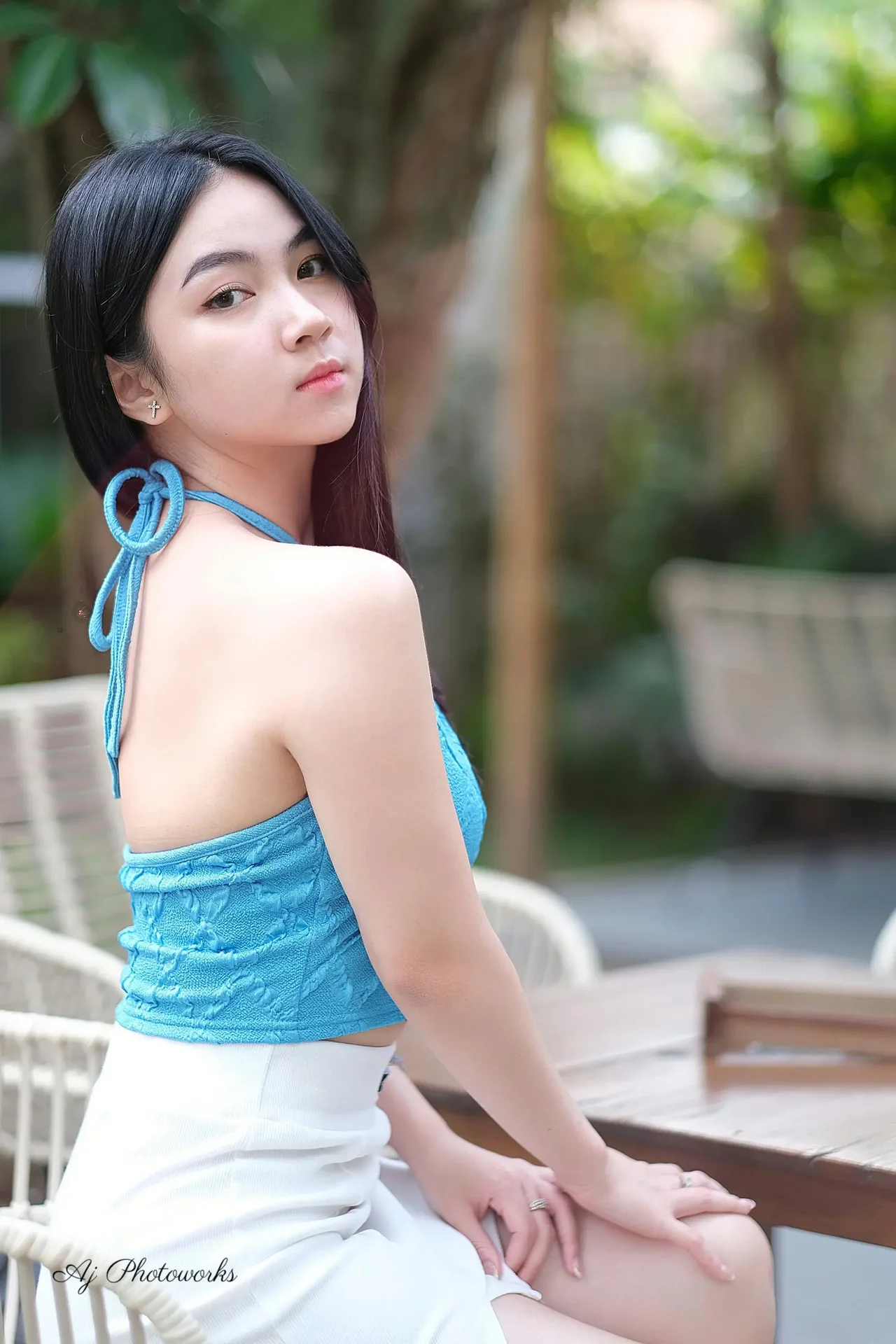 A stylish and relaxed portrait of a woman in a vibrant outdoor setting, blending earthy textures and cool tones.