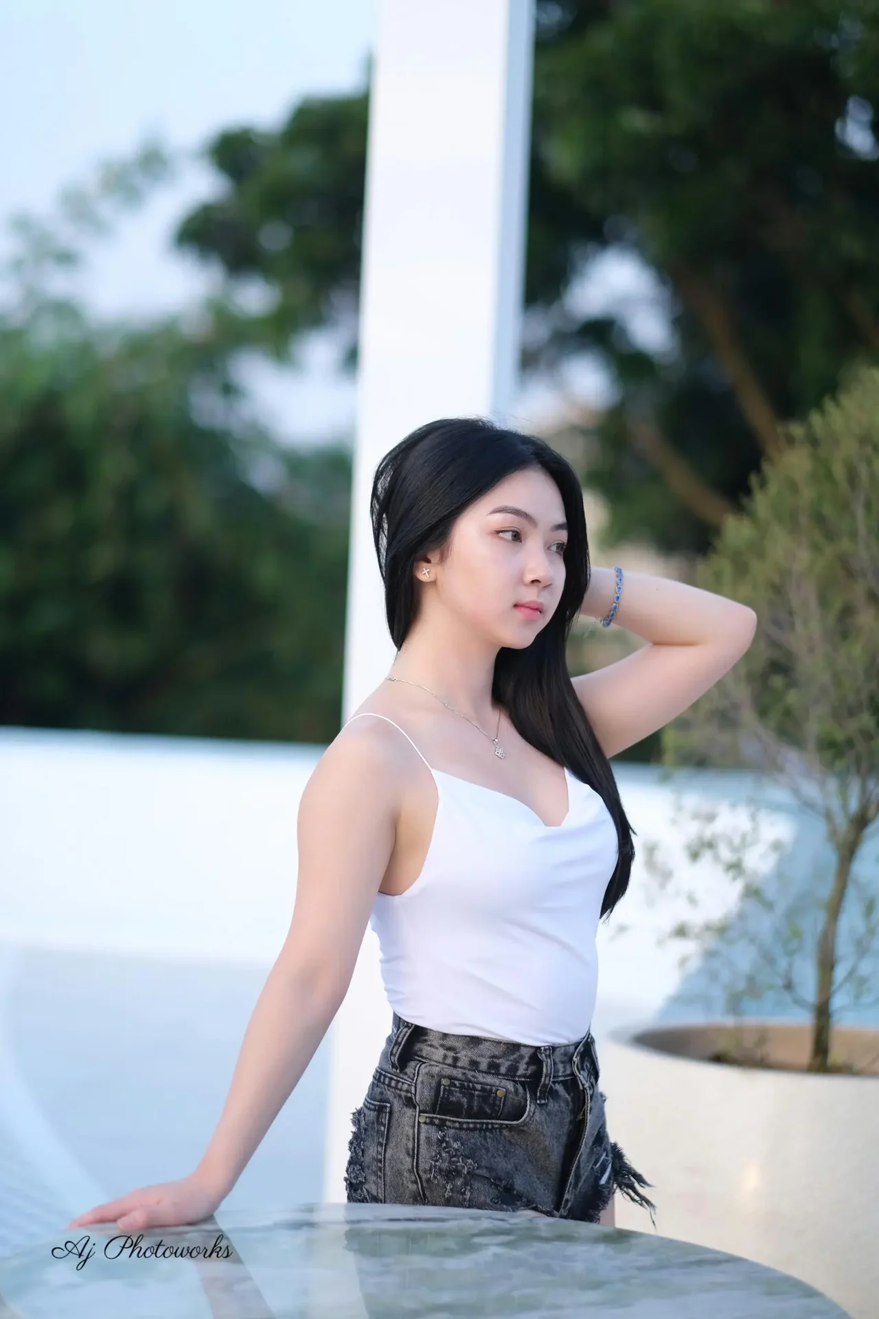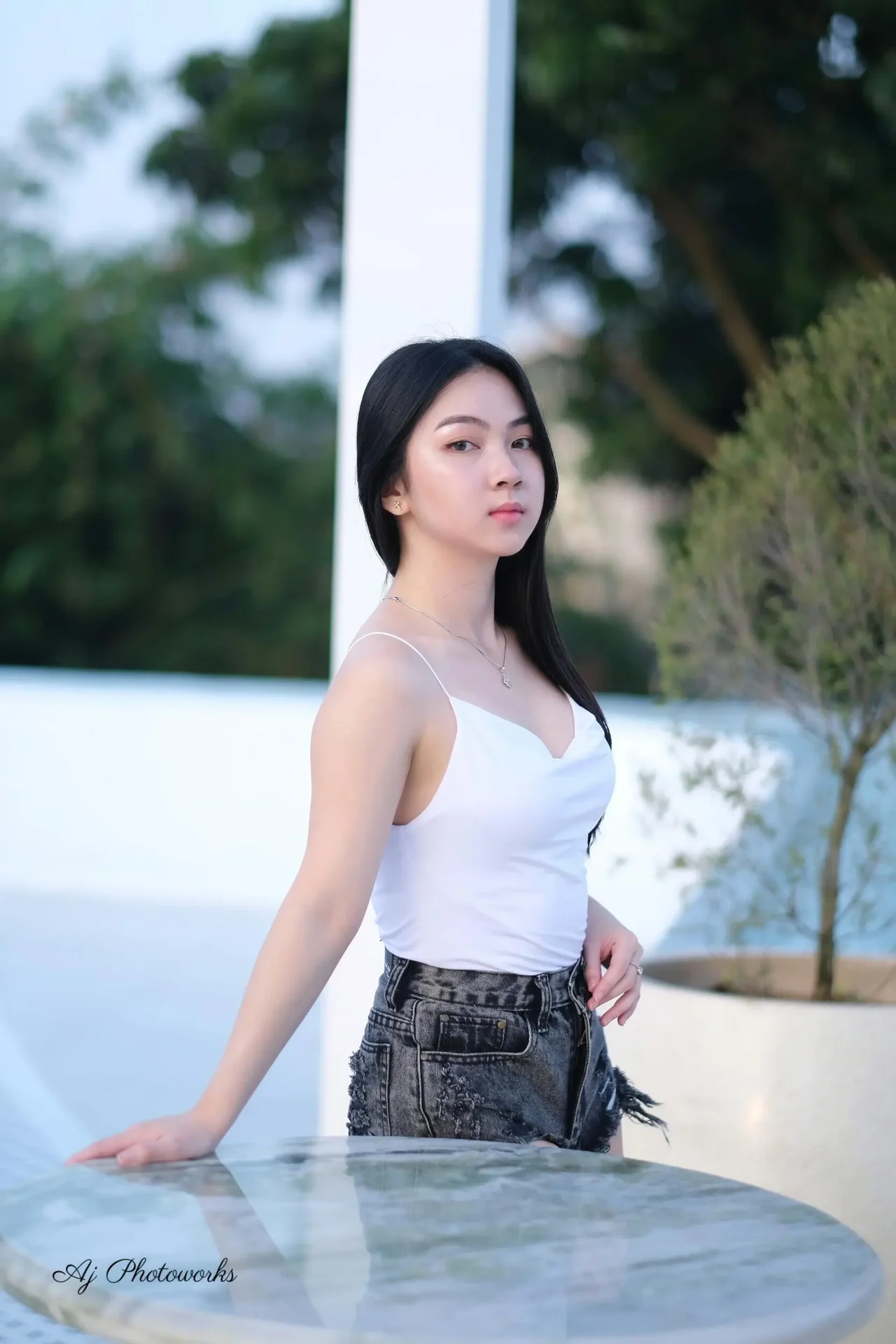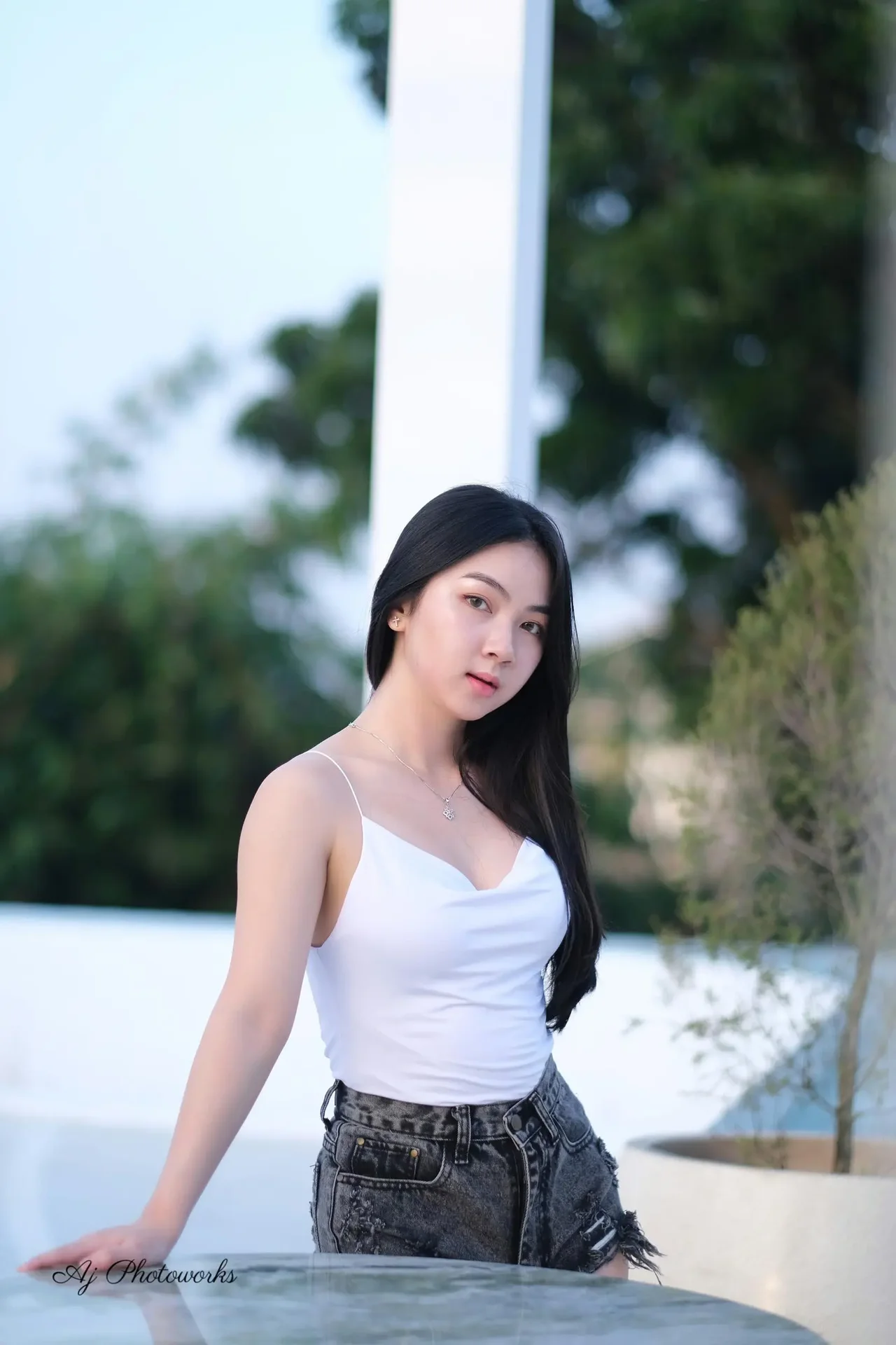 Sunlit serenity meets urban edge: A young woman balances between casual elegance and raw texture, her white t-shirt and ripped denim shorts contrasting with the green backdrop.