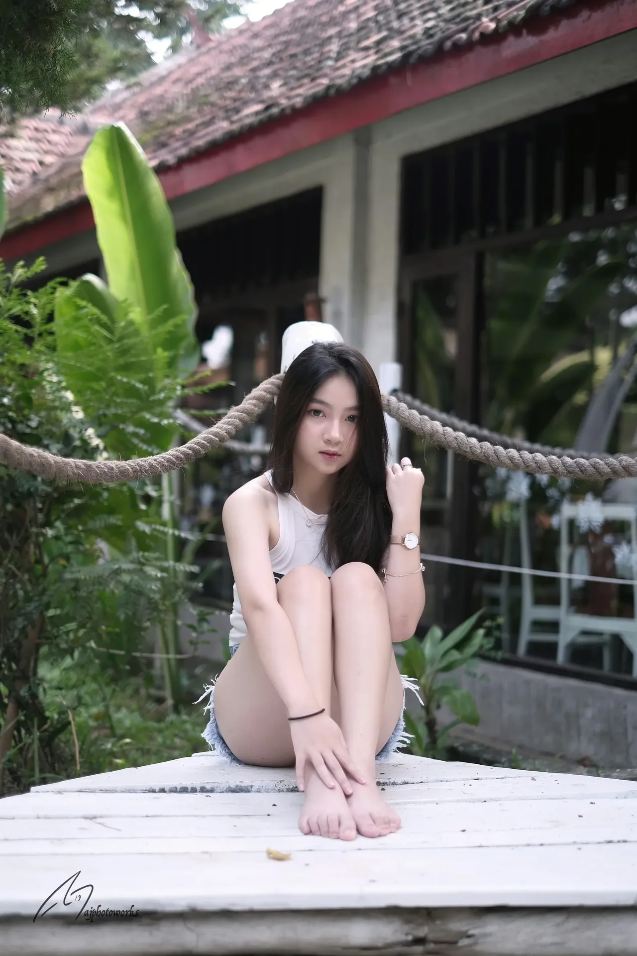 A person models in a casual tropical setting, combining cool denim and white tank top with intricate jewelry, against a backdrop of lush greenery and a vibrant red-roofed structure.