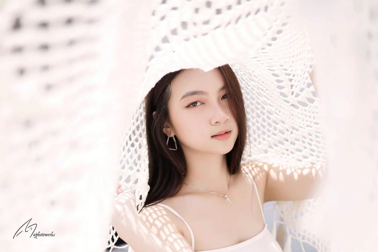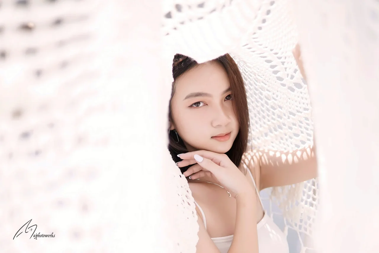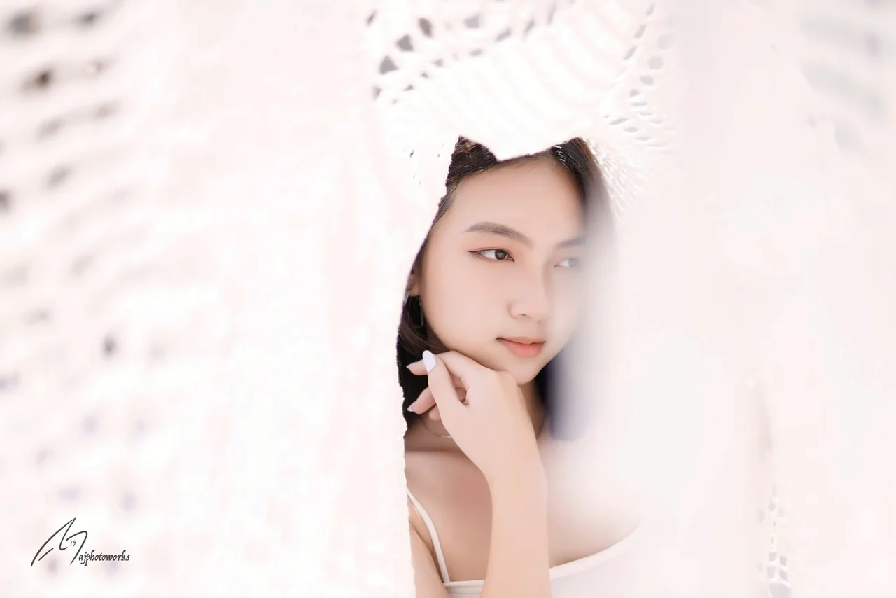 A delicate interplay of light and shadow envelops a serene portrait, capturing elegance in simplicity and texture.
