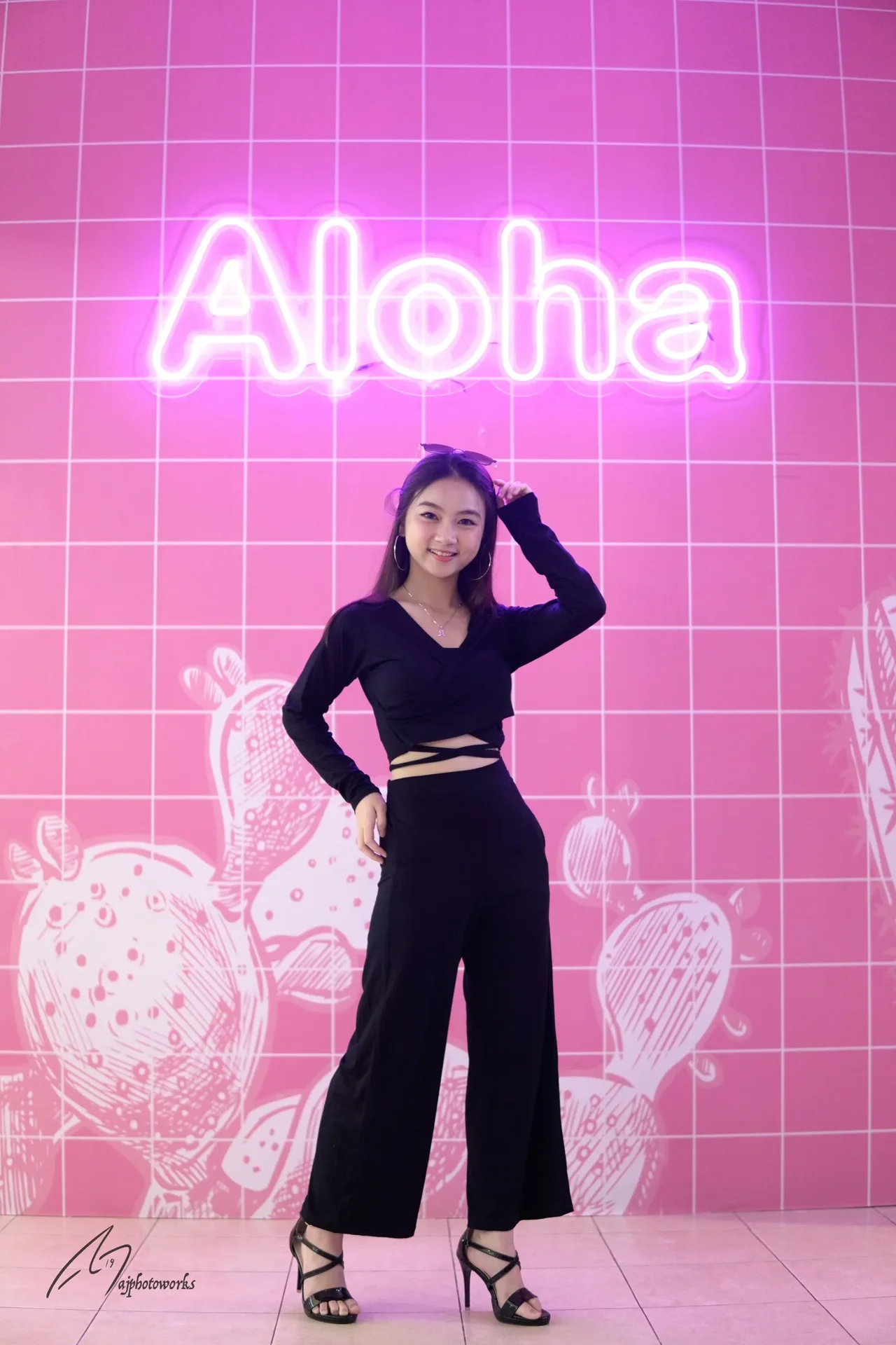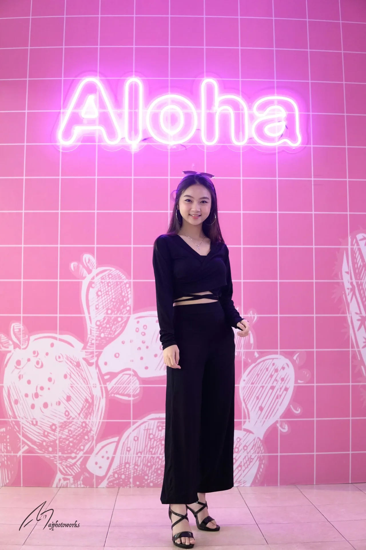Vibrant pink neon 'Aloha' greets a model in a bold black ensemble, creating a dynamic fusion of modern fashion and playful whimsy.