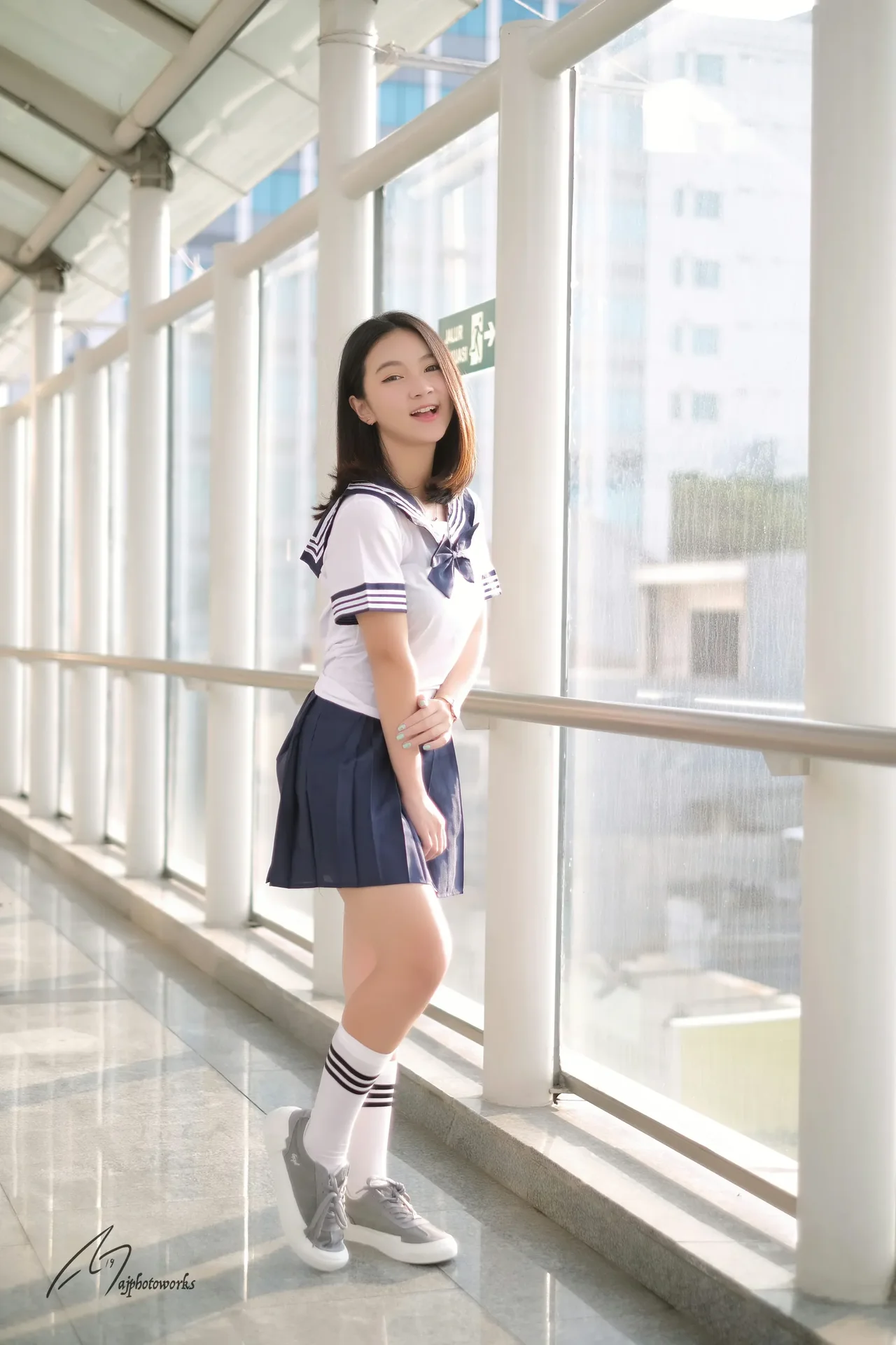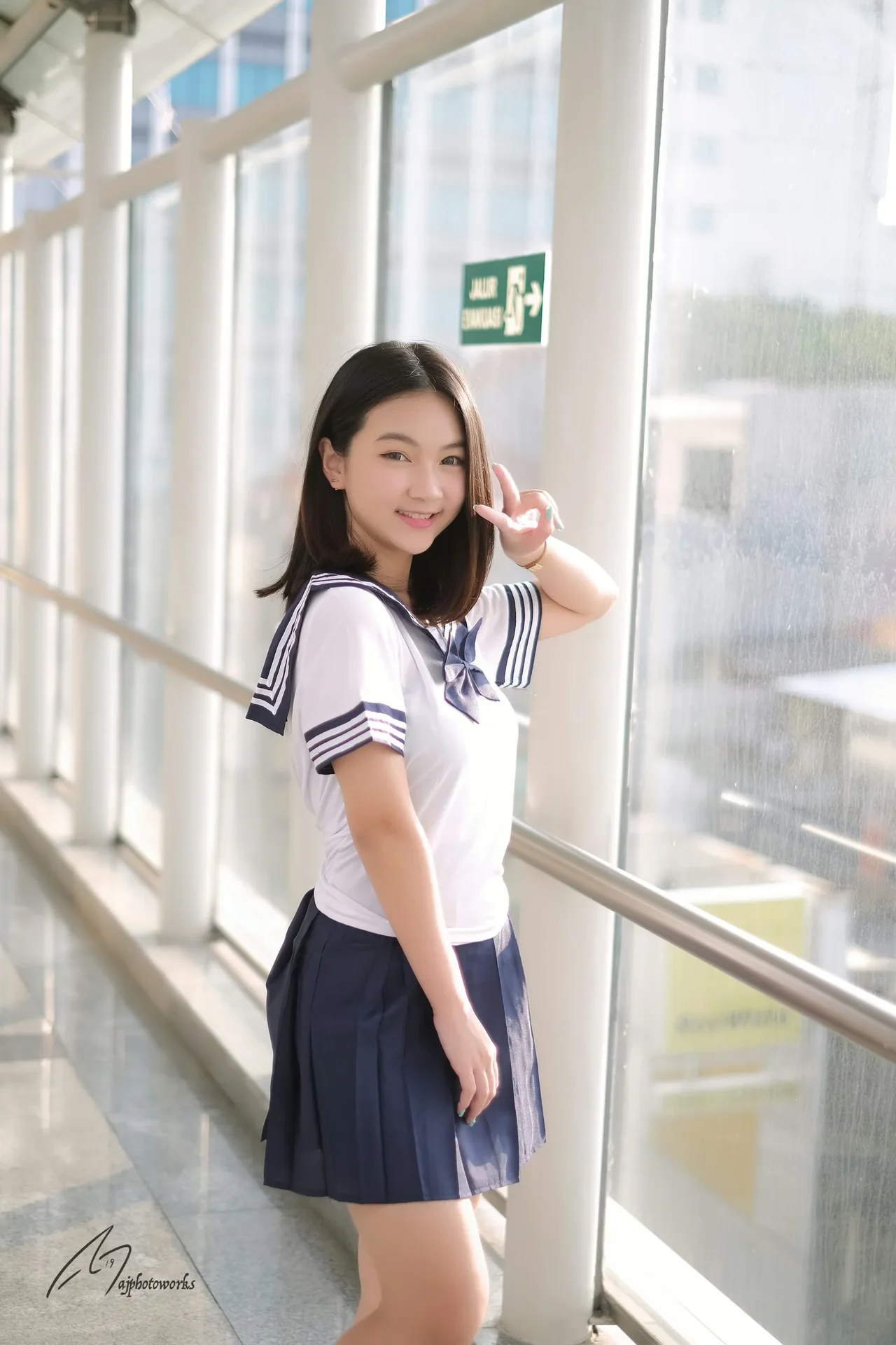 A vibrant portrait of youthful elegance in a modern urban corridor.
