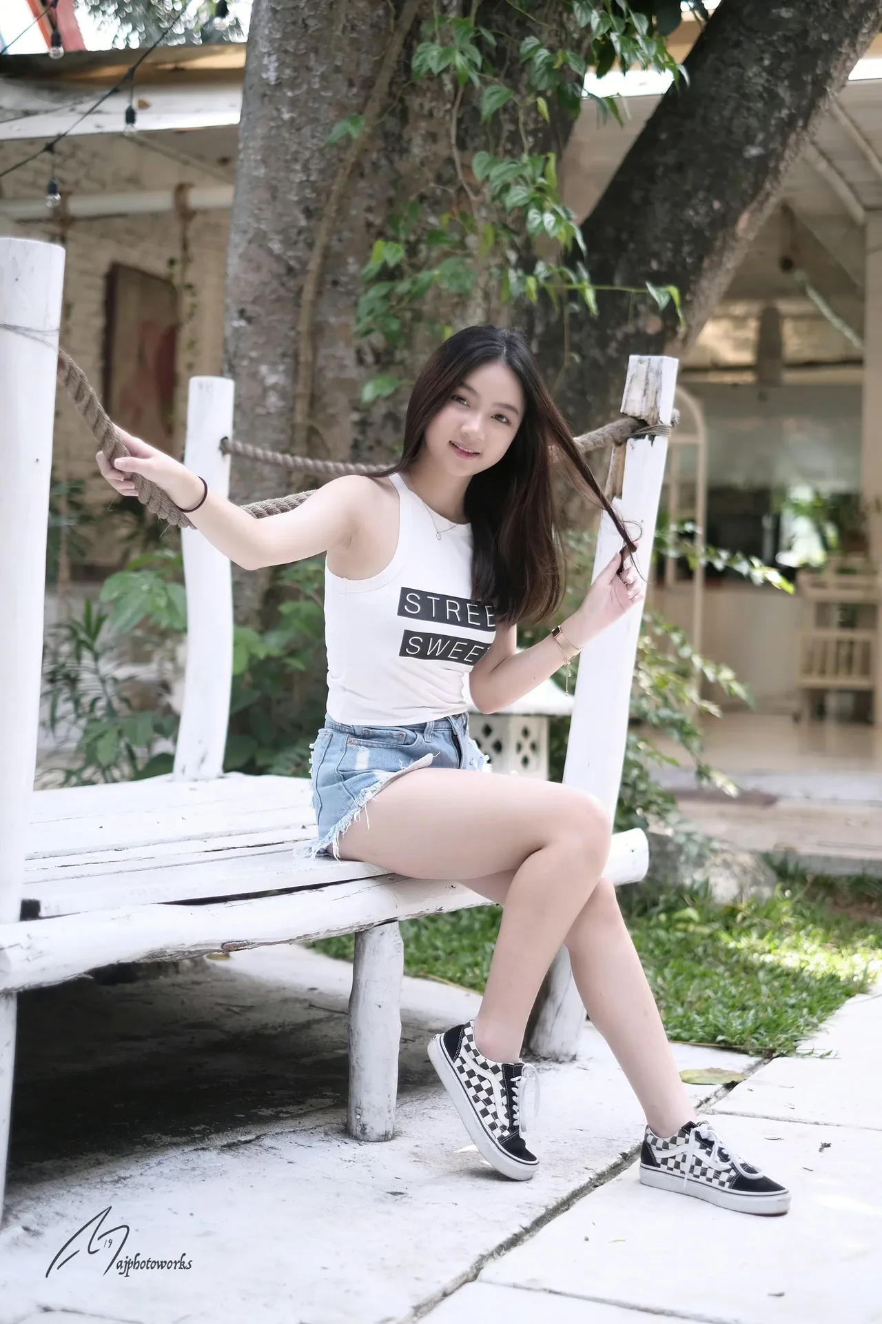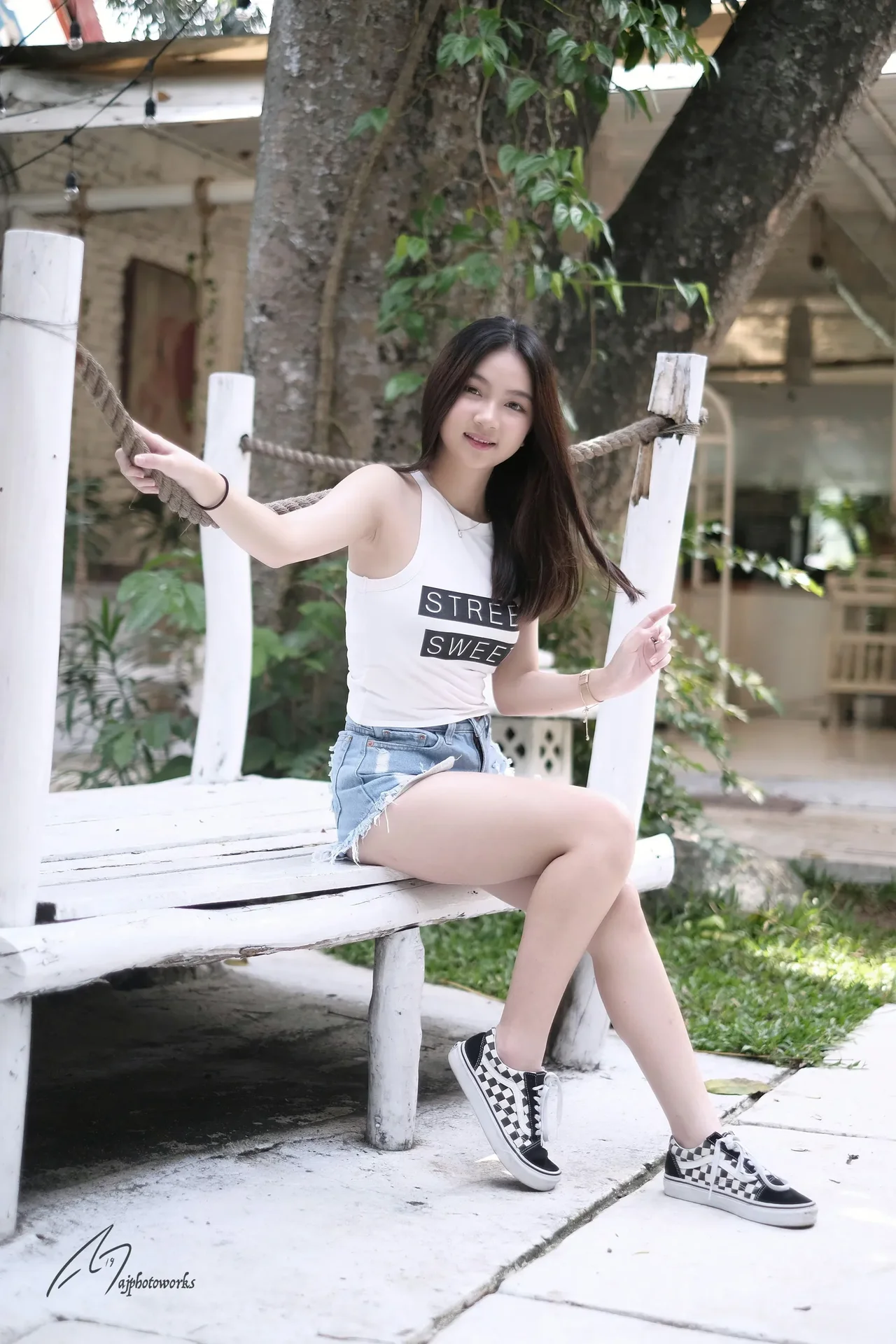 Motion meets casual elegance, with checkered knees and denim dreams under sunlit skies.