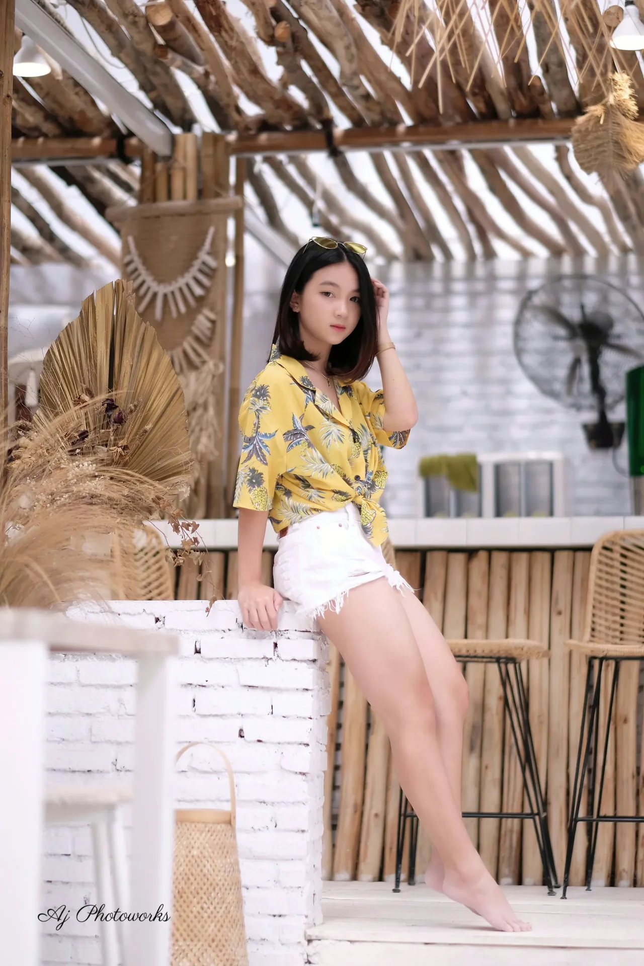 A captivating portrait of modern elegance set against a rustic backdrop, blending contemporary style with tropical charm.