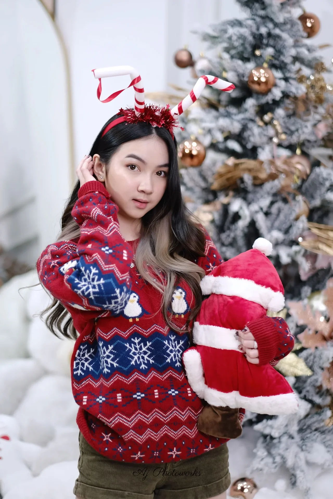 A joyful Christmas celebration captured with festive attire, whimsical accessories, and a warm, cozy ambiance.