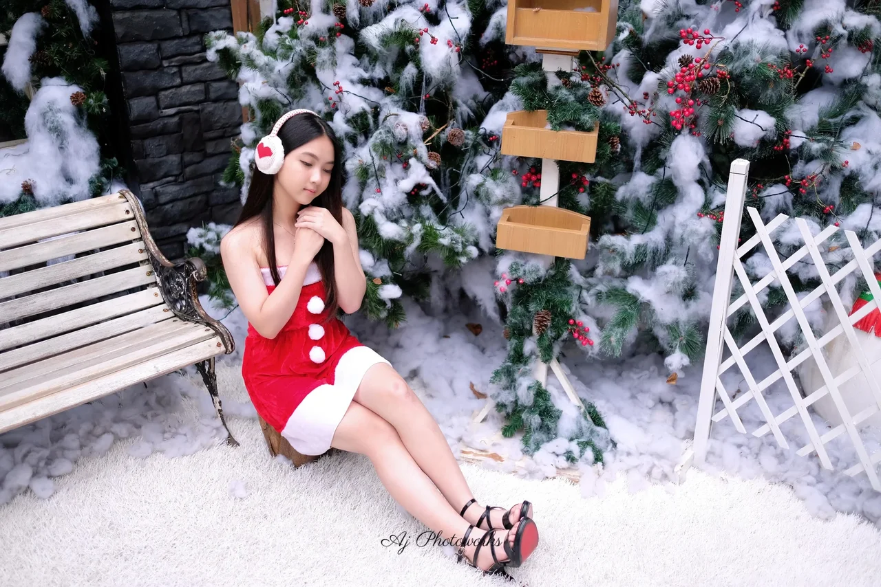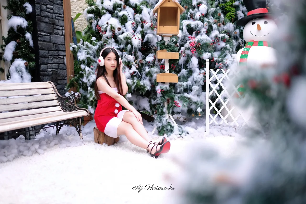 A winter wonderland scene with festive cheer, combining holiday spirit and modern fashion in a serene snowy setting.
