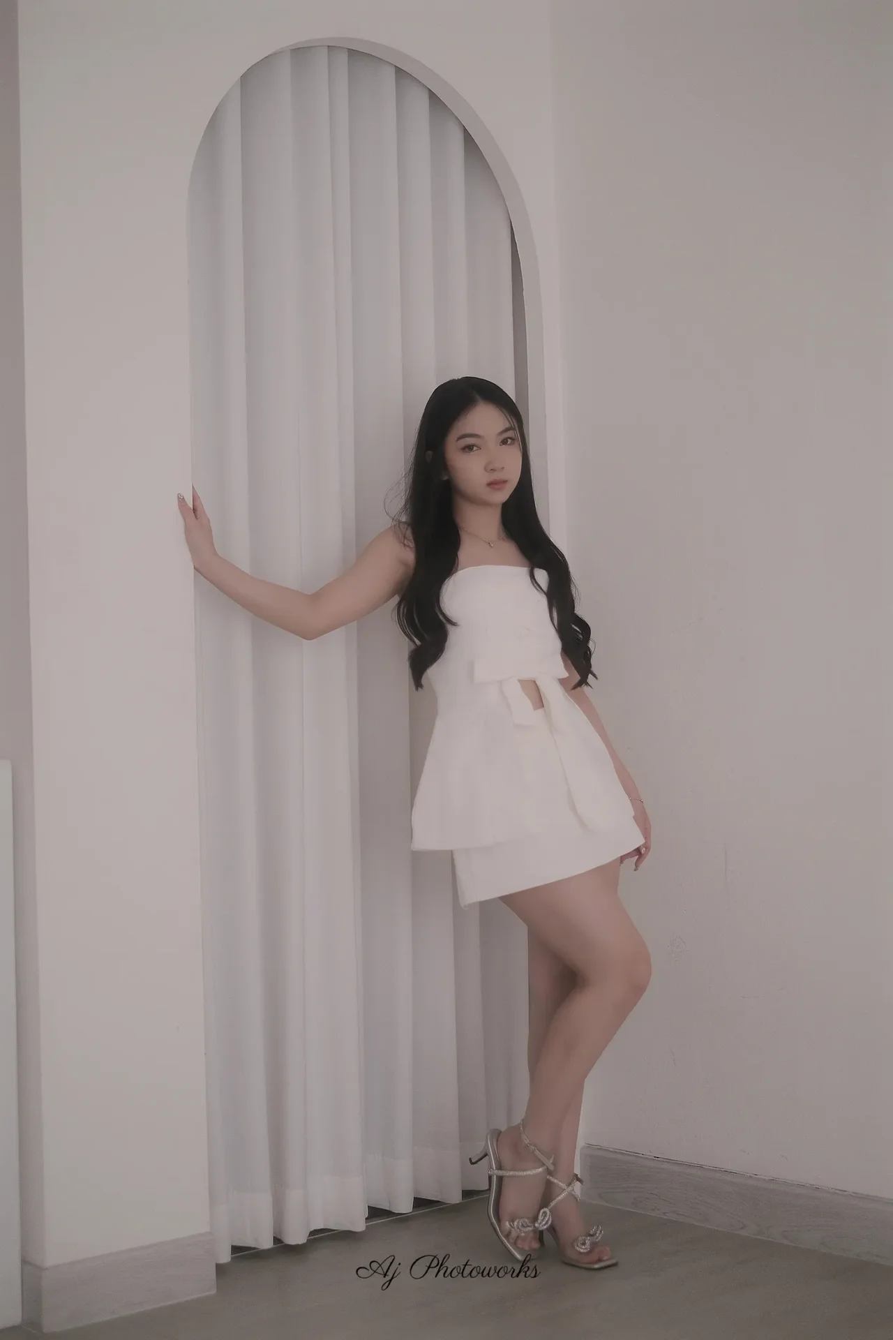 Elegance in minimalist chic: a timeless white strapless dress, accented with gold heels and understated accessories, captured in a serene, curated space.
