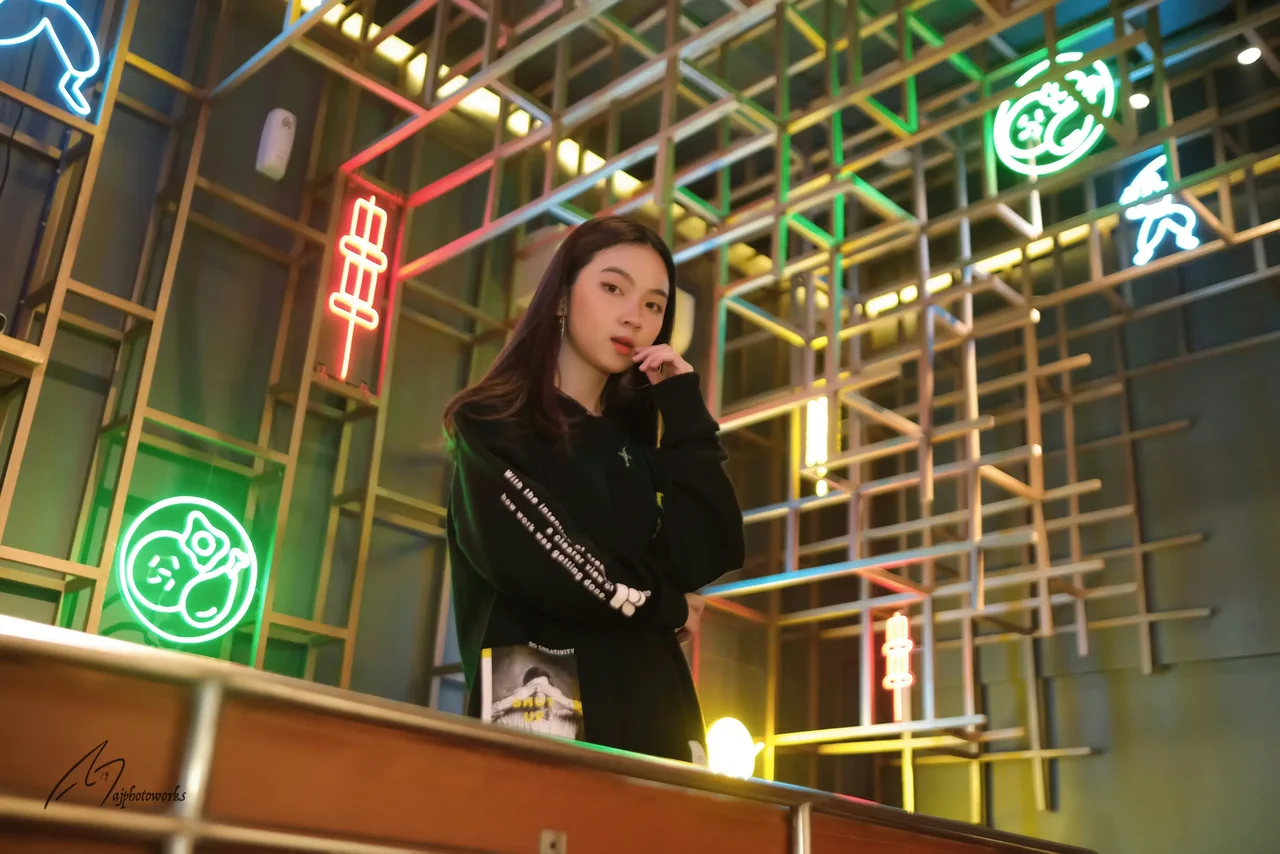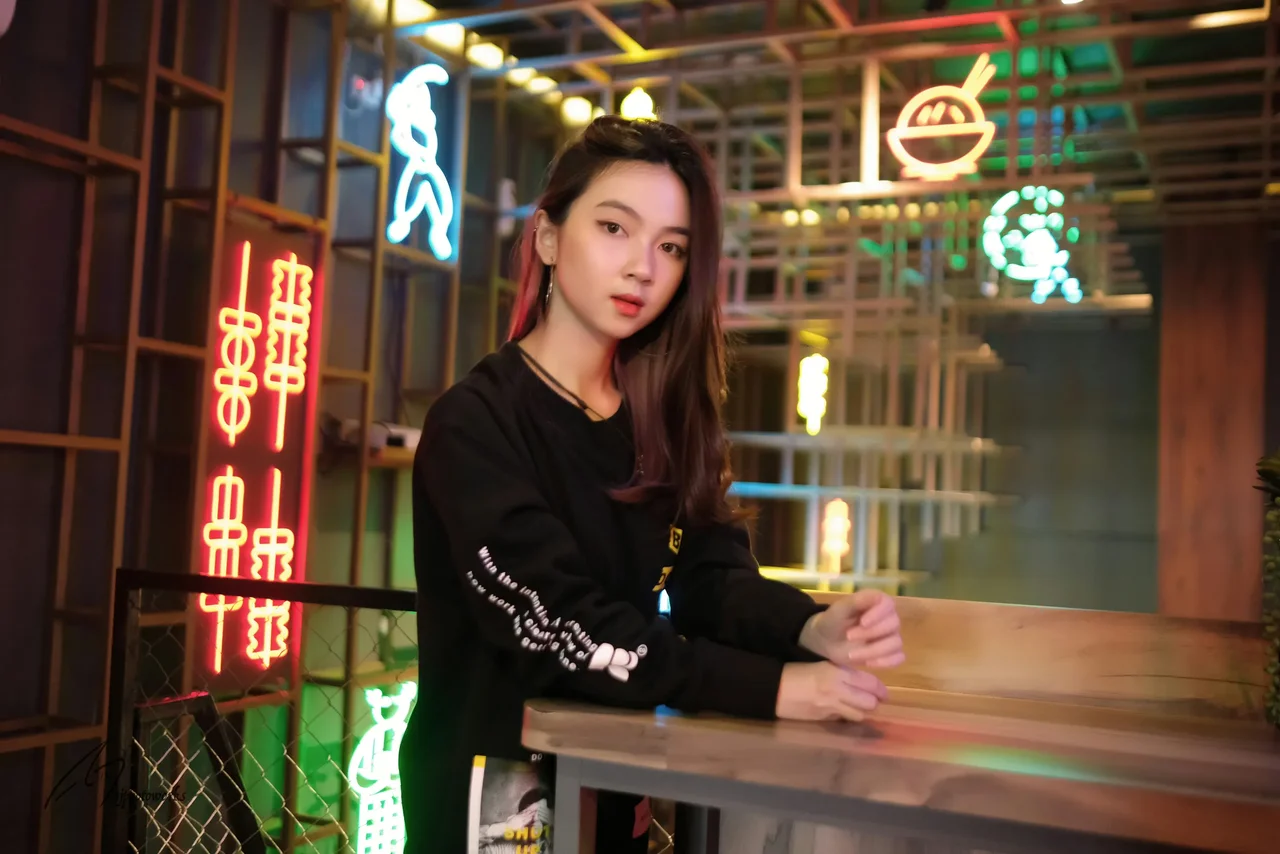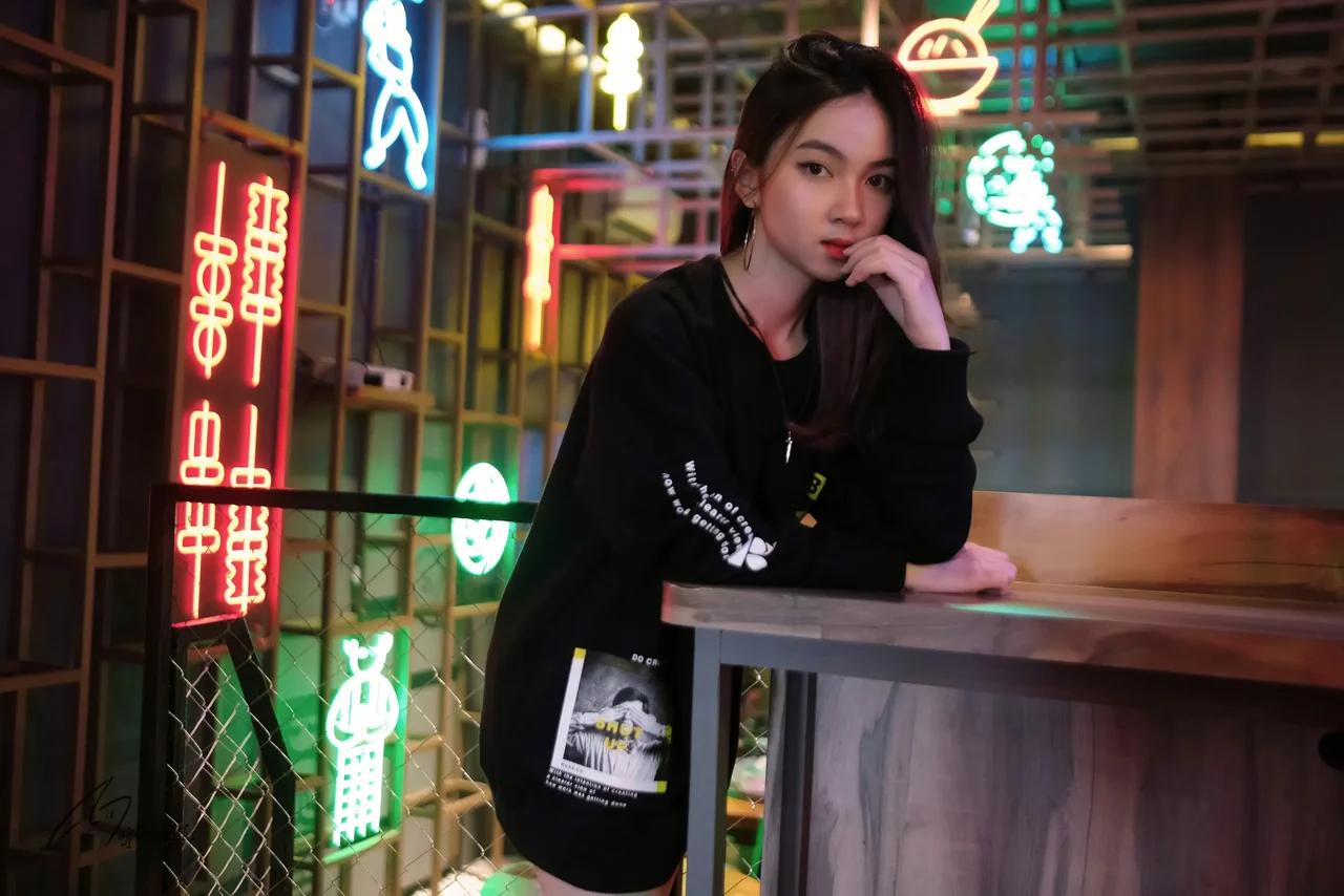 A young woman exudes modern elegance in a vibrant neon-lit bar, her chic black ensemble and attention to detail blending with the lively, artistic environment.