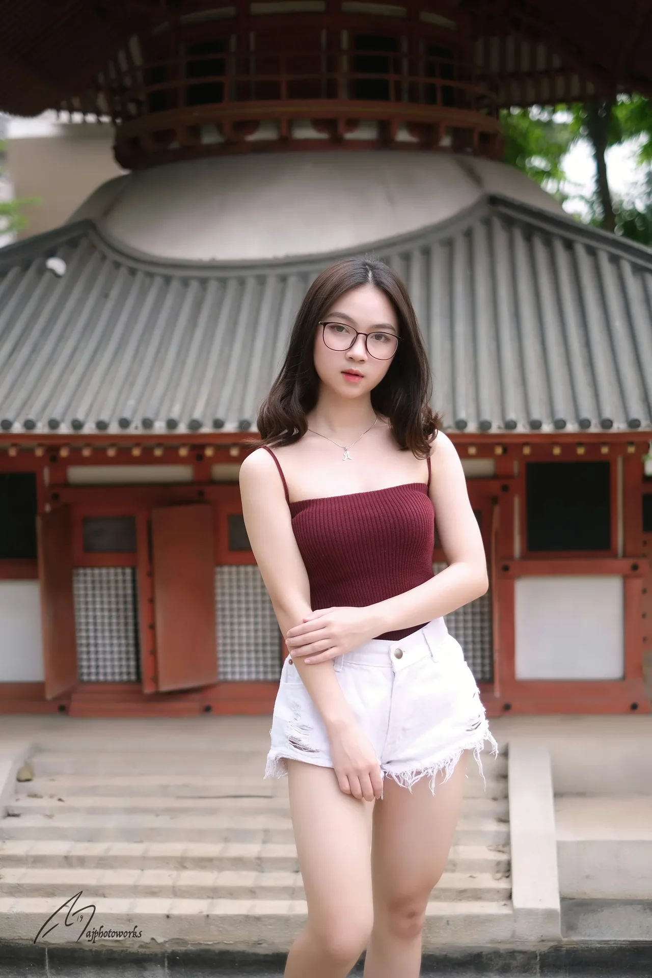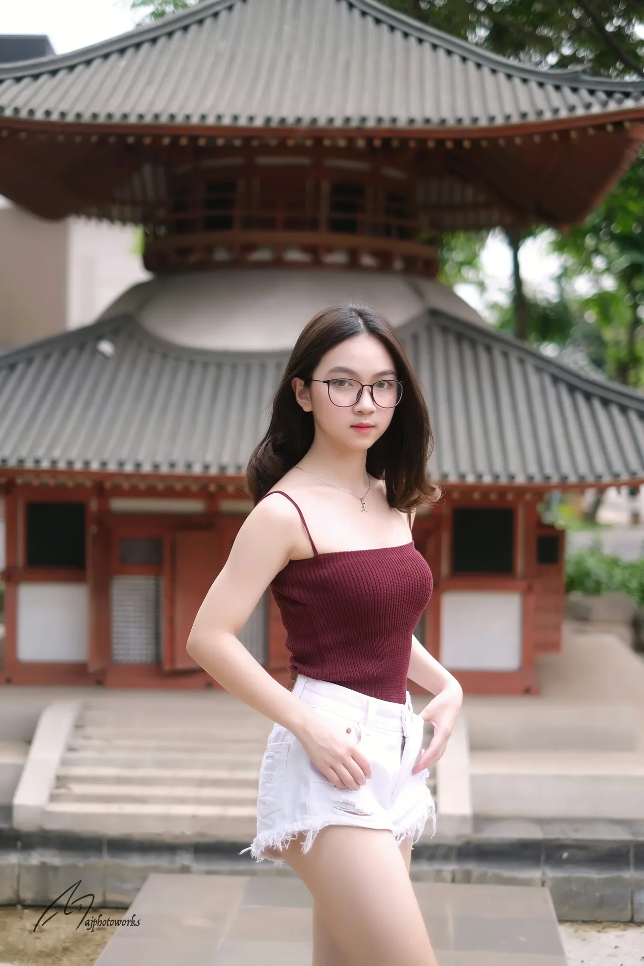 A vibrant portrait blending modernity and tradition, with a young woman in stylish attire set against the backdrop of a historic East Asian temple.