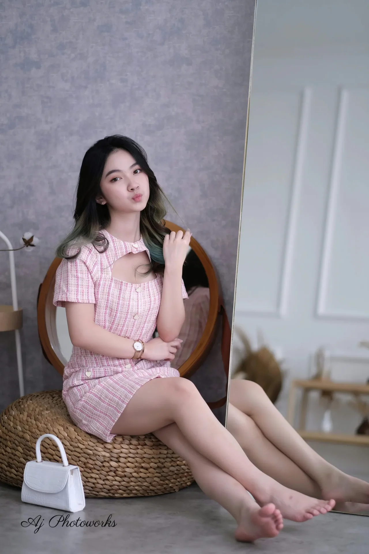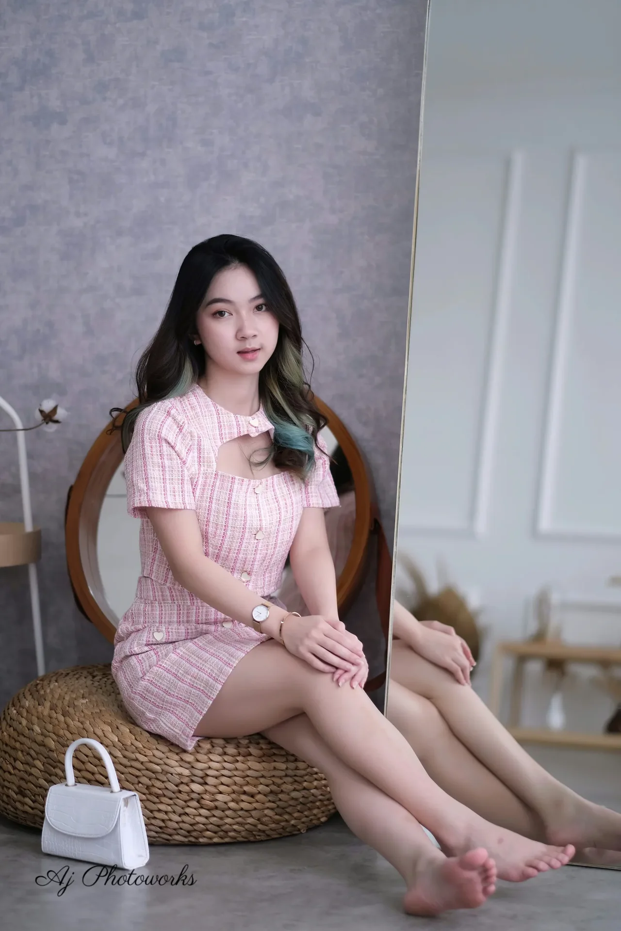 A minimalist fashion portrait featuring a pink and white plaid dress on a soft-toned backdrop with subtle blue hair accents.