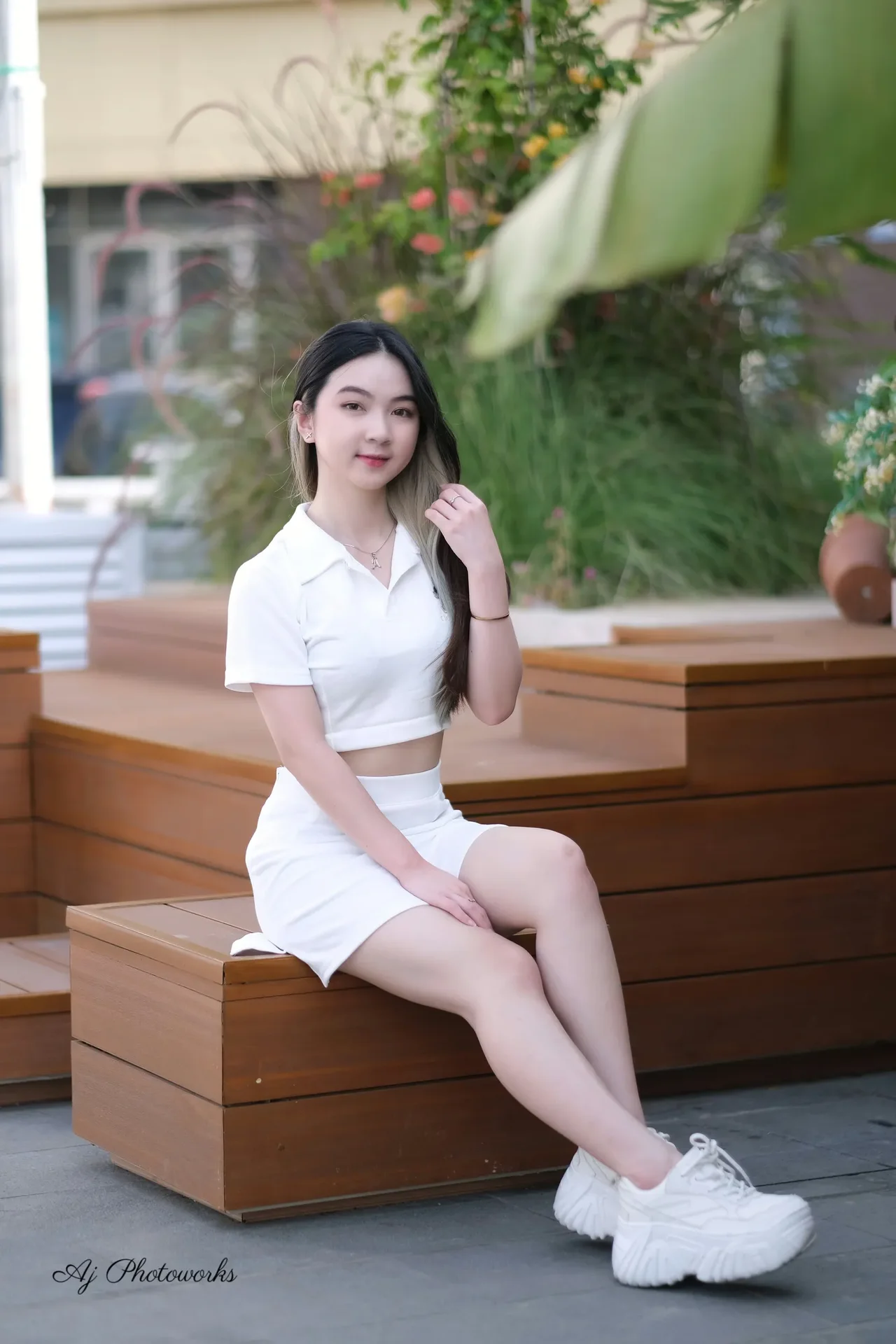 Elegance meets urban vibrancy in a series of fashion-forward, portrait-style shots featuring a confident Asian model in chic white ensembles.
