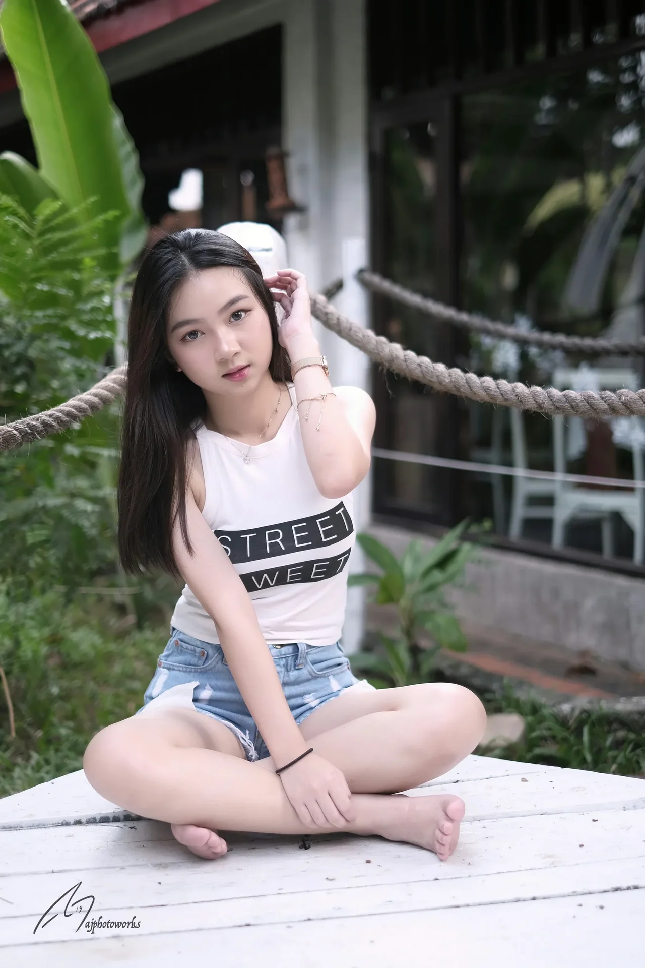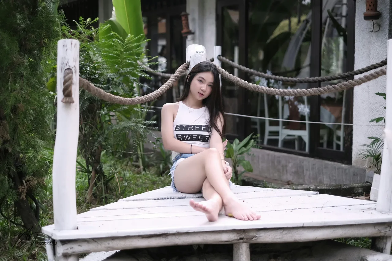 A young woman enjoys a relaxed moment on a white wooden dock surrounded by lush greenery, blending urban and natural elements in a chic, candid setting.