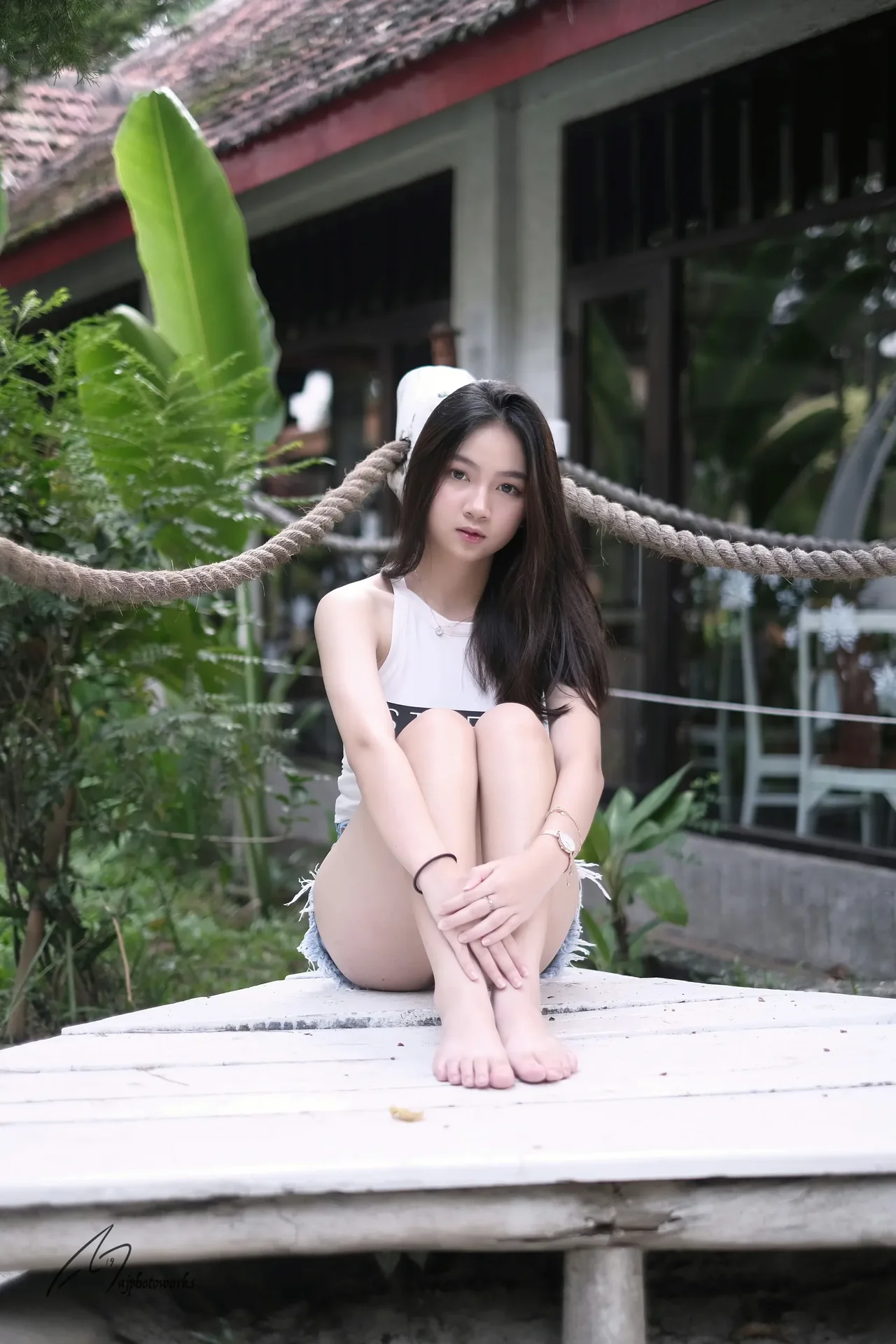 A serene portrait of a young woman in a white sleeveless top and fringed denim shorts, surrounded by tropical foliage and wooden textures.