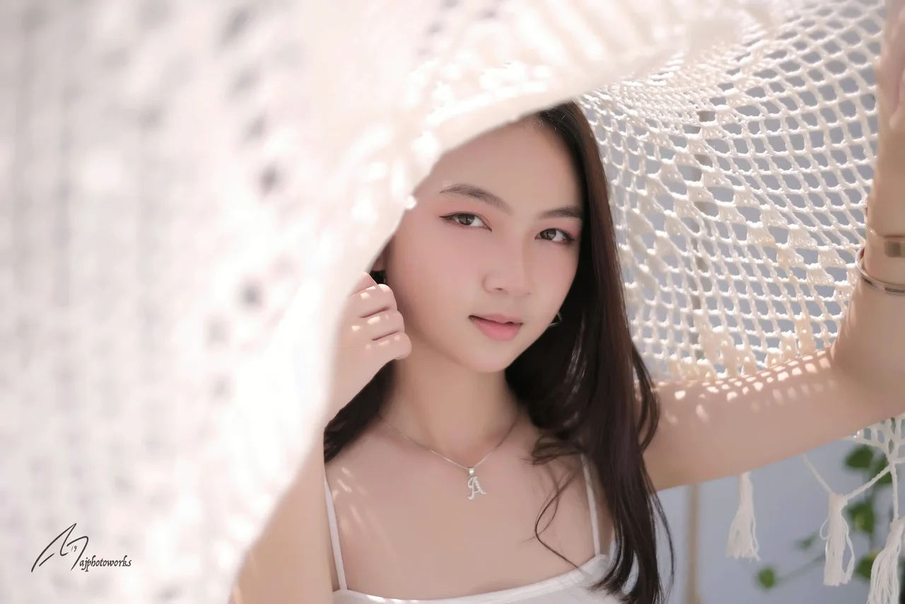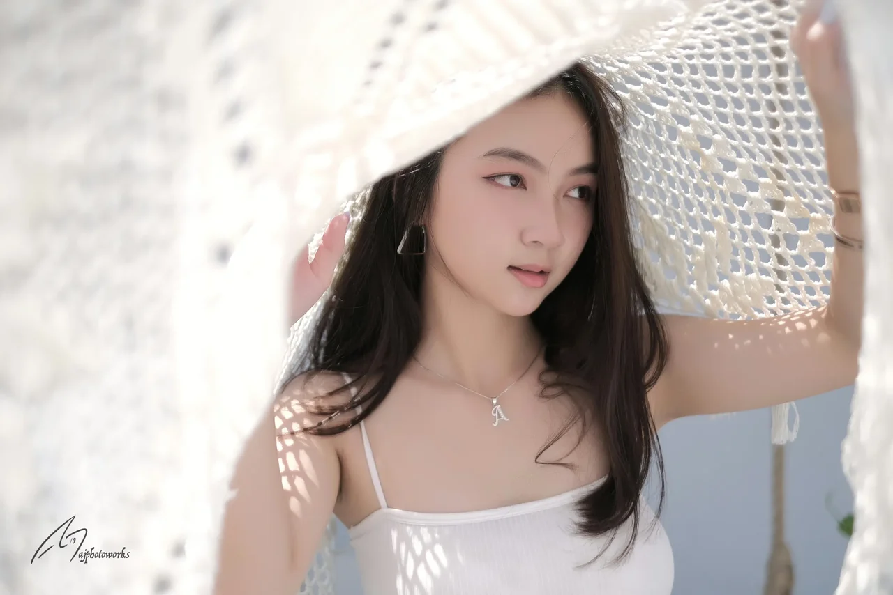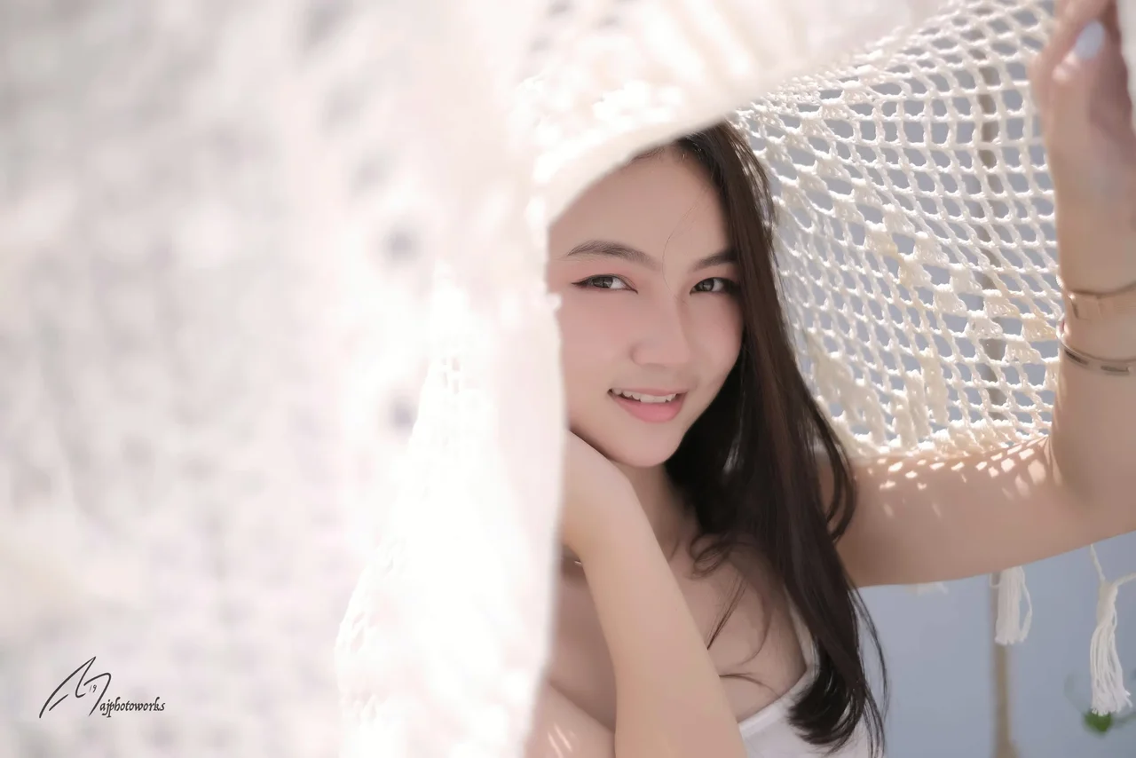 Elegant woman resting in a lace-lined hammock, wearing a delicate strappy dress and minimalist jewelry, bathed in warm ambient light with soft shadows.