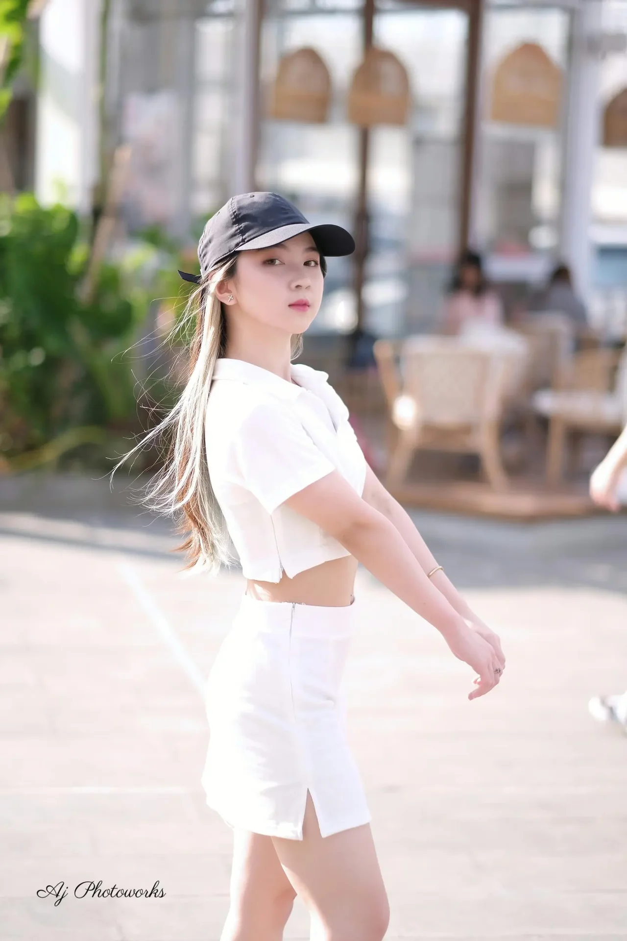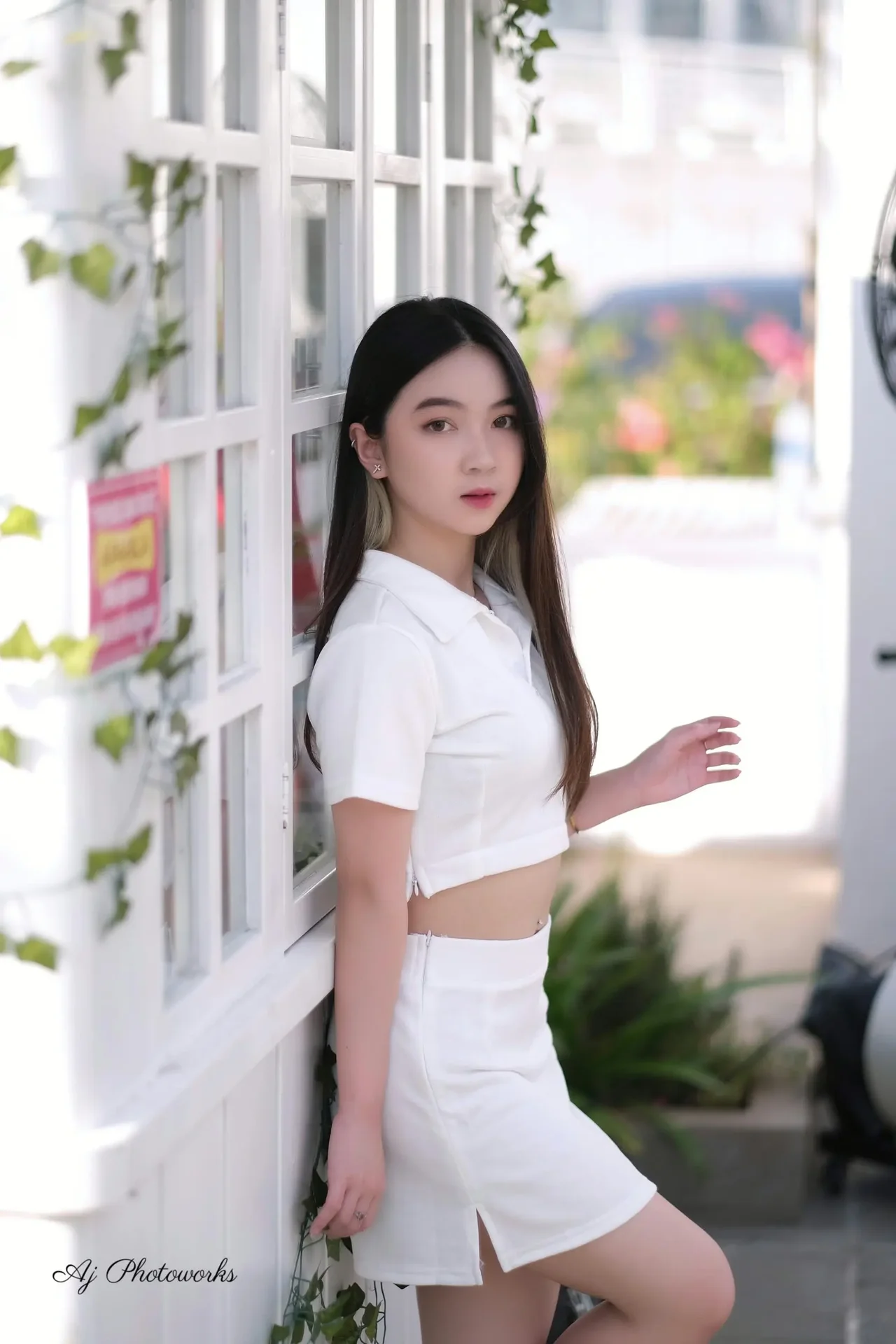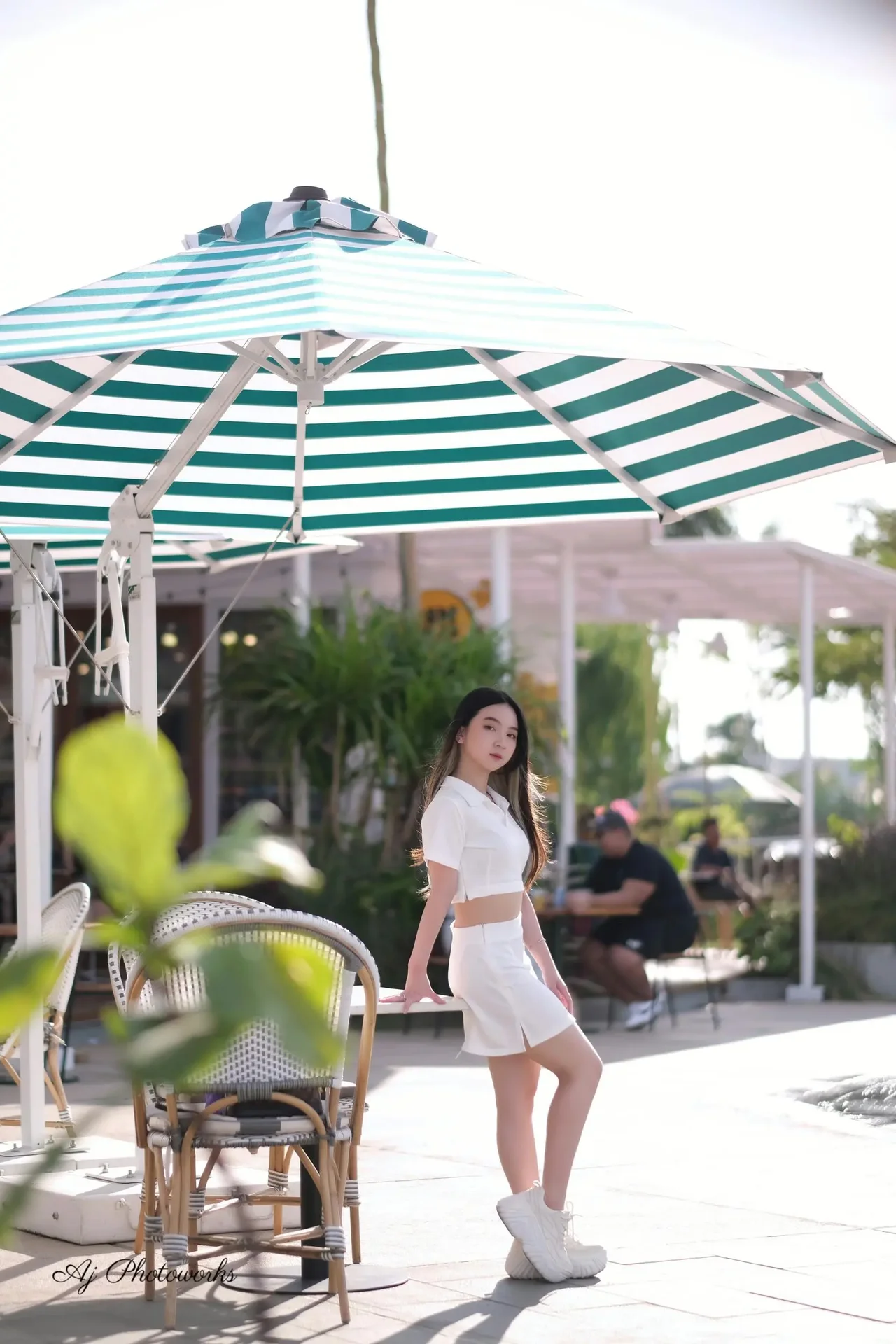 A young woman poses effortlessly in a chic white outfit, blending modern fashion with casual elegance across vibrant outdoor settings.