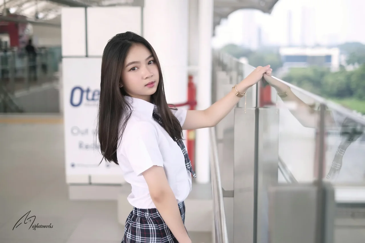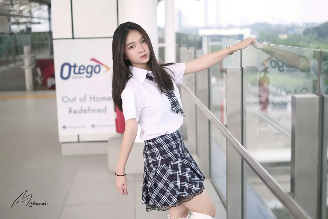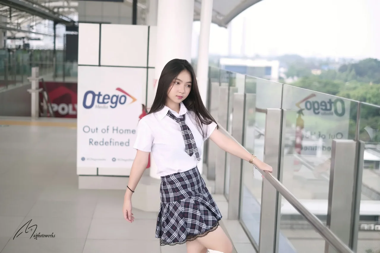 A modern fashion portrait of a confident young woman in a school-inspired outfit, blending urban commercial elements with soft daylight.
