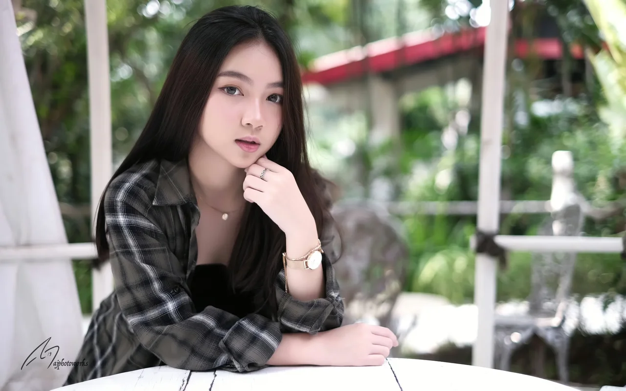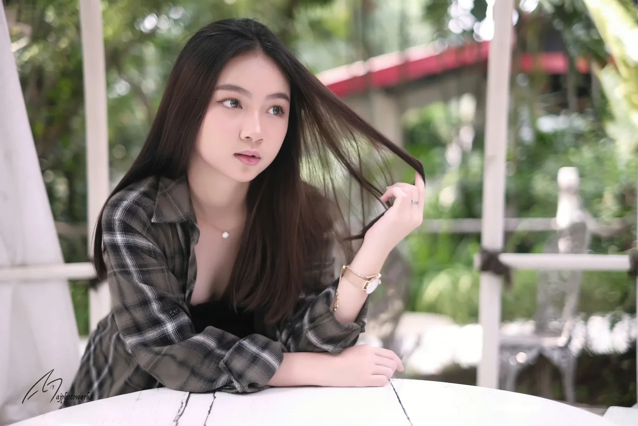 In the garden's embrace, a moment of quiet reflection unfolds—where fabric meets foliage and light weaves stories into shadow.
