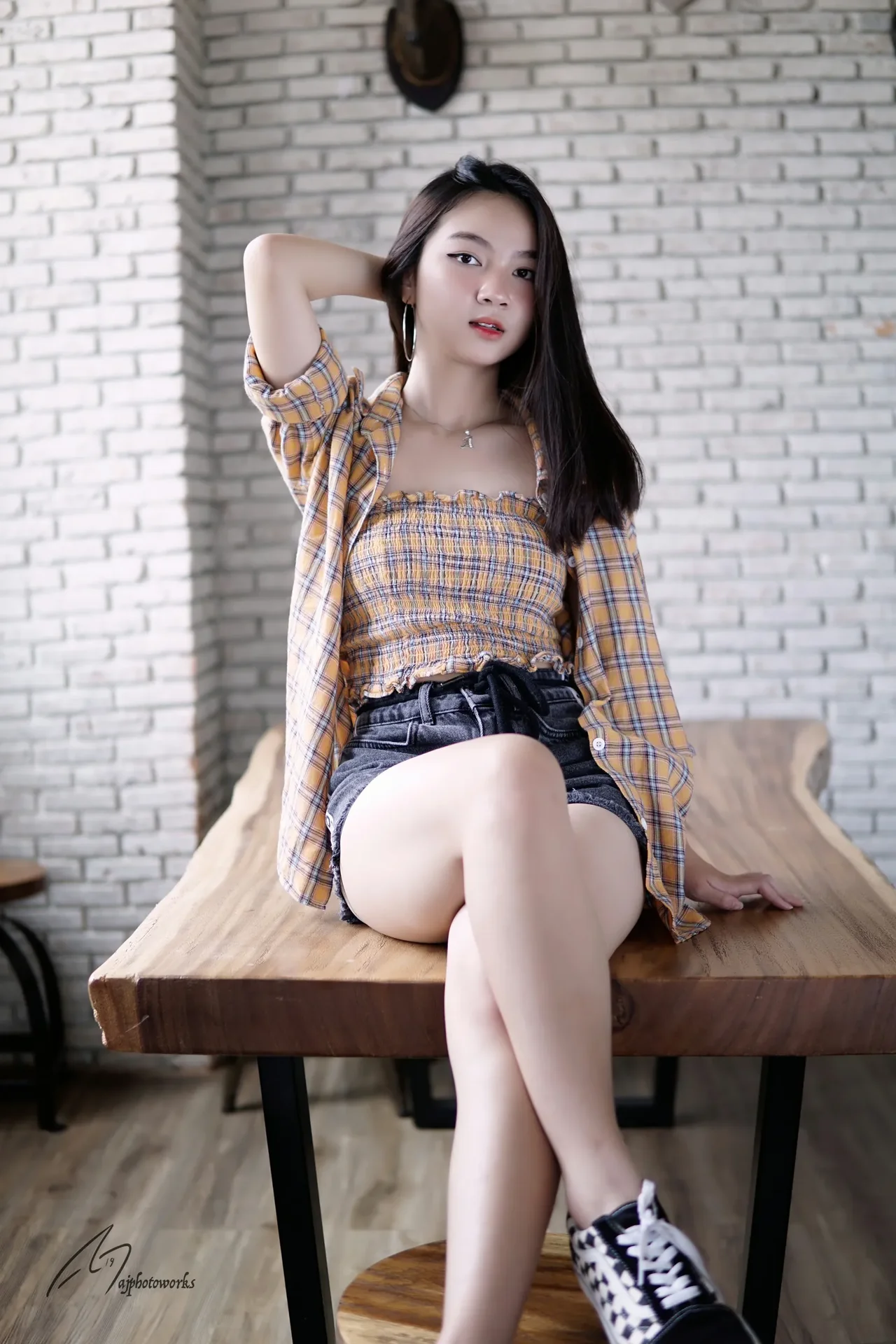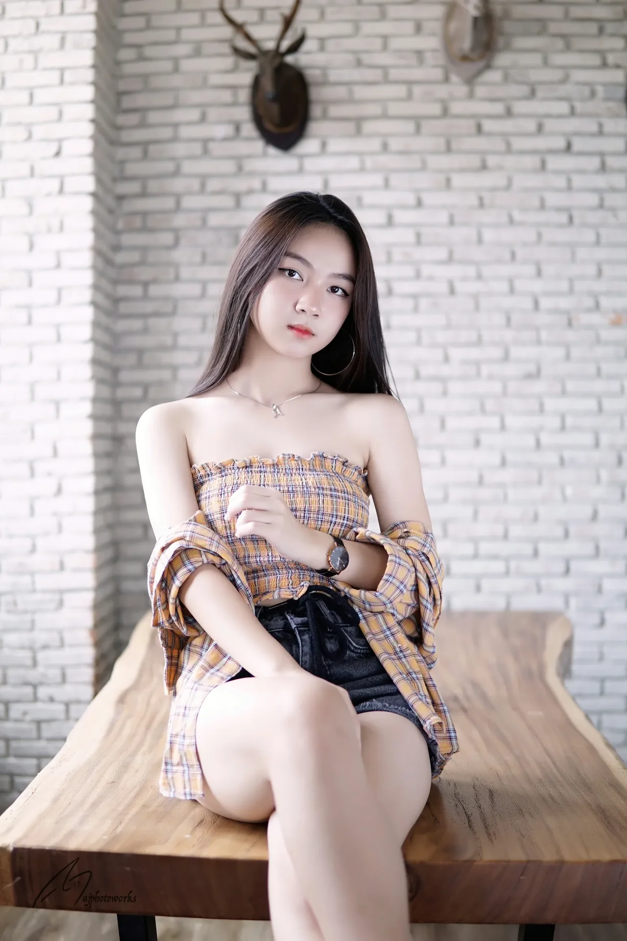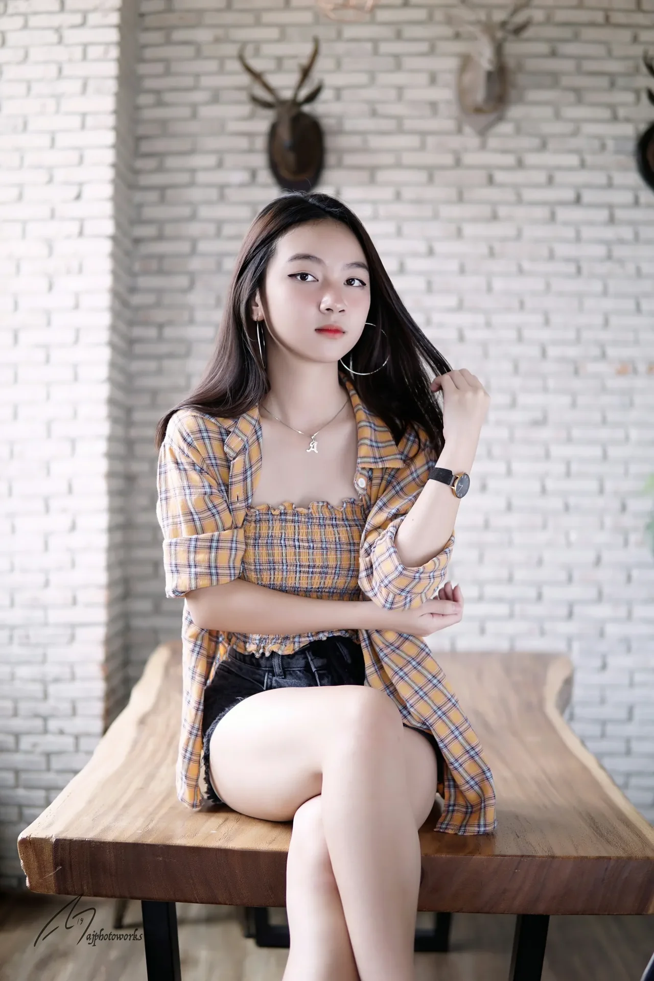 A stylized portrait of a young woman in a plaid outfit with denim shorts, accessorized with hoop earrings and a watch, seated on a wooden table against a rustic brick wall backdrop with deer head decor.